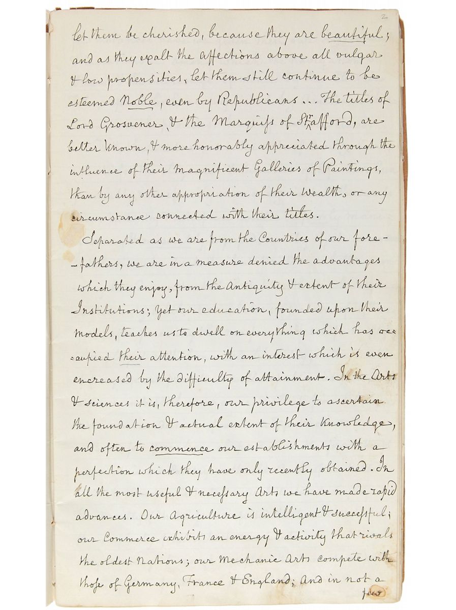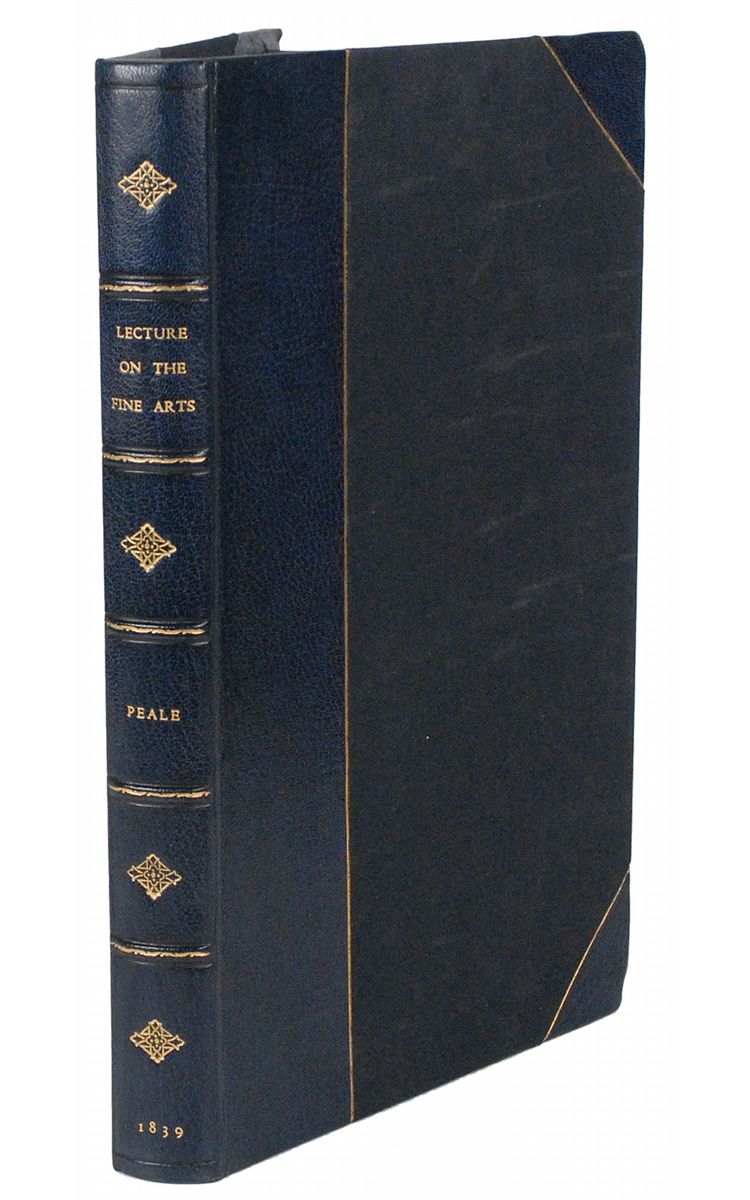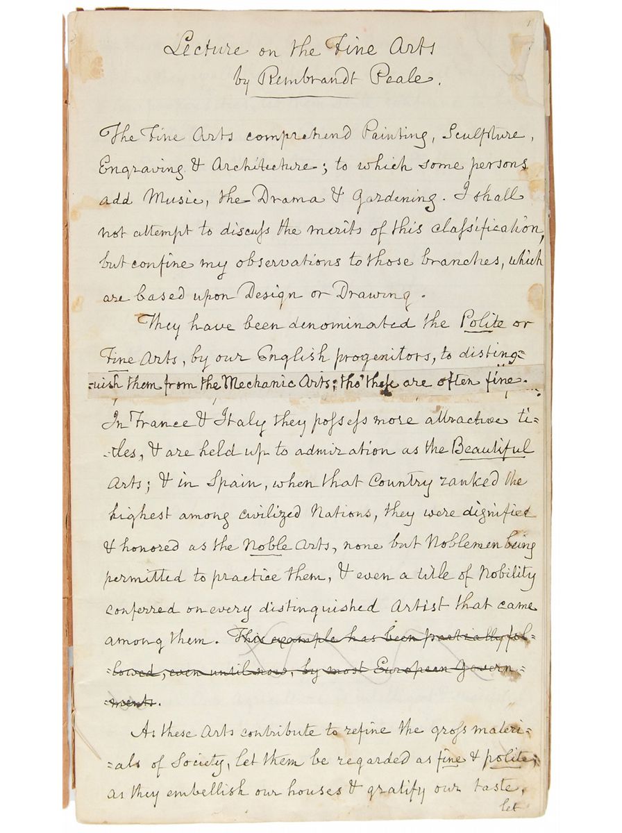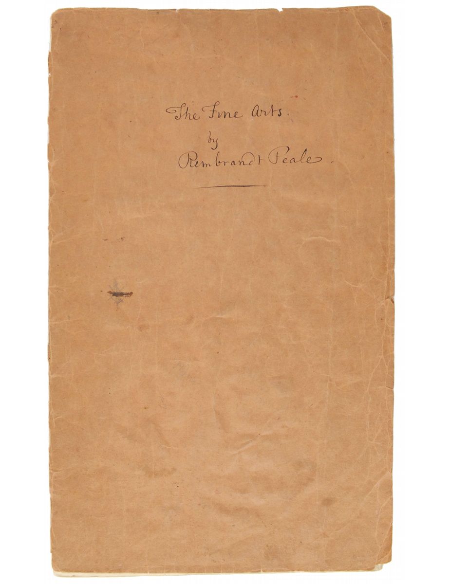 Renowned American painter (1778–1860) regarded as one of the finest portrait artists of his day, most famous for his paintings of George Washington and Thomas Jefferson. Fantastic AMS, signed and titled on the front cover, “The Fine Arts, by Rembrandt Peale,” 38 pages, 7.75 x 12.75, no date but circa 1839. Peale’s draft for a lecture to be given on the fine arts, consisting of 27 pages, followed by 11 pages of his notes, again titled and signed at the top of the first page, “Lecture on the Fine Arts by Rembrandt Peale.” In part: “The Fine Arts comprehend Painting, Sculpture, Engraving & Architecture; to which some persons add Music, the Drama & Gardening…A taste for architecture has been rapidly spreading in our country; & Latrobe’s Capitol, now being enlarged to an Imperial grandeur; Walter’s exquisite Girard College, and numerous examples of Gothic architecture, are differing principles of the purest taste, enslaved to no exclusive system, but leaving to architecture the same liberty of expression, that is allowed in the variations & Refinements of language…Painting is an art that demands many requirements. The artist must see all forms accurately in their boundaries and proportions, and be able readily to transfer them to his canvas. He must understand the laws which regulate their lights, shadows & reflexions [sic], and must learn to compound his tints with skill from the crude materials of his palette.” Throughout, Peale has amended the text by writing on a separate slip and pasting it into the paragraph. The manuscript is loosely bound in its original wraps. Includes an attractive custom-made leatherbound clamshell case. Some scattered creases, toning, and soiling (most significantly to the first page), otherwise fine condition. In addition to being a prominent artist in his own right, Peale was one of its greatest proponents—he played a central role in the development of institutions such as the Pennsylvania Academy of Fine Arts, the National Academy of Design, and the American Academy of Fine Arts. This thoughtfully prepared essay is especially significant, as it is not only a lengthy treatise by Peale but lends great insight into the status of the arts in America during the mid-19th century.