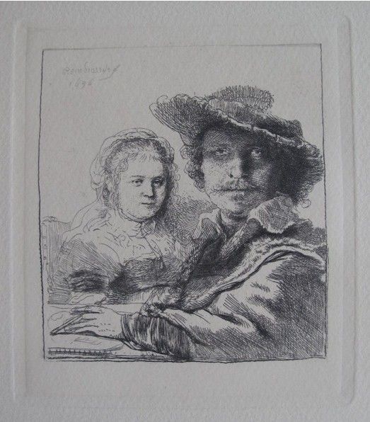 This is a beautiful etching, after Rembrandt, by master engraver Amand Durand. Titled "Self Portrait with Saskia" (year of original 1636). Signed in the plate. Measurements: image size is 4" x 3.5" on 11" x 10" Somerset paper. Comes with a certificate of authenticity. Ref. #19 according to the British Catalogue, circa 1797, is a hand pulled-ETCHING from the AUTHENTIC & Original copper Rembrandt plates by Armand-Durand (1831-1905) overseen by Art World Industries, inc. This piece is in excellent condition, and has never been framed.