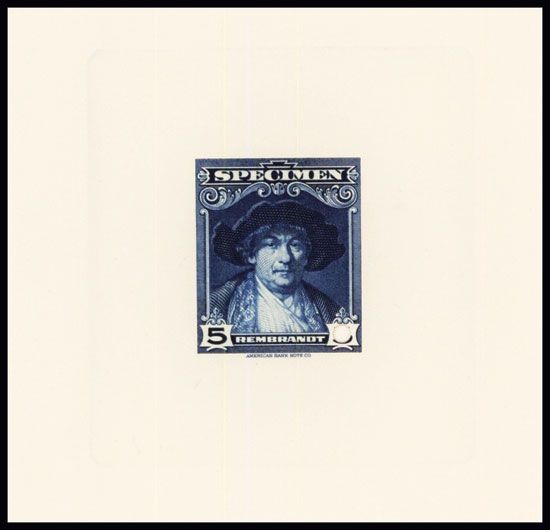 ND (ca.1900-1950), 5 Denomination, Die #P5003 in red top left die sunk on card with security punch in right denomination tablet, Rembrandt portrait centered on stamp, dark blue, POC, Uncirculated condition, ABNC.