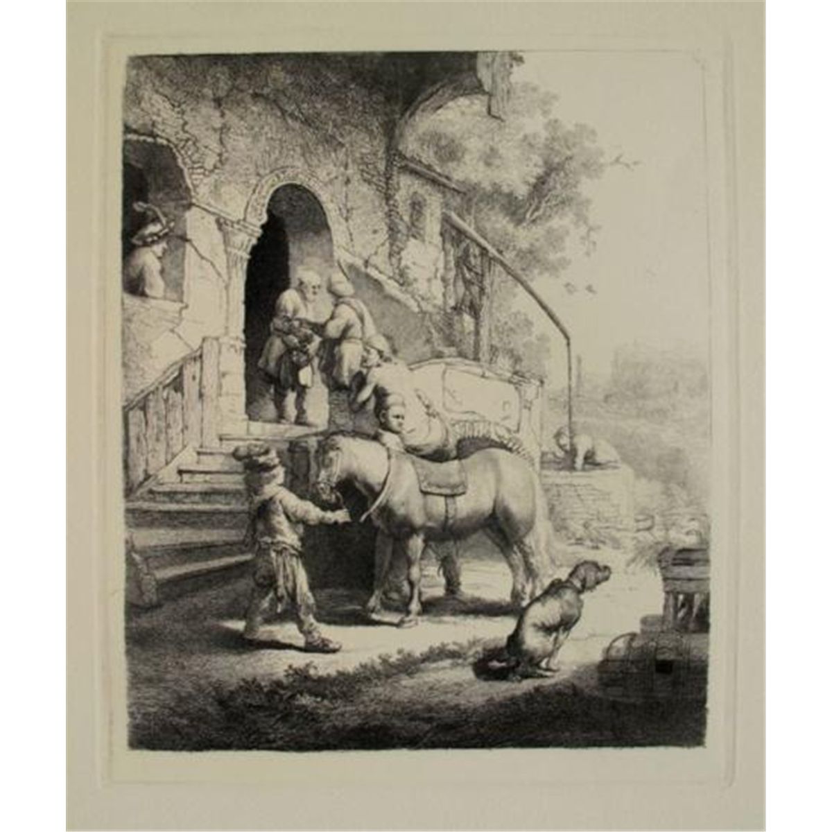 This is a beautiful etching, after Rembrandt, by master engraver Amand Durand. Titled "THE GOOD SAMARITAN" (year of original 1633)Measurements: image size is 9.5" x 8" Paper size is: 19" x 15". Comes with a certificate of authenticity. Ref. #90 according to the British Catalogue, circa 1797, is a hand pulled-ETCHING from the AUTHENTIC & Original copper Rembrandt plates by Armand-Durand (1831-1905) overseen by Art World Industries, inc. This piece is in excellent condition, and has never been framed.Rembrandt was born in 1606 in Leiden , Holland . Before his 30th birthday, the name Rembrandt had become synonymous with artistic excellence. The Dutch master was known worldwide for his highly prized series of classical etchings. These images are known for their delicacy of tone and intricacy of detail. To raise funds in 1657, Rembrandt sold the plates at an auction of his entire estate to a prestigious European family with the expressed stipulation that not even one of the etchings could be printed until a full 100 years had passed after his death. The family faithfully honored the binding agreement. Owing to their great popularity and soft metallurgical consistency, the original plates became worn by the mid 1800's. To save these genius-inspired works, Amand Durand, a master engraver, born in France in 1831, spent the major part of his career exactly duplicating the genius of Rembrandt onto hard, lasting copper plates. Art historians and critics have been stunned by the incredible quality Durand achieved through his own technical genius. Historical references indicate that Armand Durand's amazing skills were well known to expert of the 19th and early 20th centuries. Many esteemed art critics and curators feel that Durand's works not only do great justice to Rembrandt's original concepts but subtly improve on the legendary Dutch master in a technical sense. Amand -Durand was a great admirer of Rembrandt. He desired to study the plates and techniques of this genius. Unfortunately at the time there only remained about 100 known plates, which were available to produce fine quality impressions. For 100 years the bulk of Rembrandt's plates were shrouded in mystery. As time moved on some of Rembrandt's plates began to surface. By this time Rembrandt's plates were miserably worn and dull. Amand-Durand, who by now had made the ranks of a noted engraver, decided to remedy this with his own gifted talents. He researched and intensely studied pieces that were available only in collections. From here on he spent the major part of his life exactly duplicating Rembrandt's images onto copper plates. These recreations were called Amand-Durand's after Rembrandt. Their unbelievable clarity and exactness were achieved because Amand-Durand used as his guide, not the worn and dull plates, but the first and second state etchings of the master's original works. By this time Durand's talent were known to experts of the 19th and 20th centuries. In 1855, Conservator of the Cabinet de Estampes, George Duplessis so appreciated the genius of this man that he had his work published in books which belong to the Bibliotheque Nationale in France. Amand-Durand was used as master etcher in an anthology of European engravings, which became so valuable that they were kept under locked scrutiny in most libraries. What we have is a noted master duplicating a master some 200 years later. Soon after Amand-Durand's death in 1905, his original copper plates were obtained by the prestigious French book publishing family, DOMINIQUE VINCENT et Cie. They mainly published the work for book illustrations to the Bibliotheque Nationale and the Louvre Museum as beautiful exact duplications of Rembrandt's etchings. Sporadically they sold to private parties interested in this unique creation. It was this reproducing that caused hushed rumor that spread throughout the entire art world. It was discreetly rumored among noted art circles, that in the early 1900's numerous Amand Durand after Rembrandt etchings found their way into famous collections much to the dismay of many. This was the rumor until 1985. An American art dealer doing research on the availability of Rembrandt etchings came across some so questionably perfect that he decided to research even further. Fierce studying proved that these were in fact Amand-Durand etchings that had been rumored and gossiped about for so many years. Completely aware of what information he and come across and the problems that developed when they were placed in the wrong hands, he resolved to locate the original copper plates. This took quite some time. However with unbelievable resourcefulness he was able to locate the Dominique Vincent family who had been completely unaware of the stories that were inadvertently created with these prints. The Bibliotheque Nationale and the Louvre Museum in Paris had been acquiring these etchings to allow the French to see the unimaginable story behind them. The American dealer purchased all 348 original copper plates. This allowed the American public to also see this unimaginable story of how a noted artisan through his talent and dedication for the great master Rembrandt, created effects of such quality that the repercussions were felt throughout the entire art world for many, many years. Over a century after Amand-Durand painstakingly recreated Rembrandt's etching, the benefits of his devotion to quality and beauty are again felt throughout the art world. The piece was made from the re-worked original copper plate by Amand Durand in the late 1800s. It is absolutely beautiful!