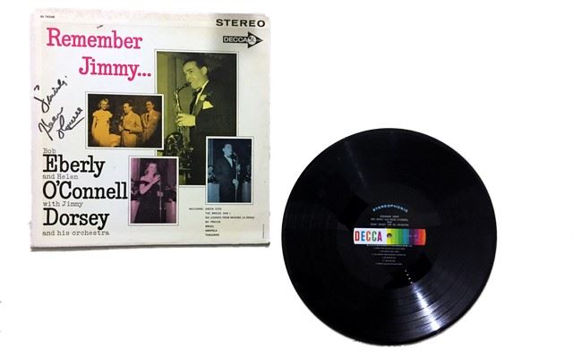 Bob Elberly, Helen O'Connell, and Jimmy Dorsey with his orchestra (1962) vinyl record, "Remember Jimmy..." 12 songs between the 2 sides of the record include "The Breeze and I"; "My Prayer"; "I understand"; etc., autographed by Helen O' Connel on the front cover, cover shows a collage of 4 photos of Bob Eberly, Helen O' Connell and Jimmy Dorsey performing live on stage.