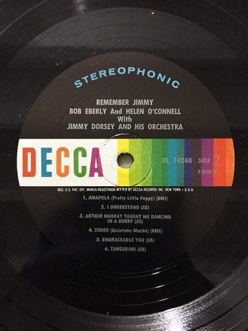 Bob Elberly, Helen O'Connell, and Jimmy Dorsey with his orchestra (1962) vinyl record, "Remember Jimmy..." 12 songs between the 2 sides of the record include "The Breeze and I"; "My Prayer"; "I understand"; etc., autographed by Helen O' Connel on the front cover, cover shows a collage of 4 photos of Bob Eberly, Helen O' Connell and Jimmy Dorsey performing live on stage.