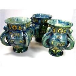 'Remember Me As I Doe Thee', three four handled blue mugs, the baluster shapes with raised yellow lettering above pink and yellow flowers, the handles with scrolling upper terminals, incised 'No.202' and sprig marks, 13.5cm high (W) (3) £150-250