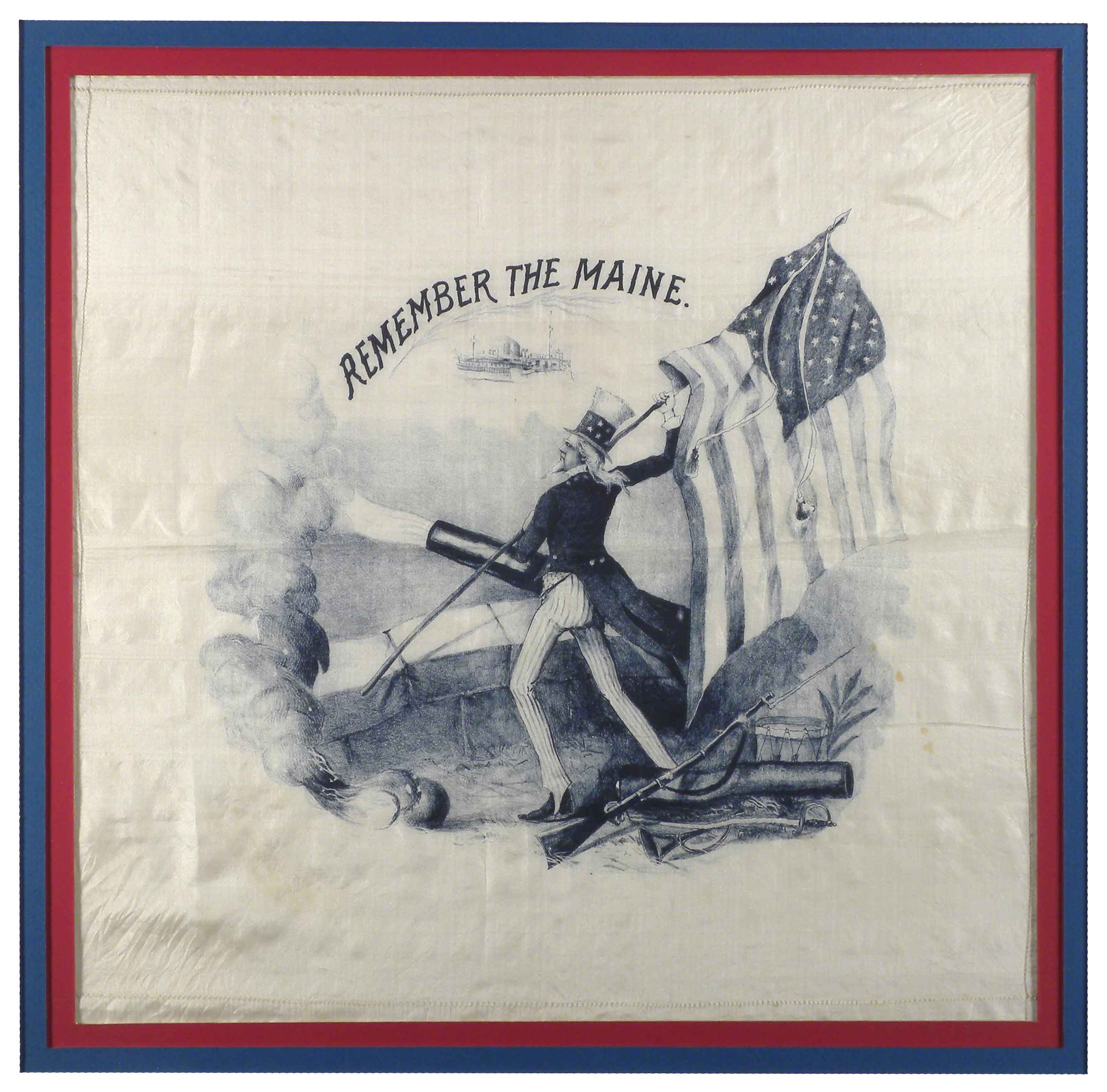 Remember the Maine Silk Pillow Cover. Depicting Uncle Sam with the battleship in the back ground. Excellent condition. Aprox 16 inches square.