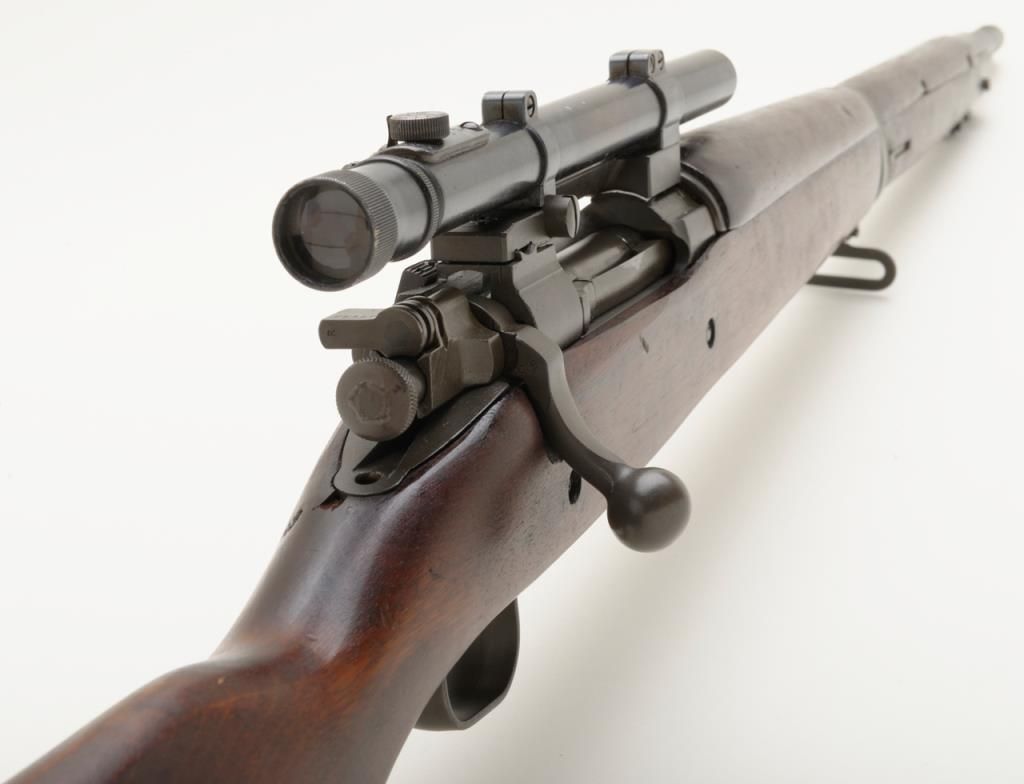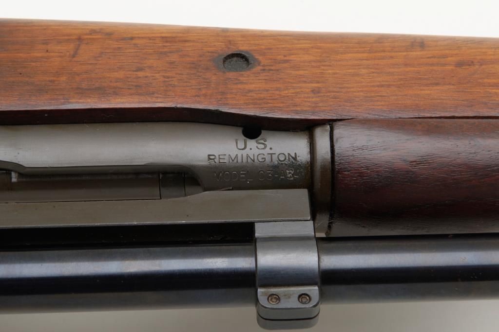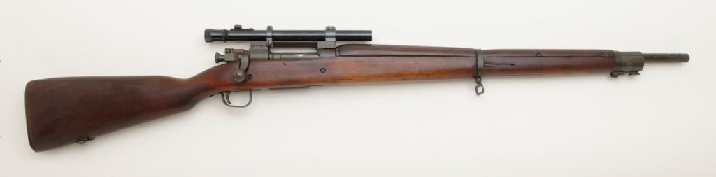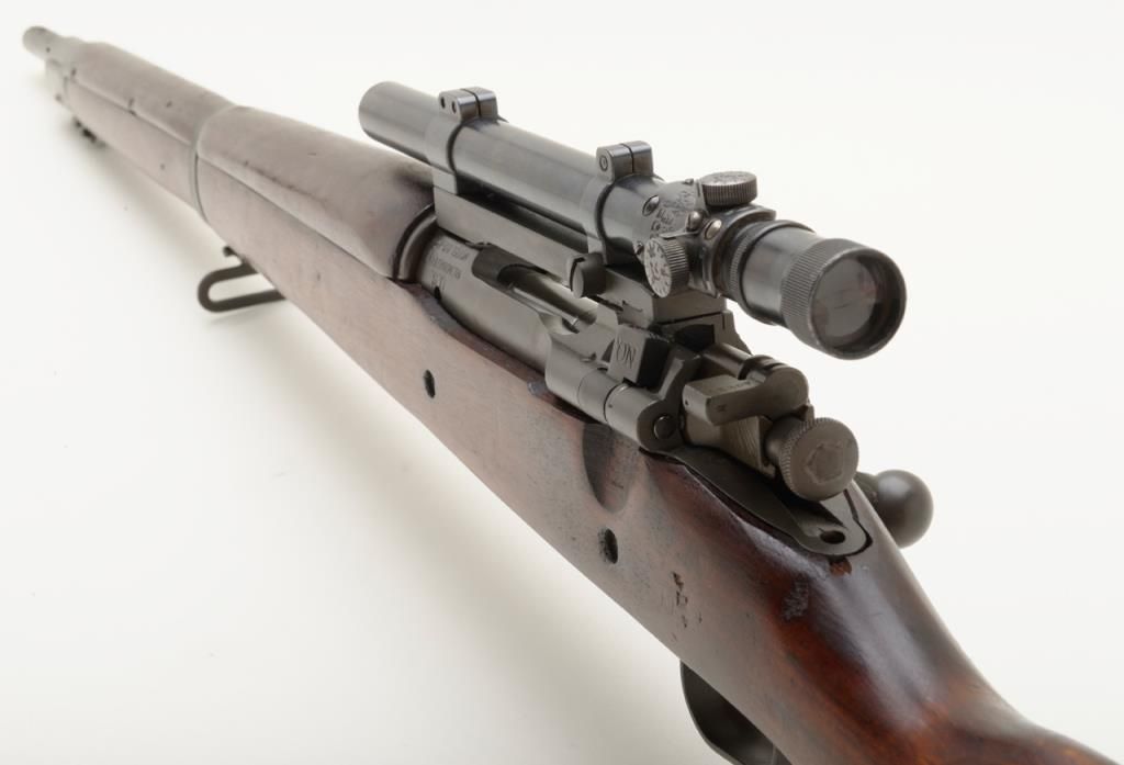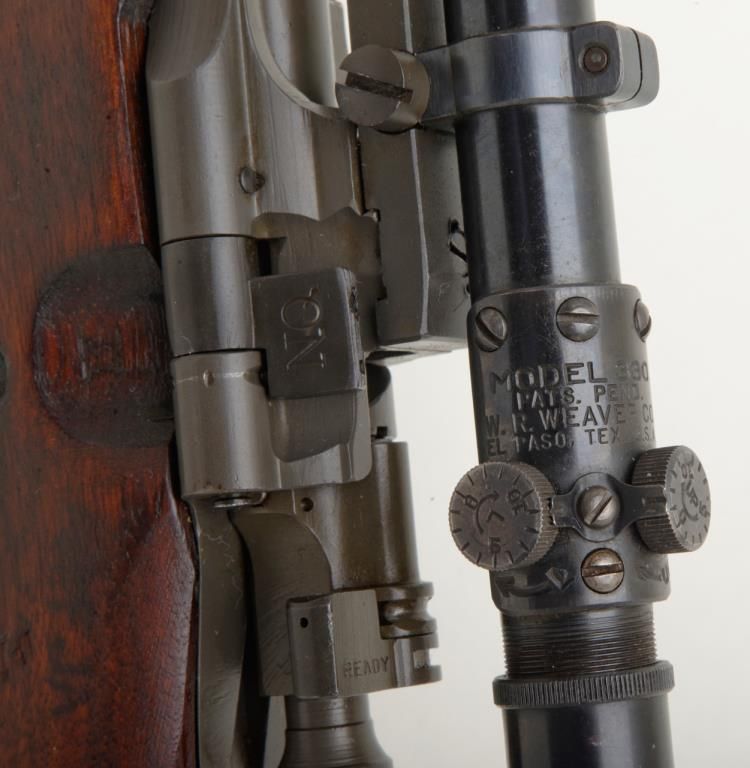 Remington 03-A3 Sniper rifle, cal. .30 US with 24" barrel, serial # Z4001657. The rifle is in overall near fine condition retaining the majority of its original parkerized finish, with an RA marked barrel dated 9-43 and front sight removed. The action works well and the bore is very good. The action is correctly marked for the sniper configuration with offset markings and serial number. The stock has a couple of faint cartouche marks, with Circle P proofs behind the trigger guard, the number "5" forward the magazine and mars, scrapes and compression marks consistent with use. Additionally, the stock has sling swivels and parkerized metal butt plate with trap. The rifle retains the correct parkerized scope base with a period Weaver 330 scope added. A very clean sniper rifle. Est.: $1,500-$3,000. (C+R/PPT)