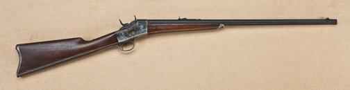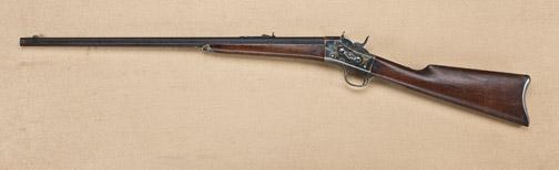 Remington #1 Rolling Block sporting rifle, .32 rimfire caliber, 26” medium weight octagon barrel, blue and case hardened finish, standard wood stocks, serial #2759. The barrel shows 75-85% original blue, starting to drift and turn to brown, with some scattered light to moderate erosion and just starting pinprick pitting. The edges are sharp, the edges are crisp, the frame shows 90% case hardening drifting on the trigger guard and tang. The side of the action shows some fiery case hardening and some dried oil. The stocks are very good plus to near fine and show some tiny splatters from paint that could be removed easily. The left side of the frame shows sharp patent dates, the action shows bright original blue as does the hammer. The interior is bright and shiny. A strong Remington with beautiful case hardening. Est: $2,000 - $4,000
