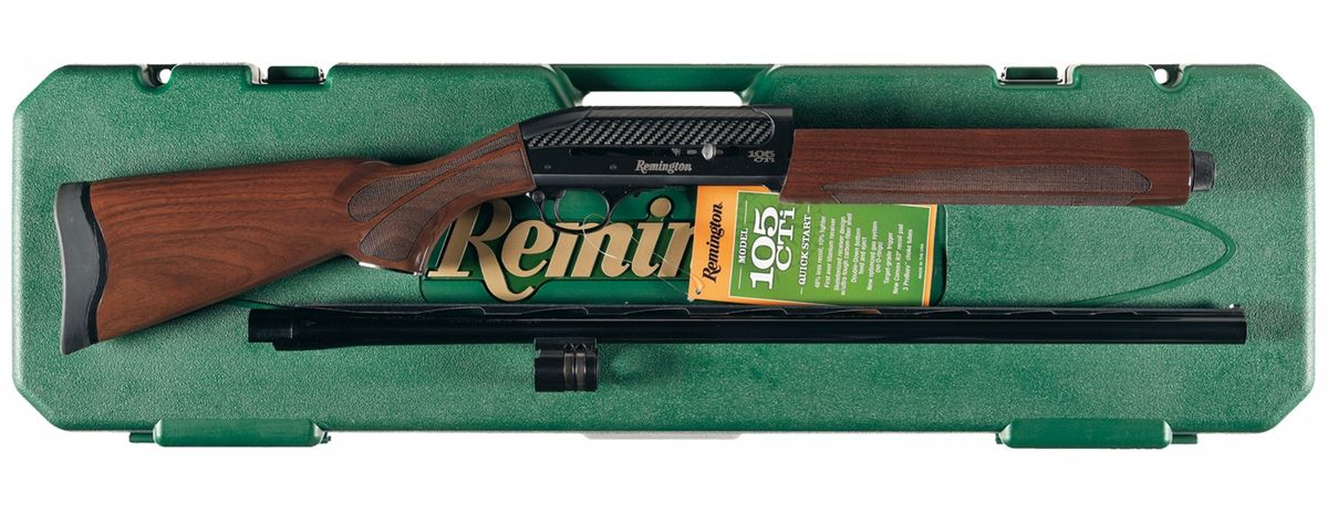 This shotgun was manufactured in 2006 and is a bottom ejecting design. The top of the receiver is carbon fiber while the barrel has white bead front sight, steel mid bead sight, 3 inch chamber and is threaded for Pro Bore choke tubes. Length of pull is 14 1/2 inches. With green plastic hardcase, box numbered to the gun, gun lock, magazine plug, two extra choke tubes, papers and hanging tag.