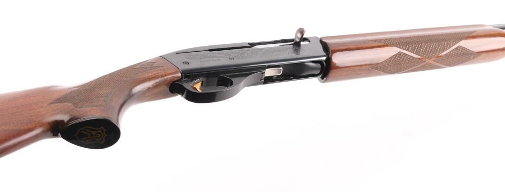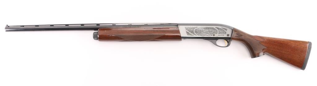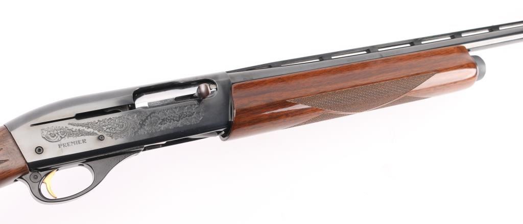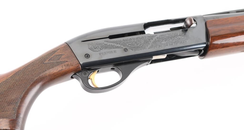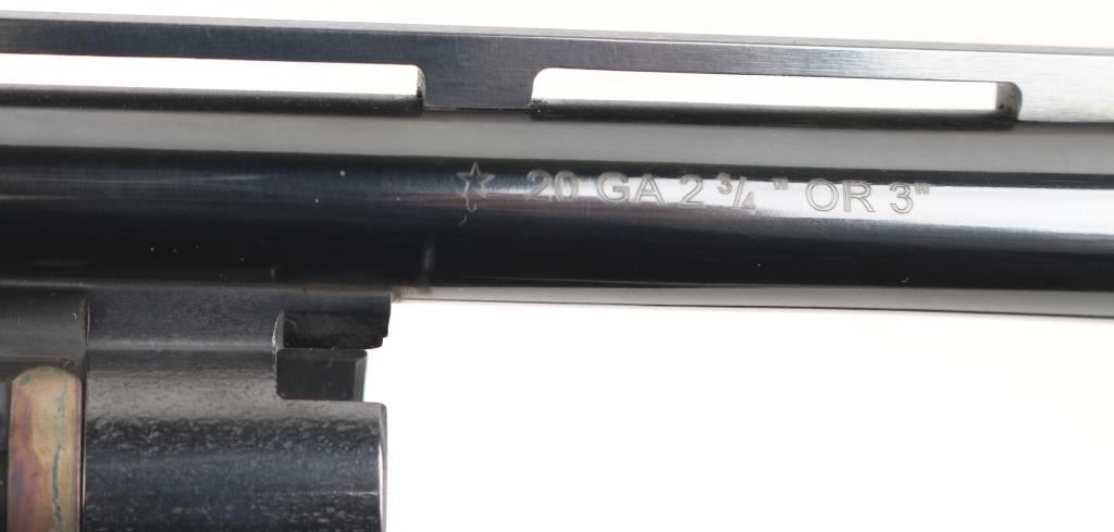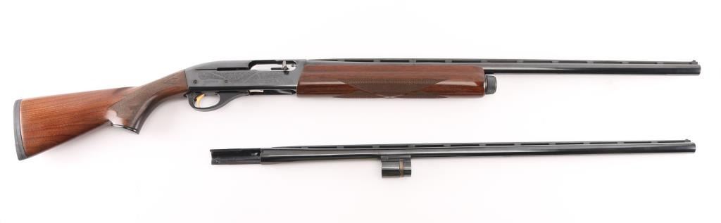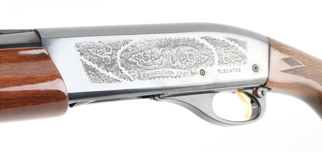 SN: TL014703 American made gas operated semi-automatic shotgun chambered for 2 3/4" or 3" 20 gauge shells. The model 11-87 was introduced in 1987 and was based off the Model 1100 but with a self-compensating gas system. Features a blued finish, 25 1/2" vent rib barrel with screw-in IM choke tube, white bead front sight, silver bead mid-sight, half-length tube magazine, smooth gold trigger with beveled edges, alloy triggerguard, serrated charging handle, push button safety with key lock feature, floral engraved steel receiver, checkered walnut forend with satin finish, and straight grip shoulder stock with factory recoil pad. Shotgun exhibits approximately 99%+ of its original finish showing little to no visible wear. Action is smooth, the bore is excellent, and the wood stocks are fine. LOP is 12 1/4" Comes with spare 28" barrel, same description as the barrel on the gun, excellent condition. Condition NRA Excellent. Modern Firearm.