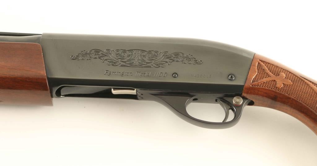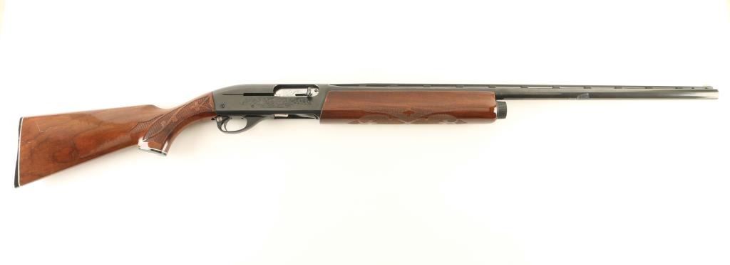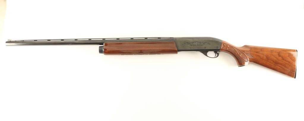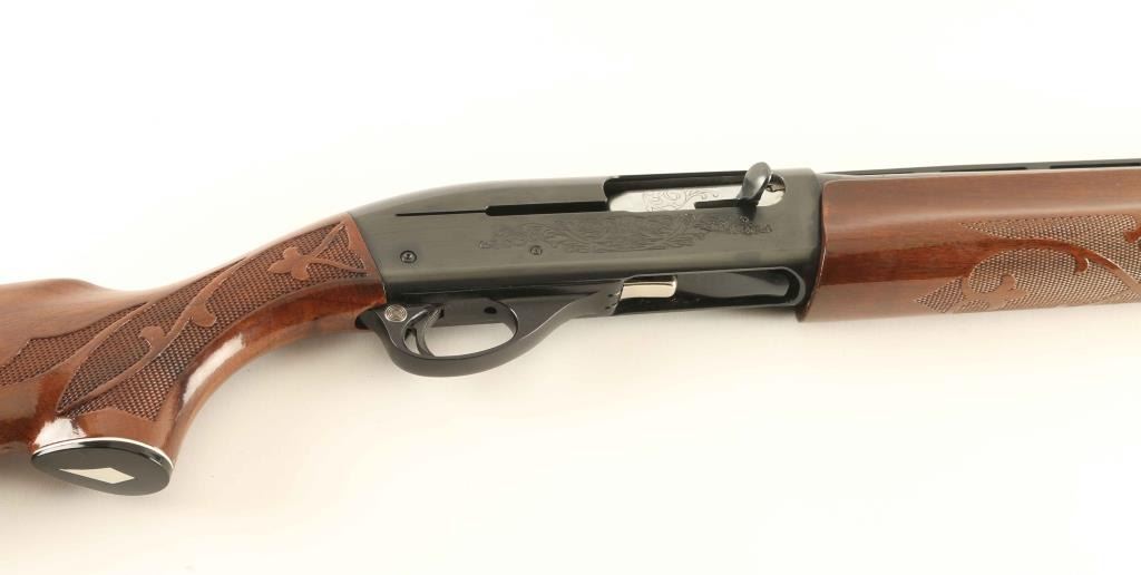 American made gas operated semi-automatic shotgun chambered for 2 3/4" 12 gauge shells. Features a blued finish, 28" modified choked barrel with ventilated sighting rib, half-length tube magazine, large white cylindrical front sight on custom base, simple roll-stamp engraved floral scroll on the receiver & bolt, smooth trigger with beveled edges, alloy triggerguard, serrated charging handle, push button safety, steel receiver, fancy press checkered walnut forend with glossy finish, and pistol grip shoulder stock with grip cap and serrated black buttplate. Shotgun exhibits approximately 97% of its original blued finish showing a some scattered handling marks and a few specks of minor surface rust on the barrel. Action is smooth, the bore appears excellent but is slightly dirty, and the high gloss wood stocks are fine with minimal blemishes. Condition is near NRA Excellent ***Modern Firearm***
