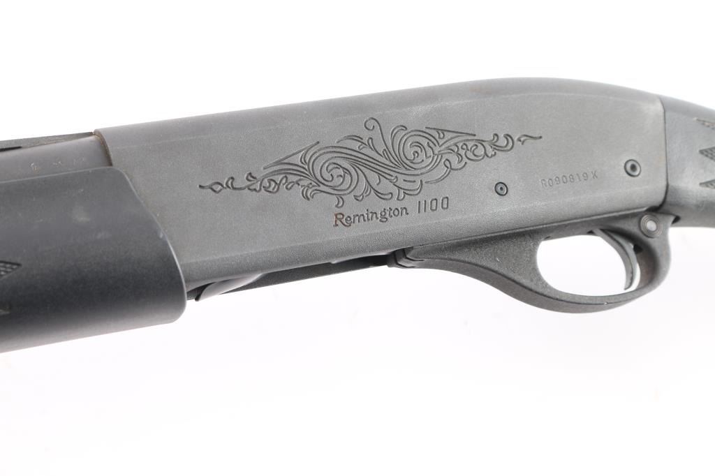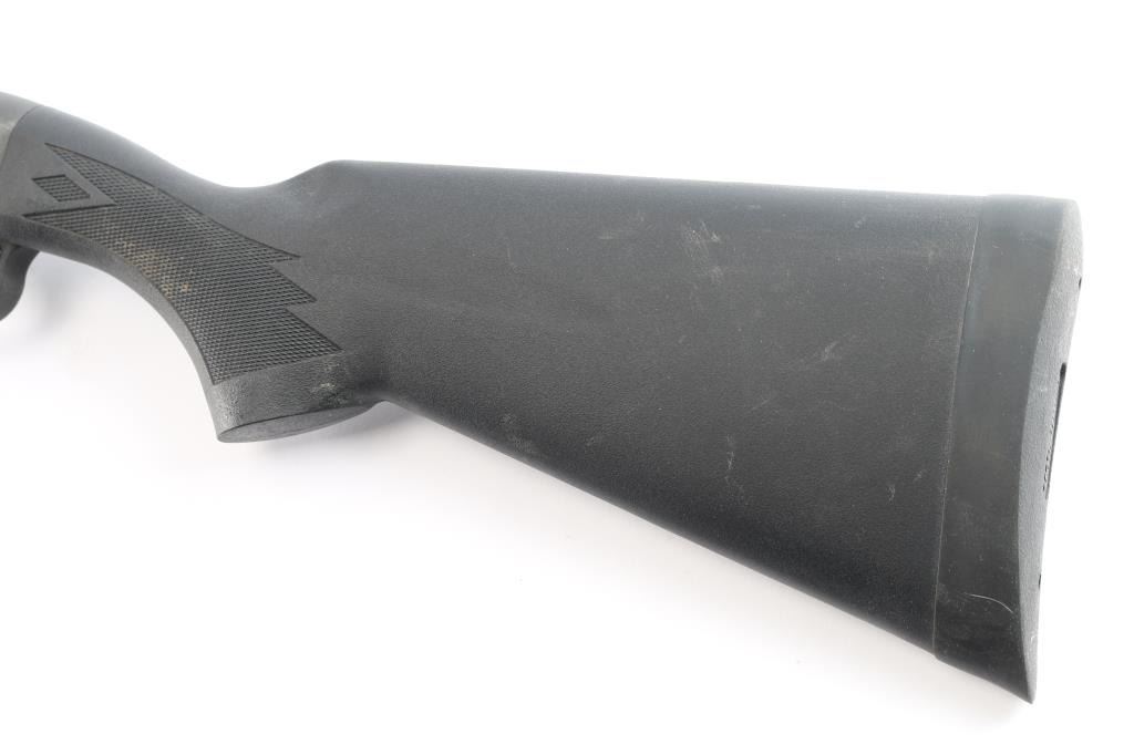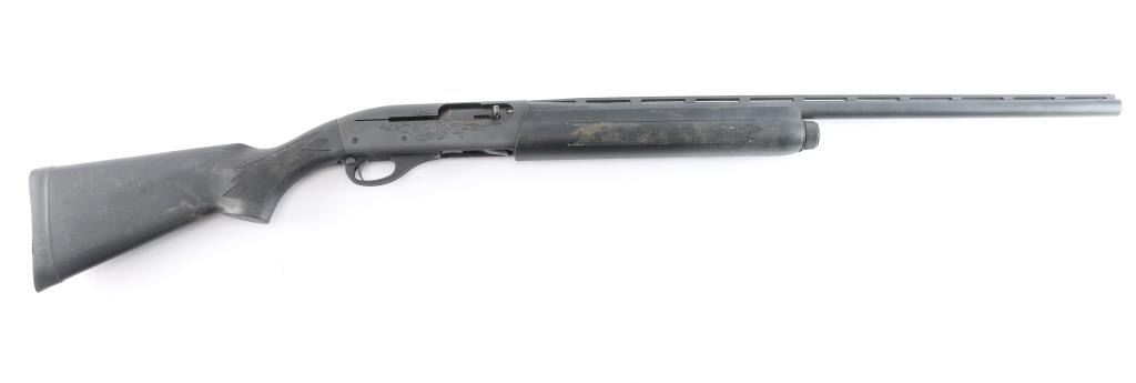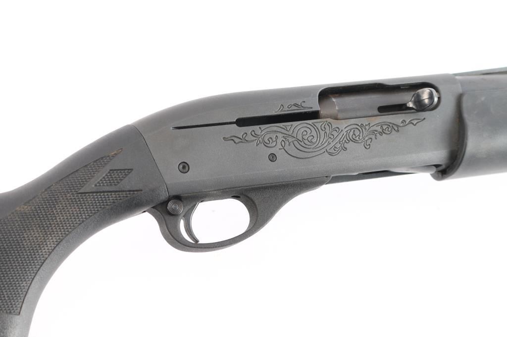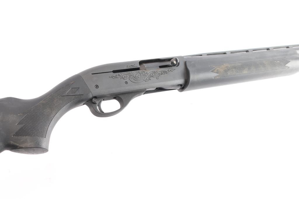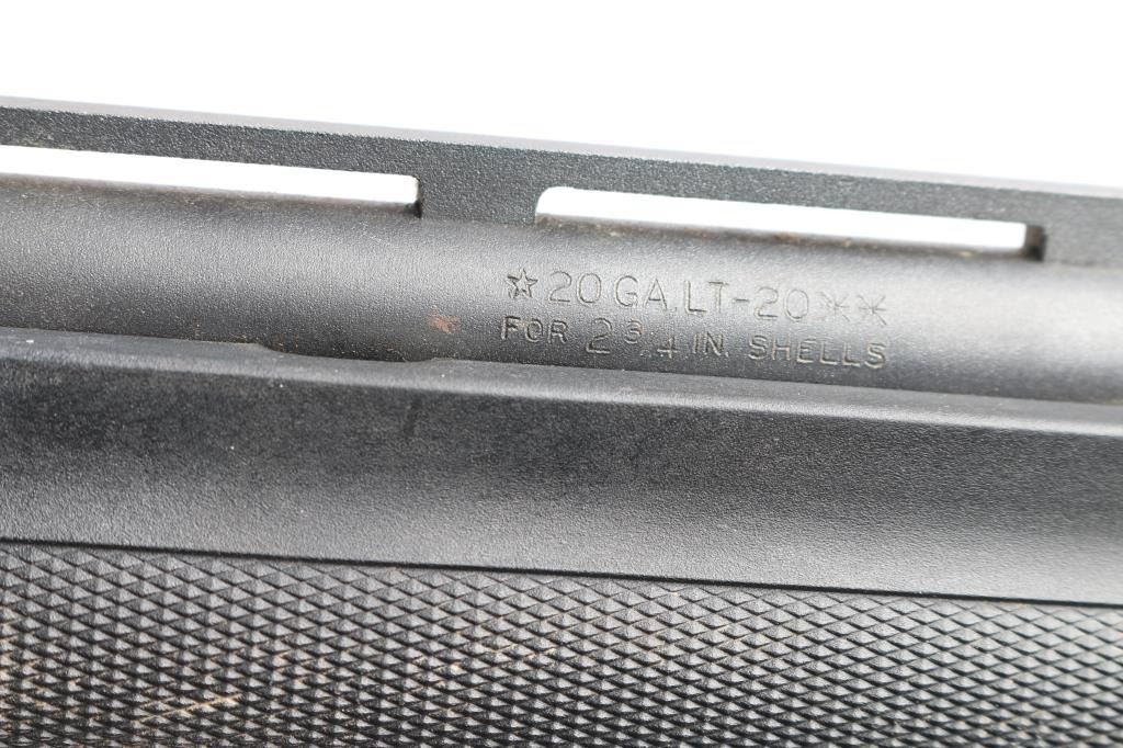 American made LT-20, a gas-operated semi-automatic 20 Ga. shotgun with a 2 3/4" chamber manufactured circa 1994 in Ilion, NY. It features a 25 1/2" parkerized barrel, ventilated barrel rib, steel sighting bead, smooth curved trigger, 'IM' choke installed (measured with a drop-in guage), 4-rd tube magazine, push-button safety, bottom loading, and side ejecting. Floral scroll designs on parkerized receiver. A black polymer stock has a checkered forend, semi-pistol grip buttstock with checkering at the wrist, and a solid rubber recoil pad. The bore looks very good, and the action is smooth and crisp. The parkerized finish remaining is approximately 98% with superficial scratches. The metal shows light scattered rust throughout. The furniture's stock and forearm are very good with light scratches and dirt. The Length-of-pull is 13 3/4".