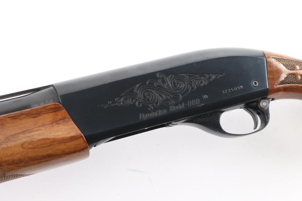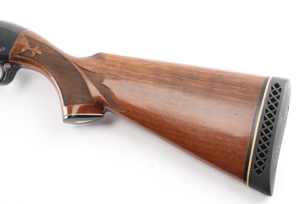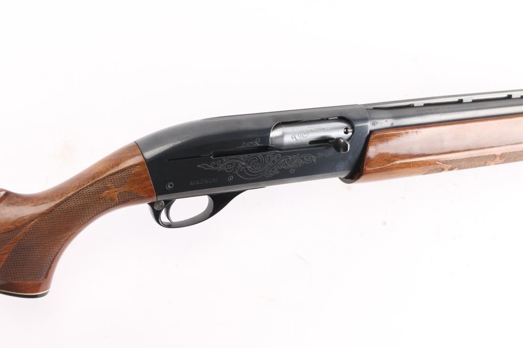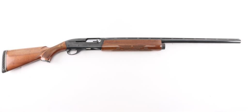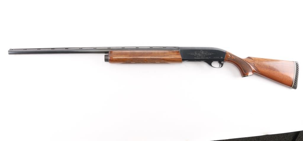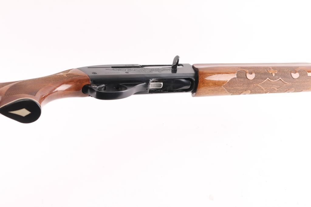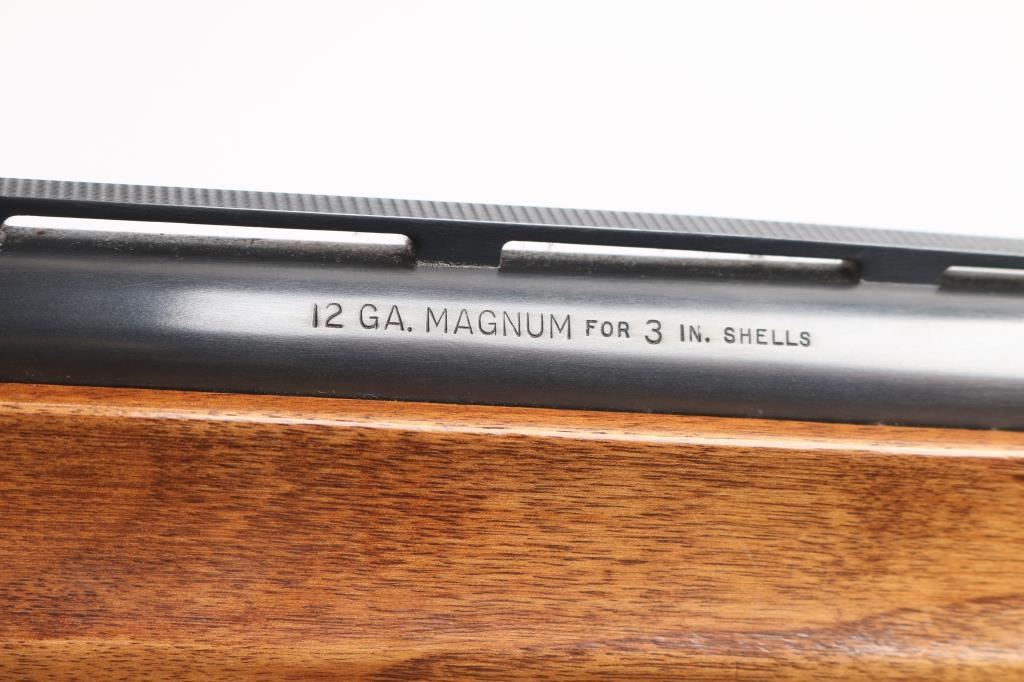 American made gas operated semi-automatic shotgun chambered for 3" 12 gauge shells. Features a blued finish, 28" vent rib barrel with fixed Full choke, silver bead front sight, half-length tube magazine, simple floral scroll roll-stamp engraving on the receiver & bolt, smooth trigger with beveled edges, alloy triggerguard, serrated charging handle, push button safety, fancy press checkered walnut forend with high gloss finish, and pistol grip shoulder stock with grip cap & factory recoil pad. Shotgun exhibits approximately 99% of its original finish showing little wear. Action is smooth, the bore is excellent/bright, and the wood stocks are excellent with a couple of minor blemishes.