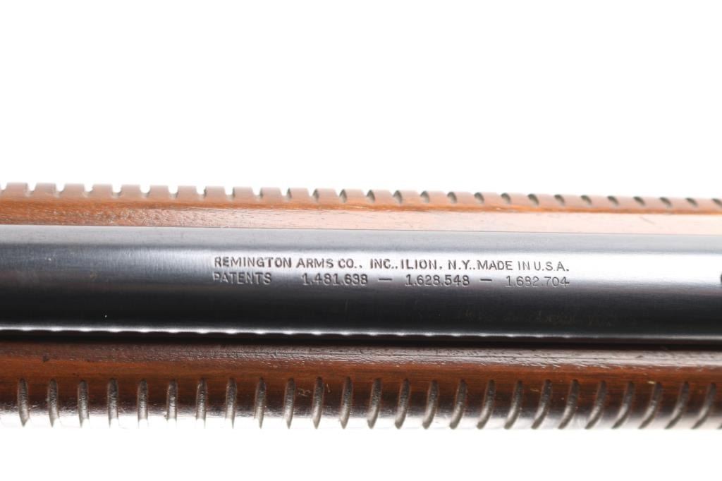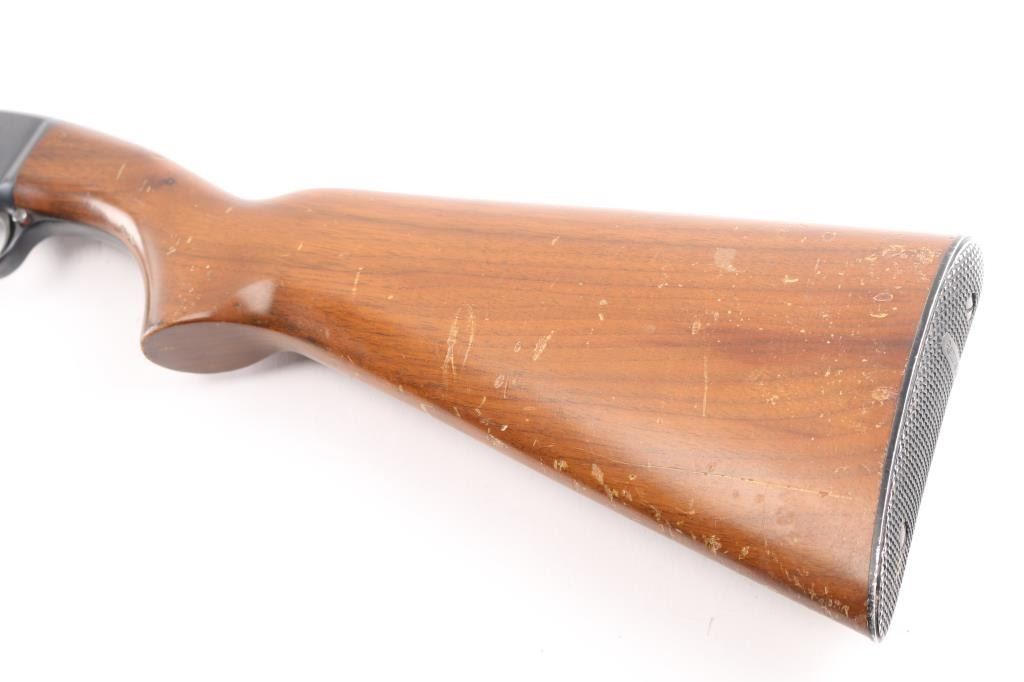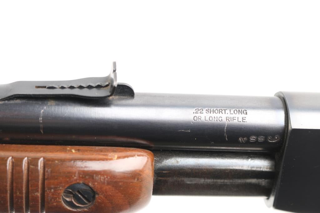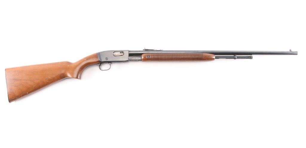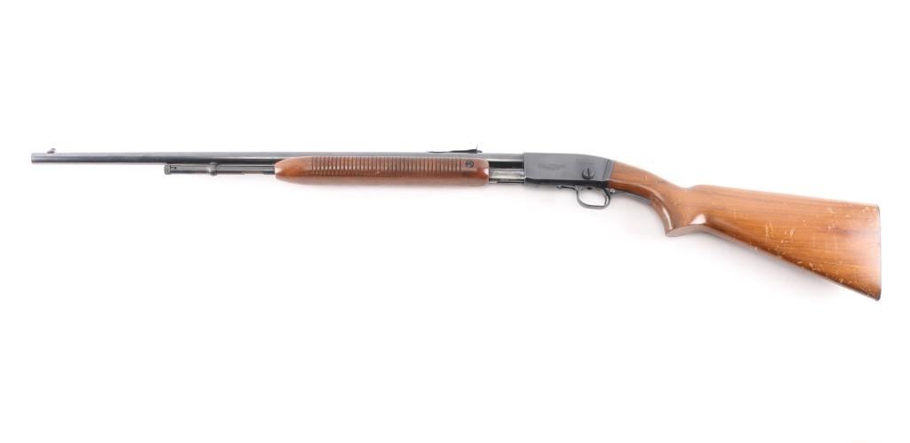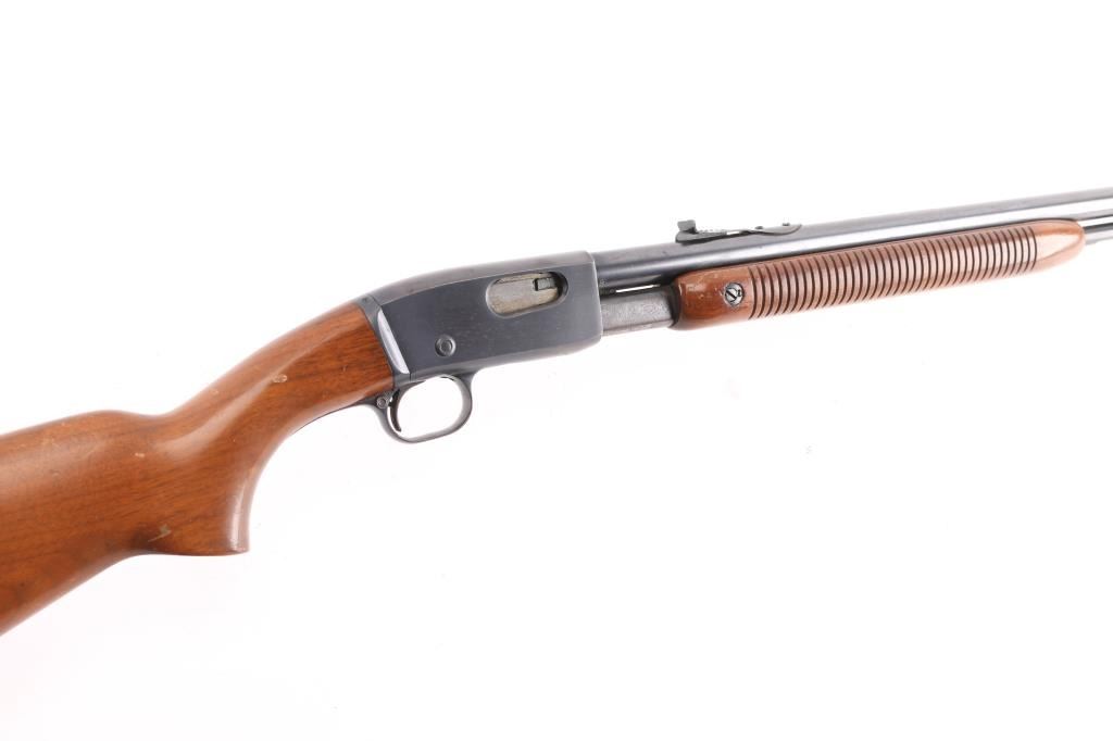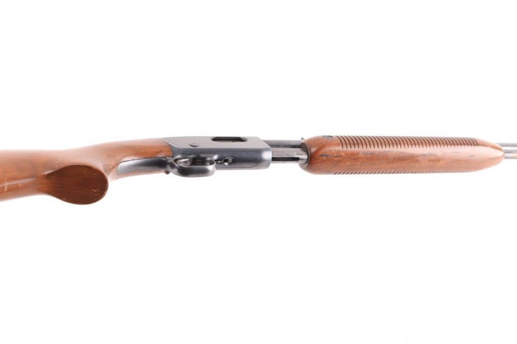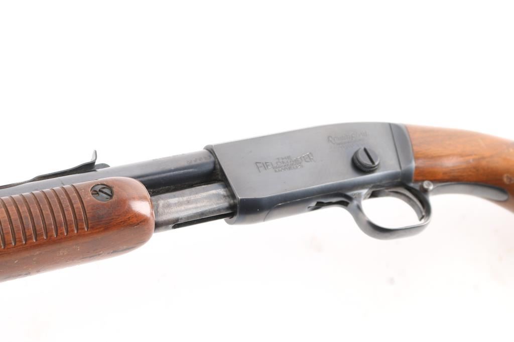 'The Field Master' Take down pump action rimfire rifle manufactured circa 1947. Features blued finish, grooved walnut pump handle, smooth walnut stock with curved grip, factory checkered metal buttplate, 24" barrel, blade front sight with bead top, adjustable sporting rear sight, tube magazine under barrel, manual safety, takedown screw at receiver. Bore is excellent/bright. Retains 90% blue, with edge wear, minor scratches, rubbing wear from operating the action. Wood is good/sound condition with many dents & scratches, some finish loss mostly on the shoulder stock.