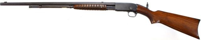 pump action rifle 24" octagon barrel, blued finish, tang sight, walnut stocks. Overall very good to near fine condition, retains approx. 85-90% original blue, walnut stocks with original finish, Remington crescent butt plate drifted gray brown finish. Excellent action with good bore. Modern. Est. 350-600