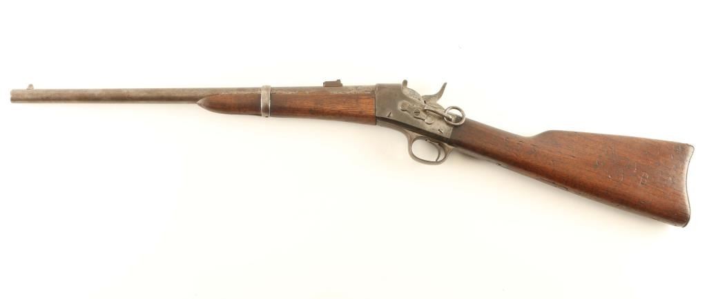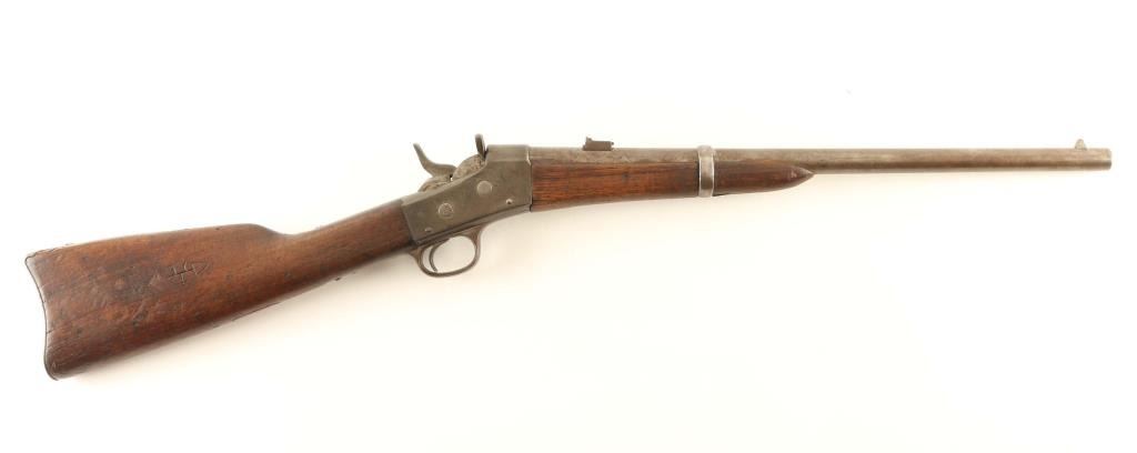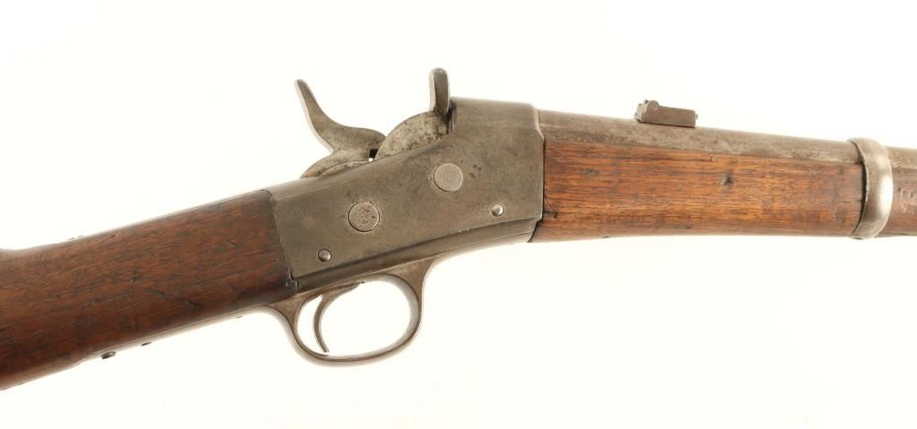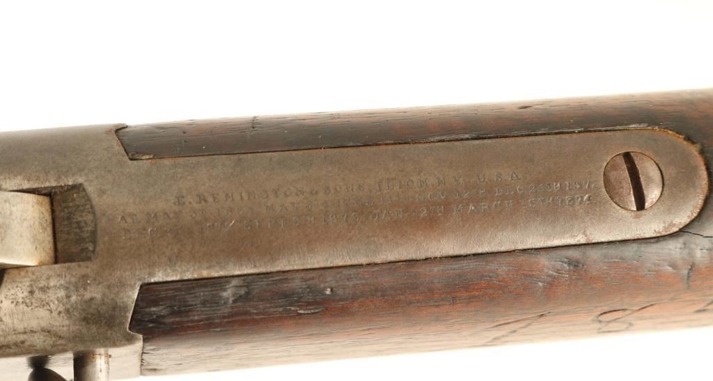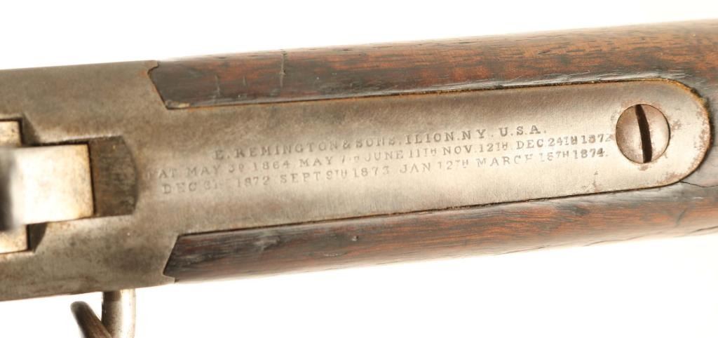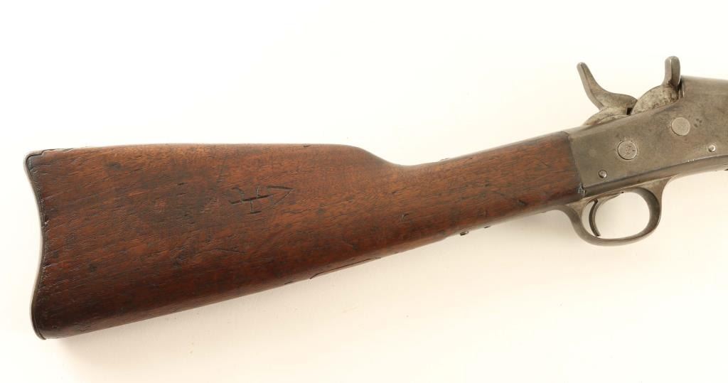 NVSN Military single shot rifle. Features approx 20" barrel, two position flip style rear sight, sling bar with saddle ring. Bore is good condition, frosted appearance with shallow rifling. Bluing has turned gray or brownish gray, some pitting in places. Wood is in good serviceable condition with scratches and dents; butt appears a replacement with replacement wood to fill sling swivel recess. Remington three line address on top tang is readable but faint. Various letters, numbers and symbols carved into butt stock. Condition is NRA Good *** Antique Firearm ***