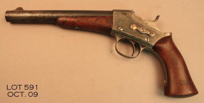 Remington 1871 Army Rolling Block pistol, .50 cal., 8” round barrel, blue and case hardened finish, wood stocks, #NVSN. This gun is in overall very good condition showing approx. 40% muted original blue finish on the barrel withbalance gone to a plum color with scattered erosion areas by the muzzle, approx. 60% original case colors on the frame, very good bore, action, markings and grips with a clear “CRS” inspector cartouche on the left grip. Est.: $1,000-$2,000.