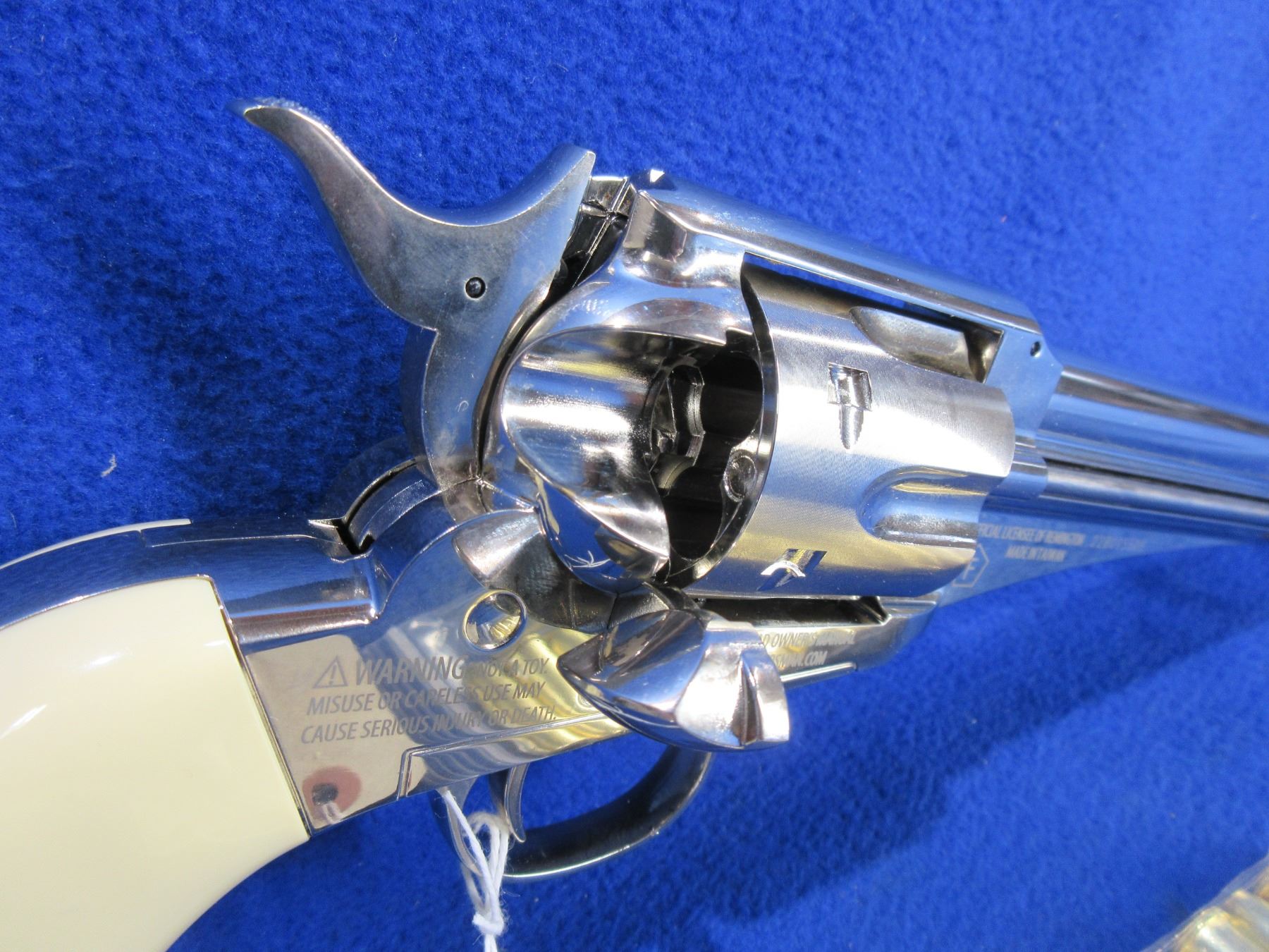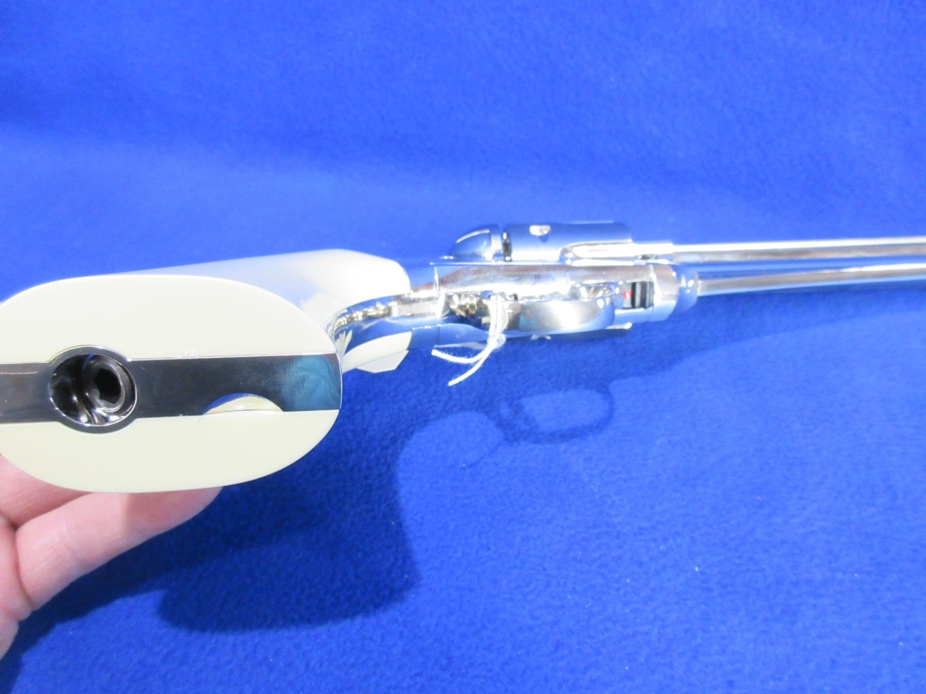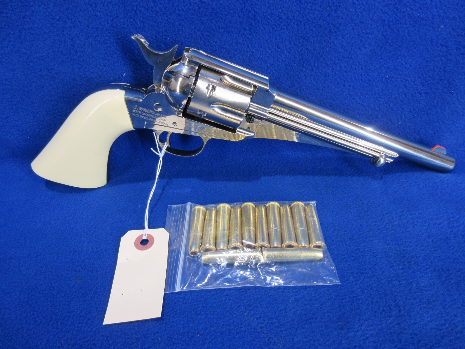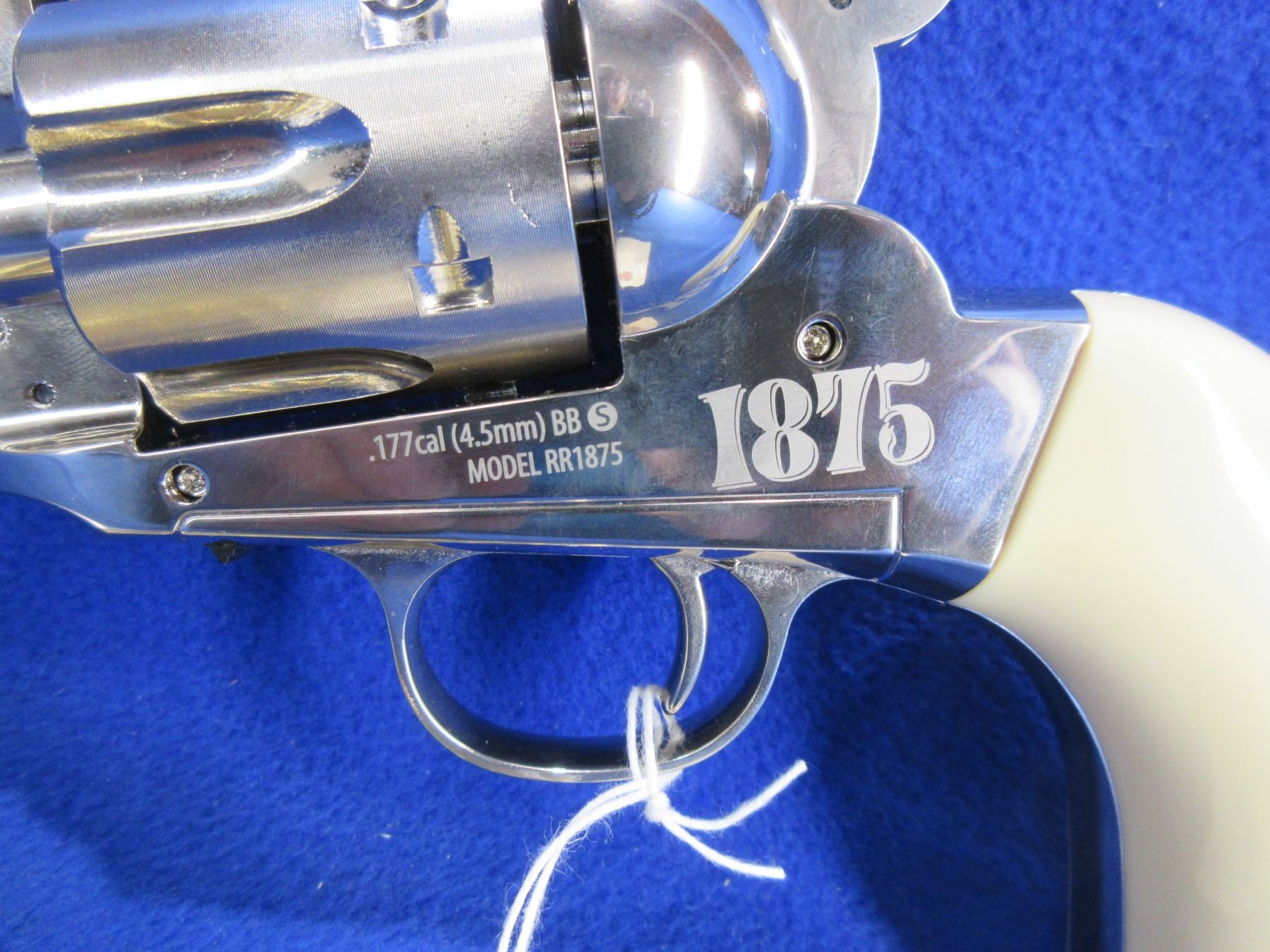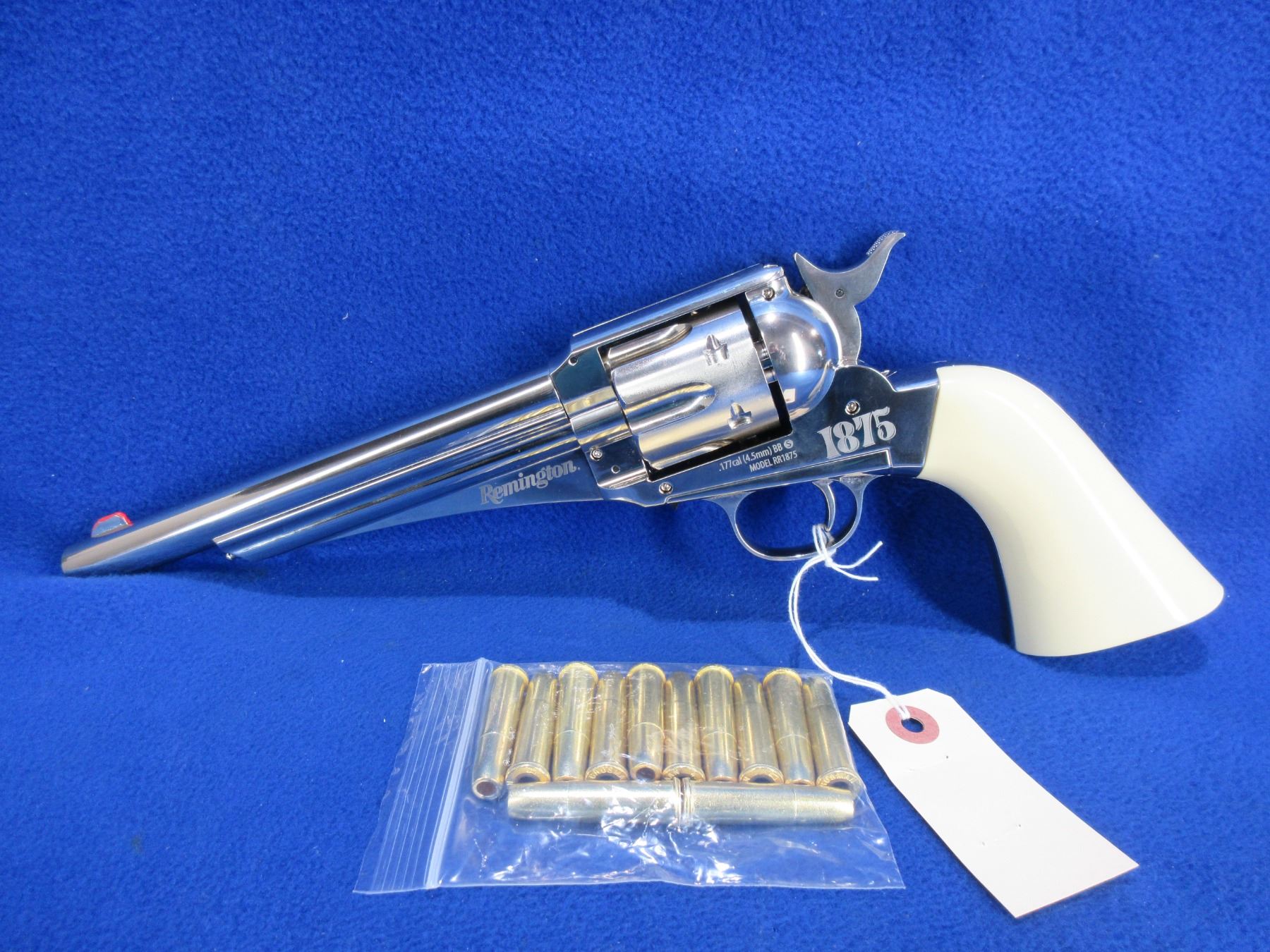 Remington 1875 .177 Cal. BB and Pellet CO2 Revolver - Model RR1875 - Revolving cylinder and a steel smooth-bore barrel, shoots up to 450 fps, holds 6 metal cartridges that load with BB or pellet, functional hammer, loading gate, and extractor, beautiful nickel finish, ambidextrous faux-ivory grip, comes with 12 cartridges