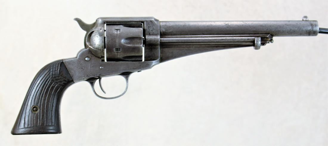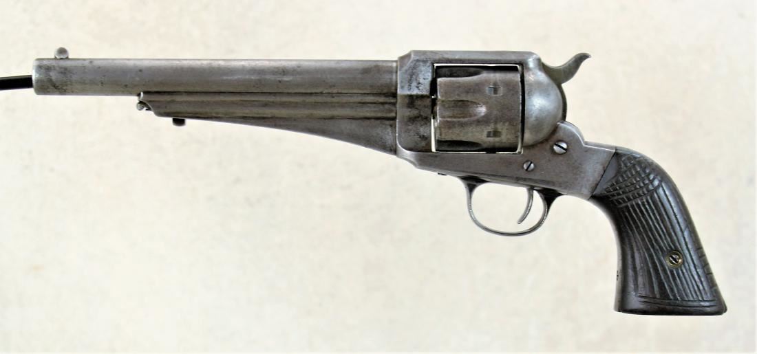 Chambered in .44 caliber, 7 1/2"" barrel length, with two digit serial number. Top of the barrel marked "E. Remington & Sons. Ilion, N.Y. U.S.A.". Stud front sight and 6 shot cylinder. Blue finish with walnut grips. The grips are hand carved with a linear and checkered pattern. "J.J." carved on the bottom of the grips.
