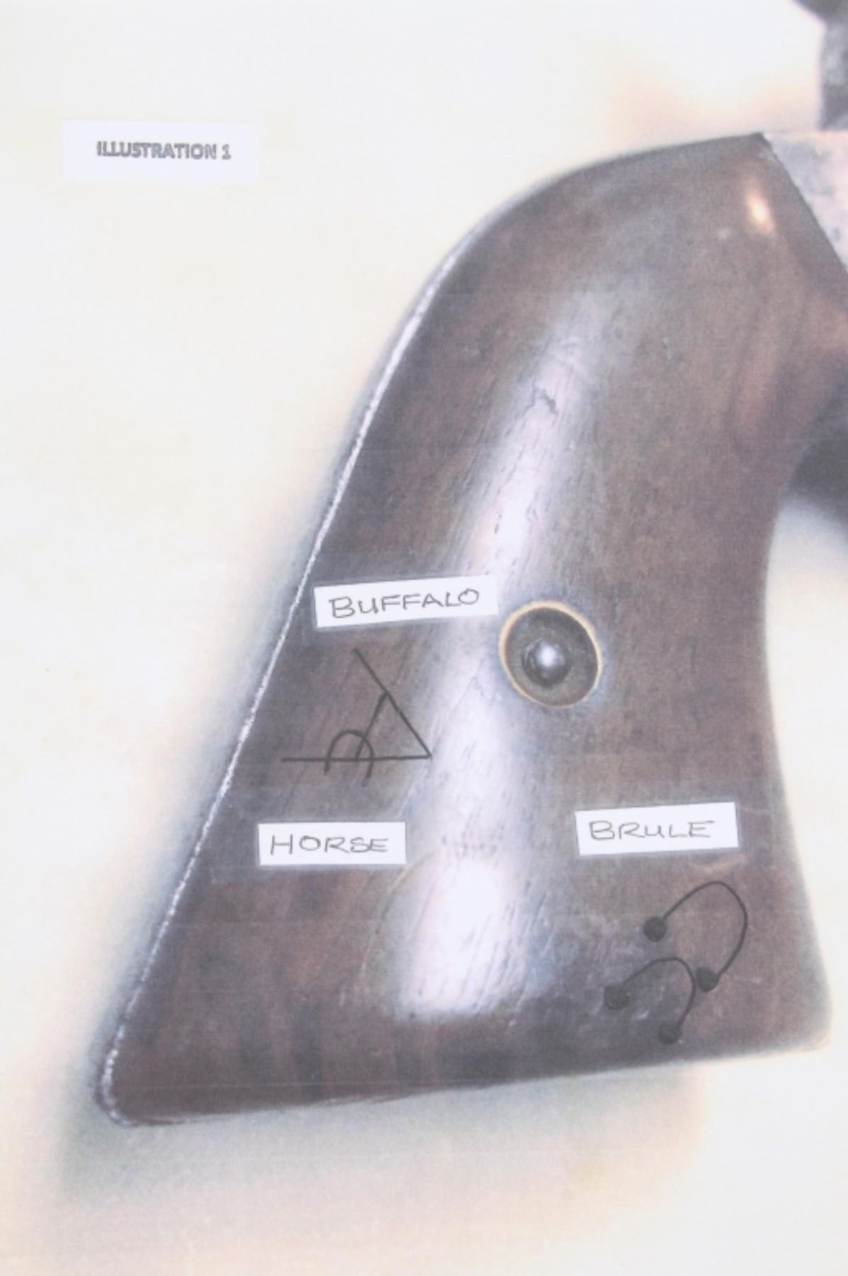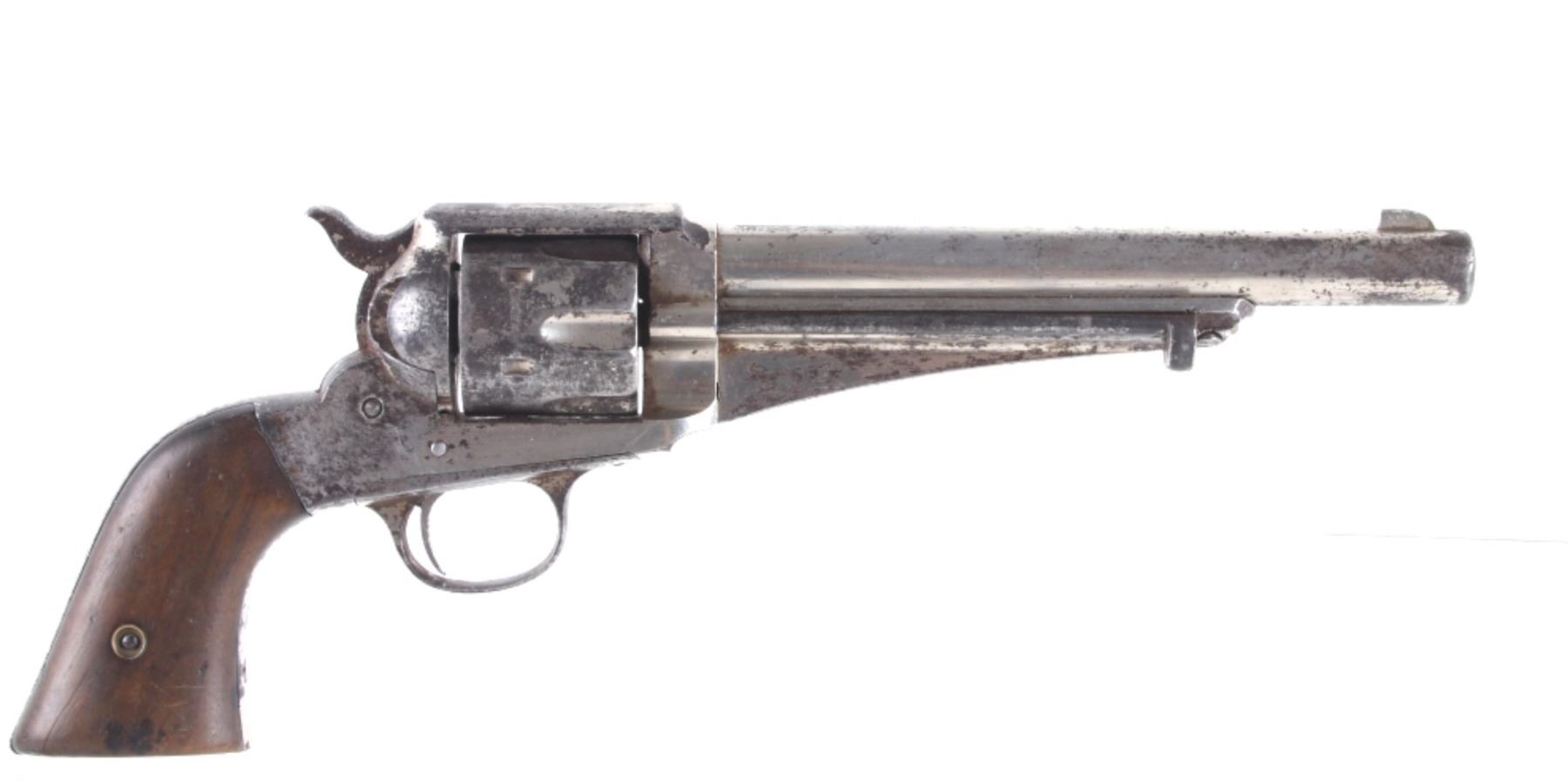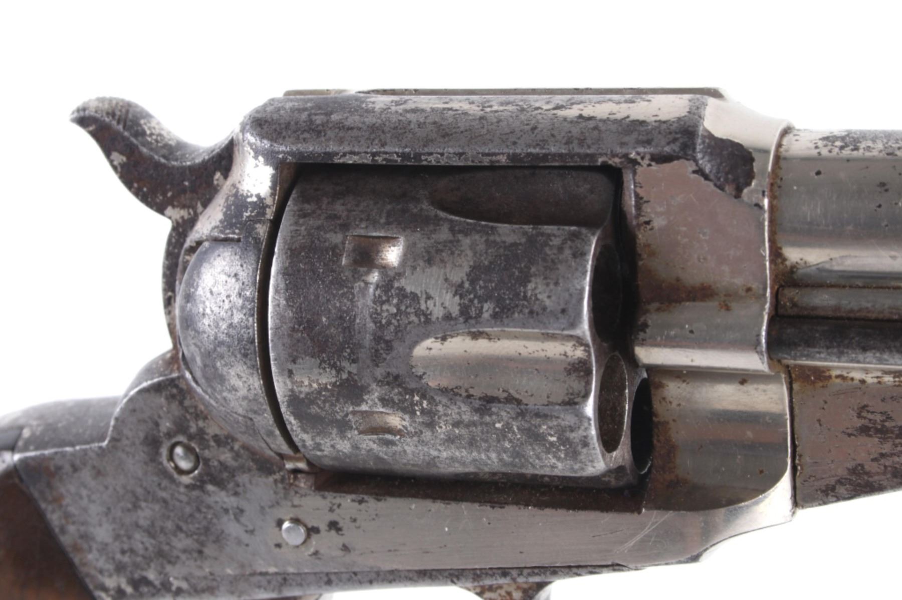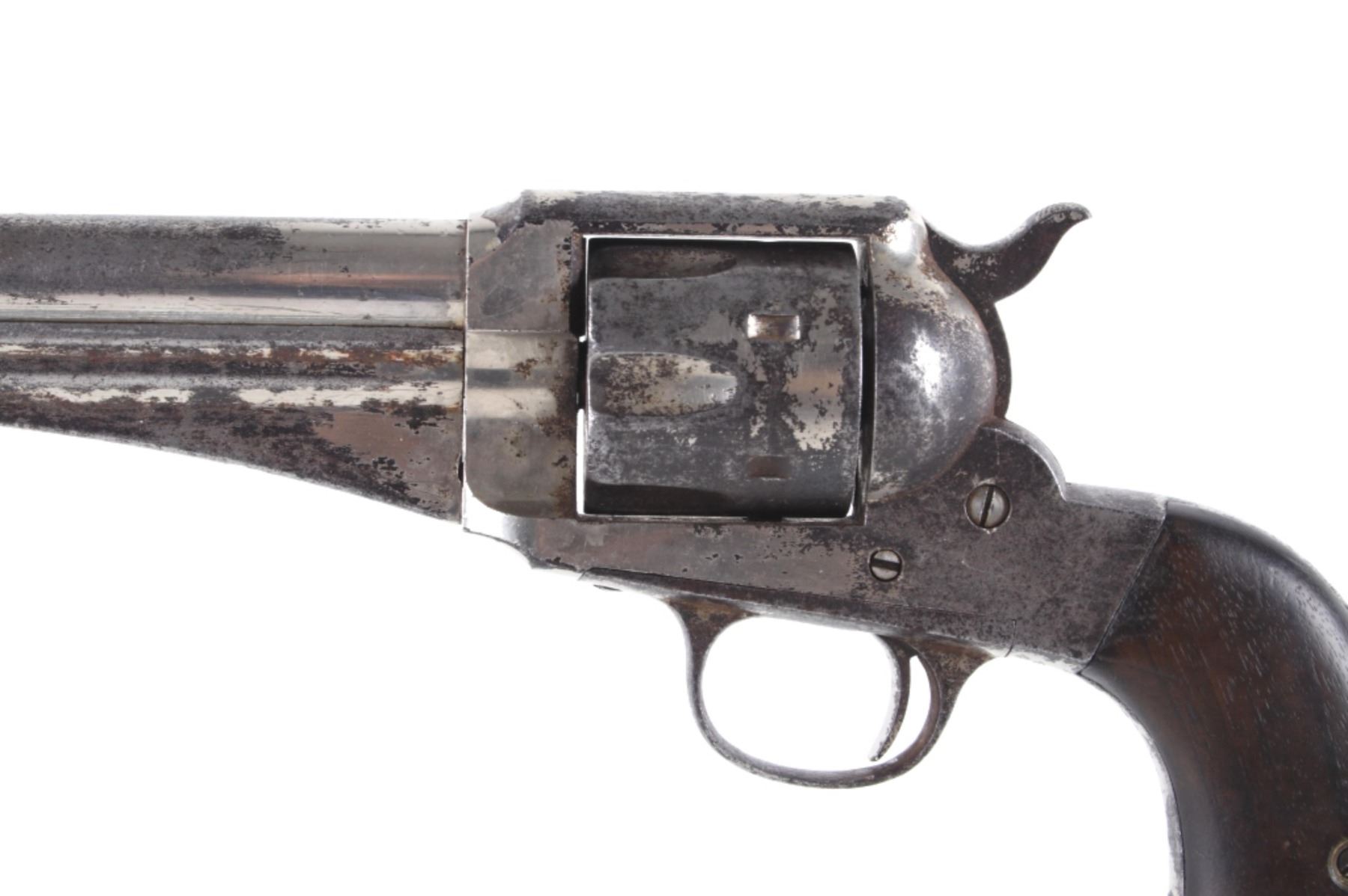 This is an original Remington Model 1875 Single Action Army revolver, serial number 33 which was attributed to being in the U.S. Interior Department Order #5777 shipment in 1883 to the Rosebud Indian Agency and issued to Rosebud Agency Police member Buffalo Horse, a Brule Lakota Sioux. This example has been reviewed and comes with paperwork from The Guns of History with the Rosebud Agency Police information and illustrations of the Buffalo Horse markings on the gun. The revolver exhibits a factory nickel finish with two-piece factory walnut grips and 7 ½ inch round barrel marked in a single line, “E. REMINGTON & SONS ILION N.Y. U.S.A.”, with a six-shot fluted cylinder and is chambered in .44 Remington cartridge. It is well documented that in 1883 Remington accepted a contract and delivered approximately 639 nickel plated guns to the United States Interior Department for issue to Indian Police and other Western reservations, such as the Rosebud Agency and Pine Ridge Agency. There are two other examples of nickel plated Remington 1875 revolvers that have sold over the years that were also attributed as being in this shipment, the Remington 1875 serial number 718 shipped to the Indian Police on the Pine Ridge Reservation in South Dakota Territory by the U.S.I.D. in 1883 which sold at auction by Heritage in June 2022 for $15,000 (w/ bp) and the U.S.I.D. marked Remington 1875 in nickel serial number 412 which was mentioned as being part of the shipment and sold at Morphy in their April 2019 sale for $5,760 (w/ bp). It is noted that once the Remington 1875’s reached serial number 12,000 they reverted back to serial number 1. This revolver was examined by The Guns of History, Wendell Grangaard and found to have Togia Lakota language marks across the gun including Buffalo Horse, Rosebud, Buffalo Horse Brule as shown on illustrations 1 through 4. Buffalo Horse was a Brule Lakota Sioux, born in 1827. He grew up with Hollow Horn Bear and was a member of Hollow Horn Bear’s Band of Sicangu Orphan Band of the Brule Lakota. The two fought during the Indian Wars at Little Bighorn and followed Sitting Bull into the Big Horn Mountains, later turning to the Spotted Tail Agency where they surrendered in the early summer of 1876 (Buffalo Horse and Hollow Horn Bear). Later Spotted Tail Agency was established as Rosebud Agency and Hollow Horn Bear was appointed the head of the Indian Police force with Buffalo Horse becoming one of the officers under his command. In June 1883, under the authority of Order Number 5777, thirty Remington 1875 Revolvers were issued to the Rosebud Agency Police Force in Dakota Territory from the U.S. Interior Department shipment, with this serial number 33 believed to be issued to Buffalo Horse and carried during his service. Marked under the grips with serial number 33 and on the trigger guard 44, for .44 caliber. Comes with the Guns of History paperwork and illustrations. Antique firearm NO FFL.