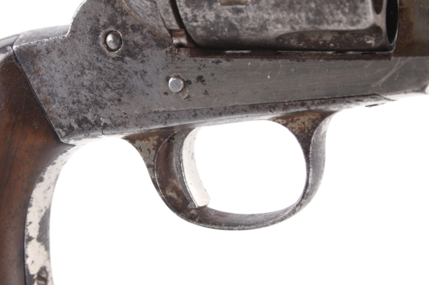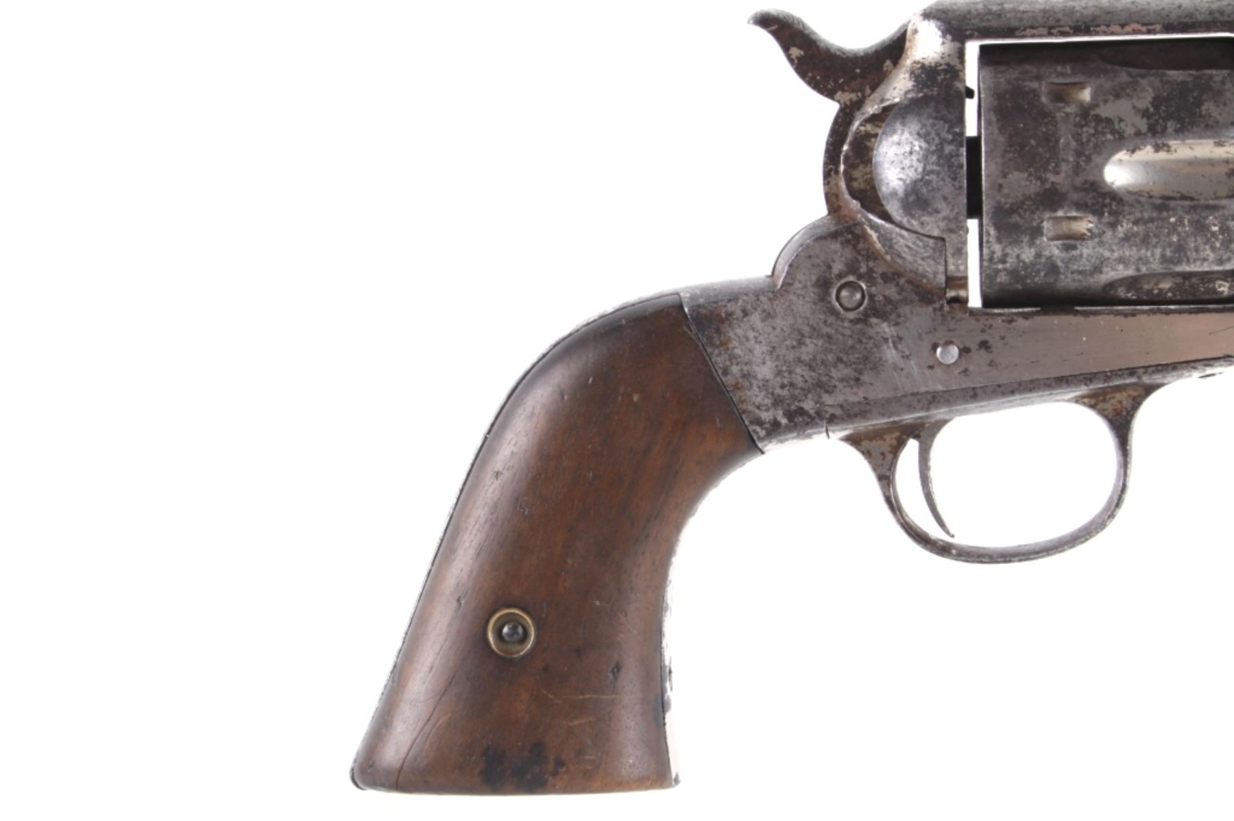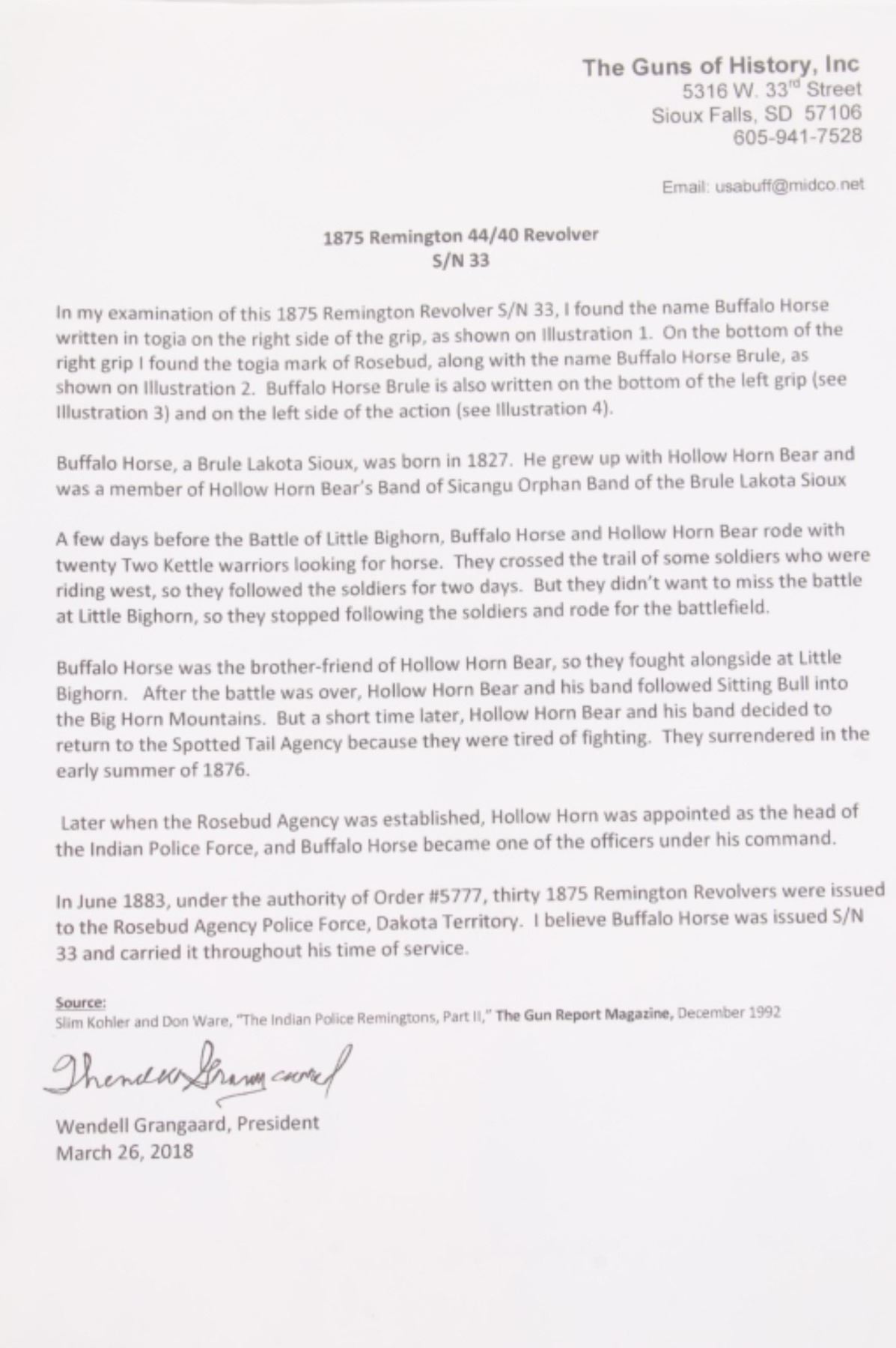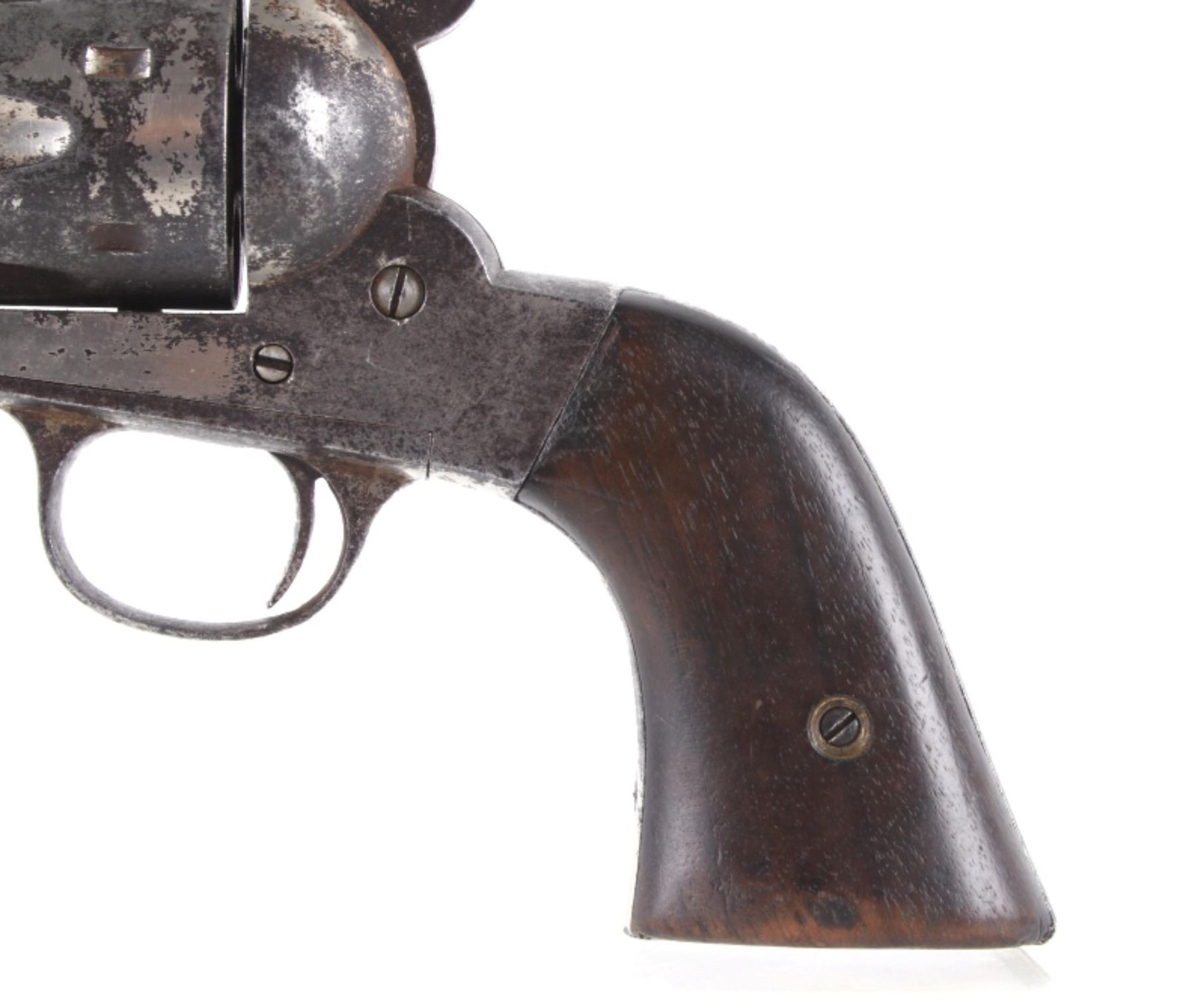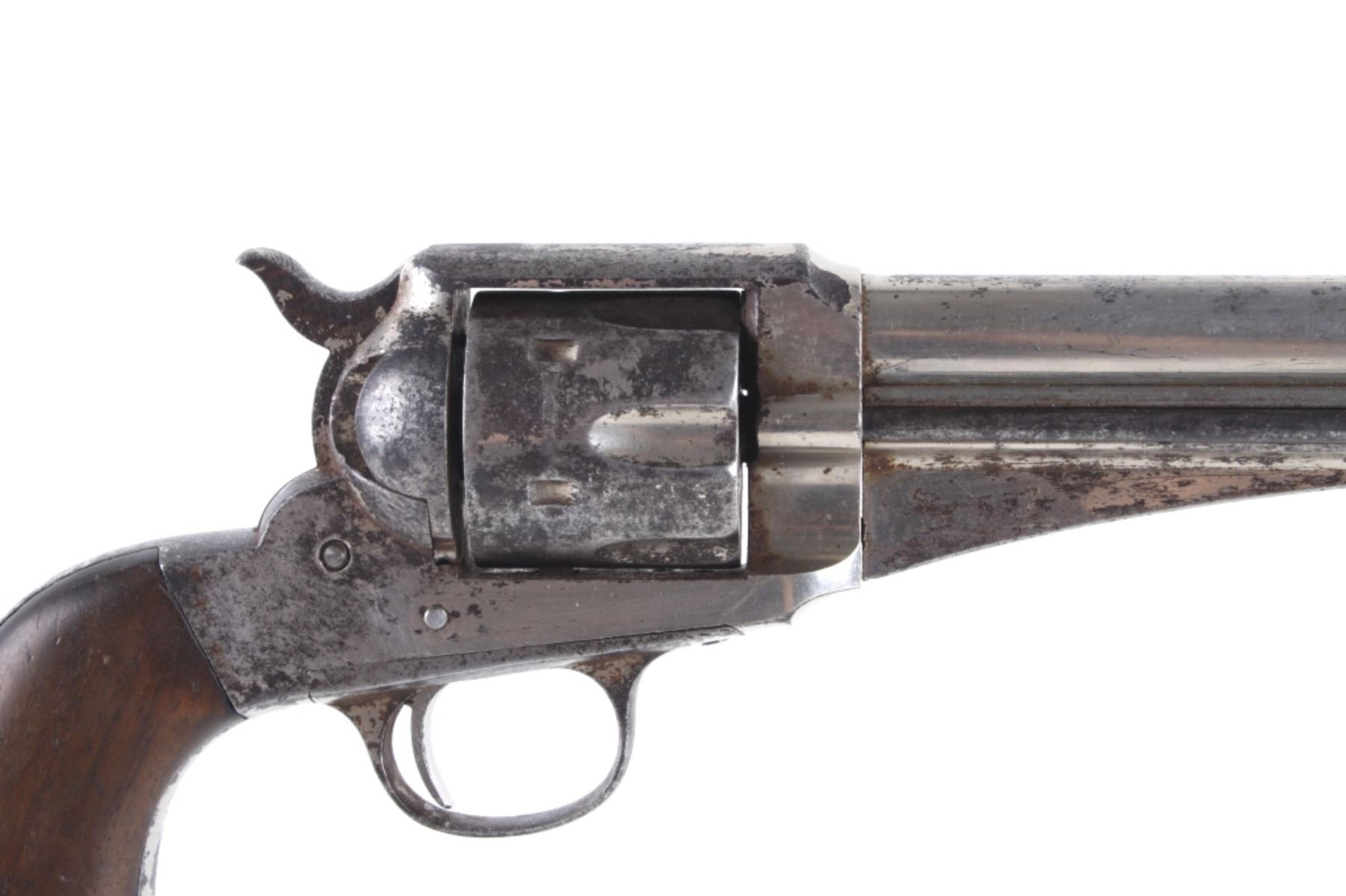 This is an original Remington Model 1875 Single Action Army revolver, serial number 33 which was attributed to being in the U.S. Interior Department Order #5777 shipment in 1883 to the Rosebud Indian Agency and issued to Rosebud Agency Police member Buffalo Horse, a Brule Lakota Sioux. This example has been reviewed and comes with paperwork from The Guns of History with the Rosebud Agency Police information and illustrations of the Buffalo Horse markings on the gun. The revolver exhibits a factory nickel finish with two-piece factory walnut grips and 7 ½ inch round barrel marked in a single line, “E. REMINGTON & SONS ILION N.Y. U.S.A.”, with a six-shot fluted cylinder and is chambered in .44 Remington cartridge. It is well documented that in 1883 Remington accepted a contract and delivered approximately 639 nickel plated guns to the United States Interior Department for issue to Indian Police and other Western reservations, such as the Rosebud Agency and Pine Ridge Agency. There are two other examples of nickel plated Remington 1875 revolvers that have sold over the years that were also attributed as being in this shipment, the Remington 1875 serial number 718 shipped to the Indian Police on the Pine Ridge Reservation in South Dakota Territory by the U.S.I.D. in 1883 which sold at auction by Heritage in June 2022 for $15,000 (w/ bp) and the U.S.I.D. marked Remington 1875 in nickel serial number 412 which was mentioned as being part of the shipment and sold at Morphy in their April 2019 sale for $5,760 (w/ bp). It is noted that once the Remington 1875’s reached serial number 12,000 they reverted back to serial number 1. This revolver was examined by The Guns of History, Wendell Grangaard and found to have Togia Lakota language marks across the gun including Buffalo Horse, Rosebud, Buffalo Horse Brule as shown on illustrations 1 through 4. Buffalo Horse was a Brule Lakota Sioux, born in 1827. He grew up with Hollow Horn Bear and was a member of Hollow Horn Bear’s Band of Sicangu Orphan Band of the Brule Lakota. The two fought during the Indian Wars at Little Bighorn and followed Sitting Bull into the Big Horn Mountains, later turning to the Spotted Tail Agency where they surrendered in the early summer of 1876 (Buffalo Horse and Hollow Horn Bear). Later Spotted Tail Agency was established as Rosebud Agency and Hollow Horn Bear was appointed the head of the Indian Police force with Buffalo Horse becoming one of the officers under his command. In June 1883, under the authority of Order Number 5777, thirty Remington 1875 Revolvers were issued to the Rosebud Agency Police Force in Dakota Territory from the U.S. Interior Department shipment, with this serial number 33 believed to be issued to Buffalo Horse and carried during his service. Marked under the grips with serial number 33 and on the trigger guard 44, for .44 caliber. Comes with the Guns of History paperwork and illustrations. Antique firearm NO FFL.