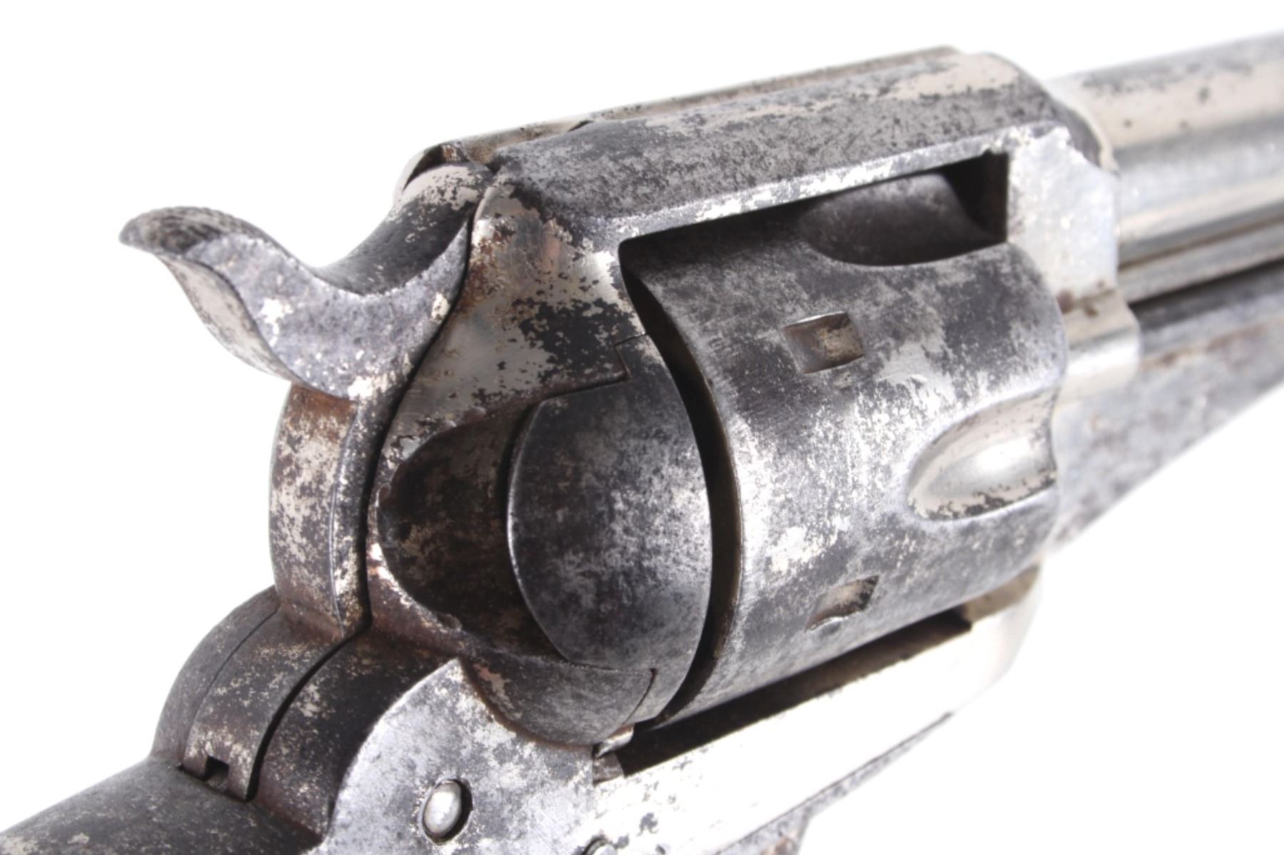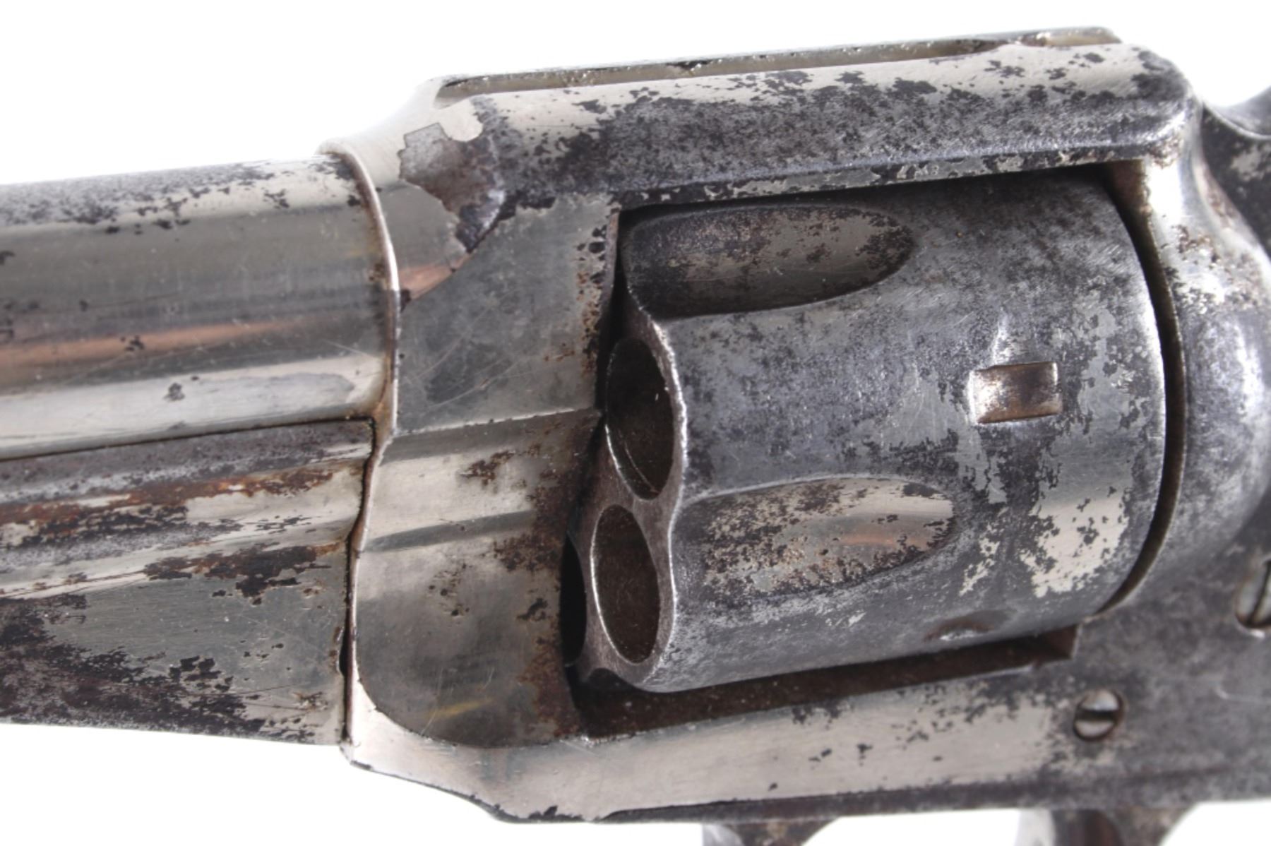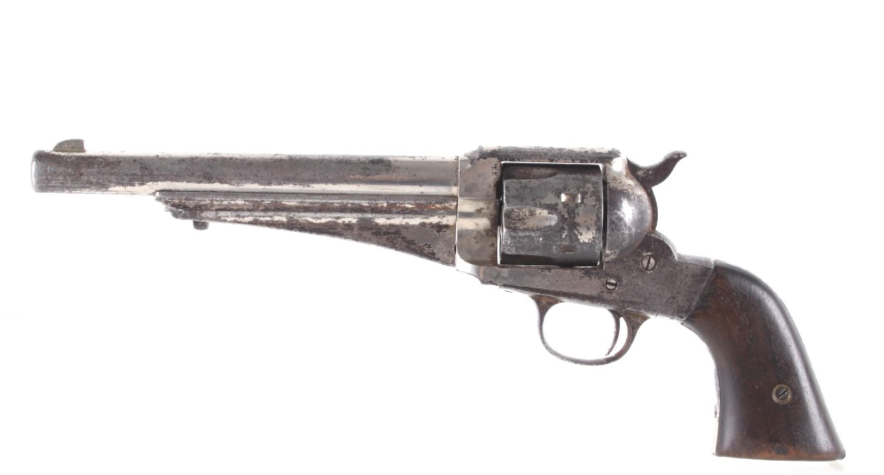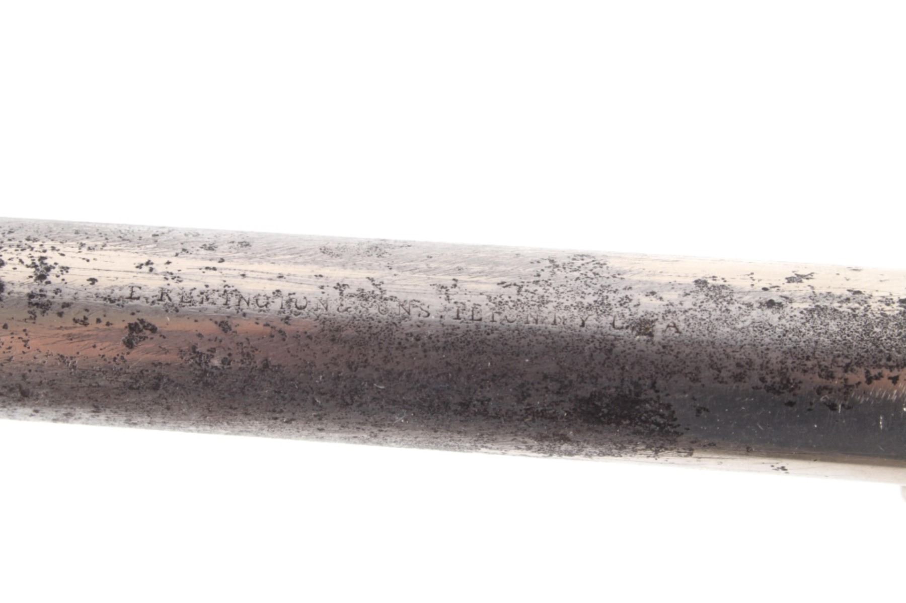 This is an original Remington Model 1875 Single Action Army revolver, serial number 33 which was attributed to being in the U.S. Interior Department Order #5777 shipment in 1883 to the Rosebud Indian Agency and issued to Rosebud Agency Police member Buffalo Horse, a Brule Lakota Sioux. This example has been reviewed and comes with paperwork from The Guns of History with the Rosebud Agency Police information and illustrations of the Buffalo Horse markings on the gun. The revolver exhibits a factory nickel finish with two-piece factory walnut grips and 7 ½ inch round barrel marked in a single line, “E. REMINGTON & SONS ILION N.Y. U.S.A.”, with a six-shot fluted cylinder and is chambered in .44 Remington cartridge. It is well documented that in 1883 Remington accepted a contract and delivered approximately 639 nickel plated guns to the United States Interior Department for issue to Indian Police and other Western reservations, such as the Rosebud Agency and Pine Ridge Agency. There are two other examples of nickel plated Remington 1875 revolvers that have sold over the years that were also attributed as being in this shipment, the Remington 1875 serial number 718 shipped to the Indian Police on the Pine Ridge Reservation in South Dakota Territory by the U.S.I.D. in 1883 which sold at auction by Heritage in June 2022 for $15,000 (w/ bp) and the U.S.I.D. marked Remington 1875 in nickel serial number 412 which was mentioned as being part of the shipment and sold at Morphy in their April 2019 sale for $5,760 (w/ bp). It is noted that once the Remington 1875’s reached serial number 12,000 they reverted back to serial number 1. This revolver was examined by The Guns of History, Wendell Grangaard and found to have Togia Lakota language marks across the gun including Buffalo Horse, Rosebud, Buffalo Horse Brule as shown on illustrations 1 through 4. Buffalo Horse was a Brule Lakota Sioux, born in 1827. He grew up with Hollow Horn Bear and was a member of Hollow Horn Bear’s Band of Sicangu Orphan Band of the Brule Lakota. The two fought during the Indian Wars at Little Bighorn and followed Sitting Bull into the Big Horn Mountains, later turning to the Spotted Tail Agency where they surrendered in the early summer of 1876 (Buffalo Horse and Hollow Horn Bear). Later Spotted Tail Agency was established as Rosebud Agency and Hollow Horn Bear was appointed the head of the Indian Police force with Buffalo Horse becoming one of the officers under his command. In June 1883, under the authority of Order Number 5777, thirty Remington 1875 Revolvers were issued to the Rosebud Agency Police Force in Dakota Territory from the U.S. Interior Department shipment, with this serial number 33 believed to be issued to Buffalo Horse and carried during his service. Marked under the grips with serial number 33 and on the trigger guard 44, for .44 caliber. Comes with the Guns of History paperwork and illustrations. Antique firearm NO FFL.