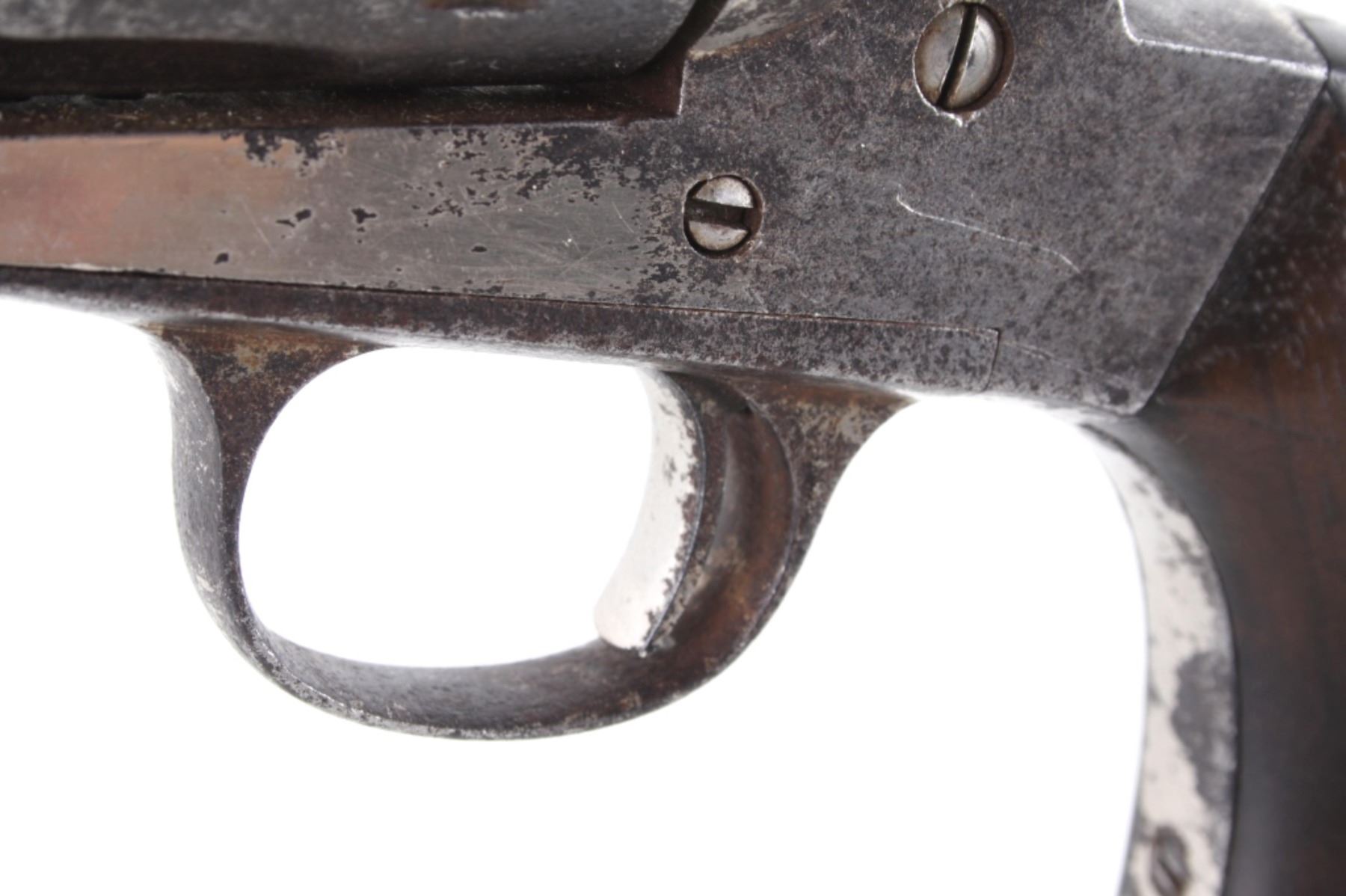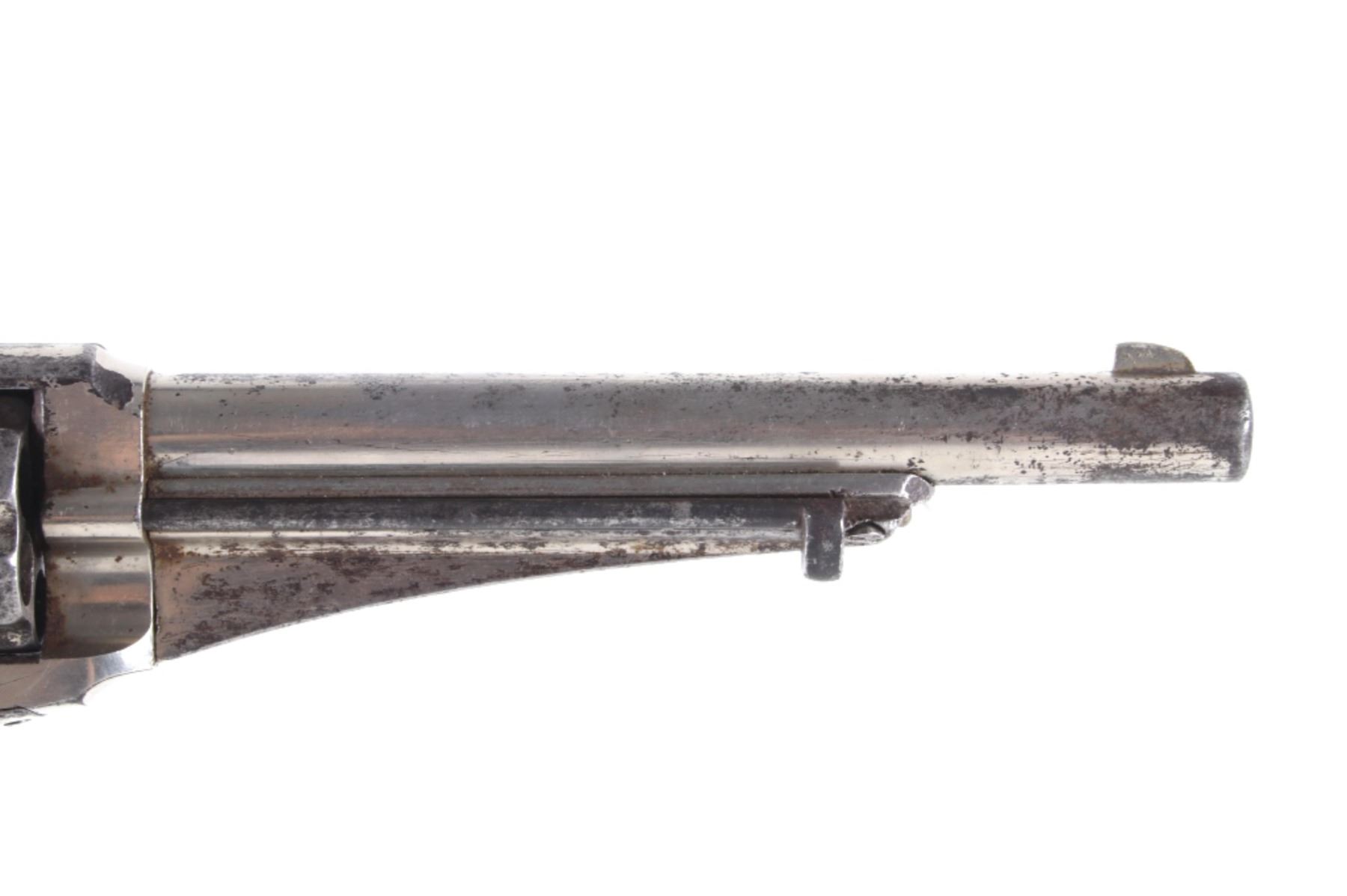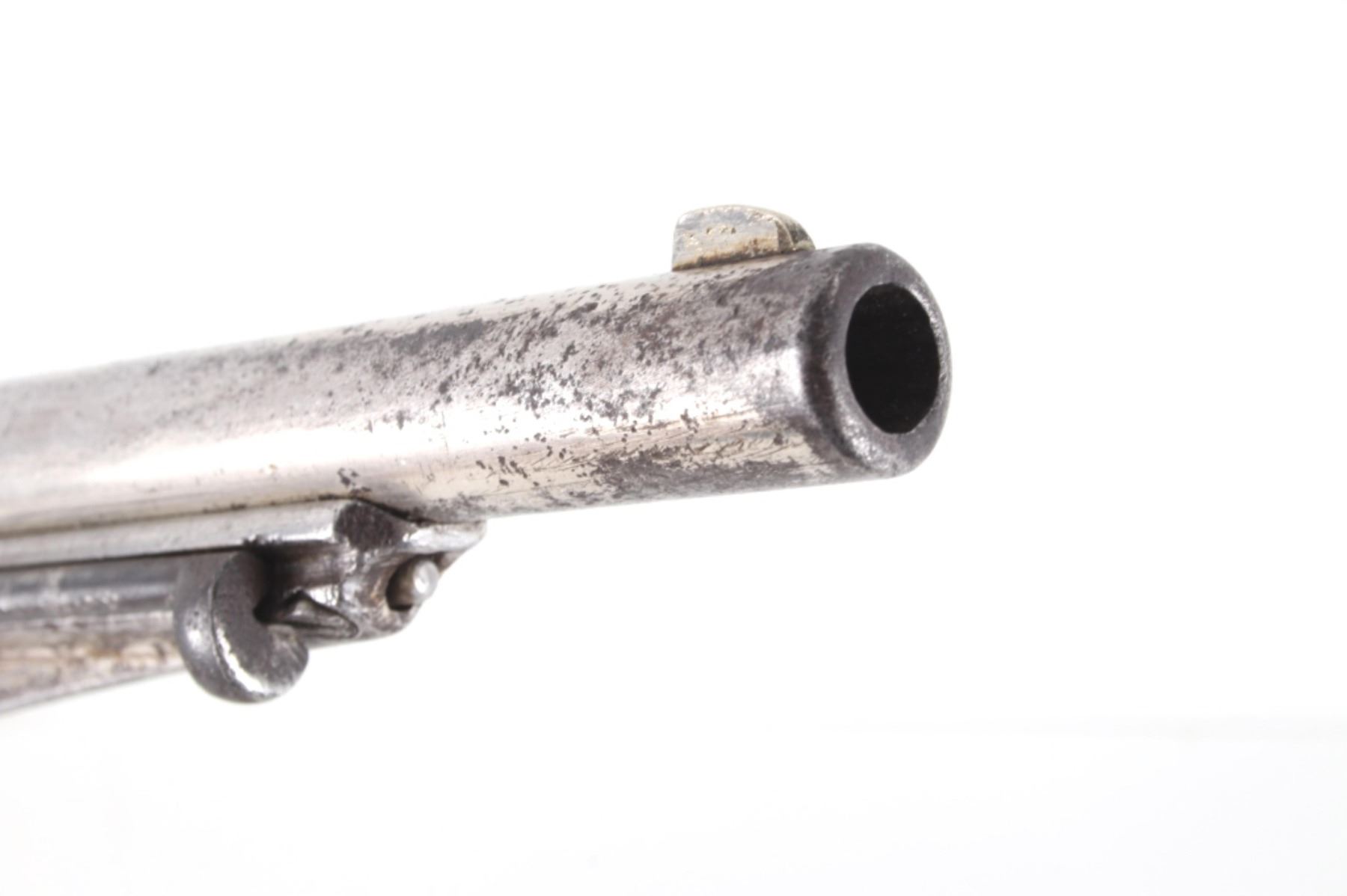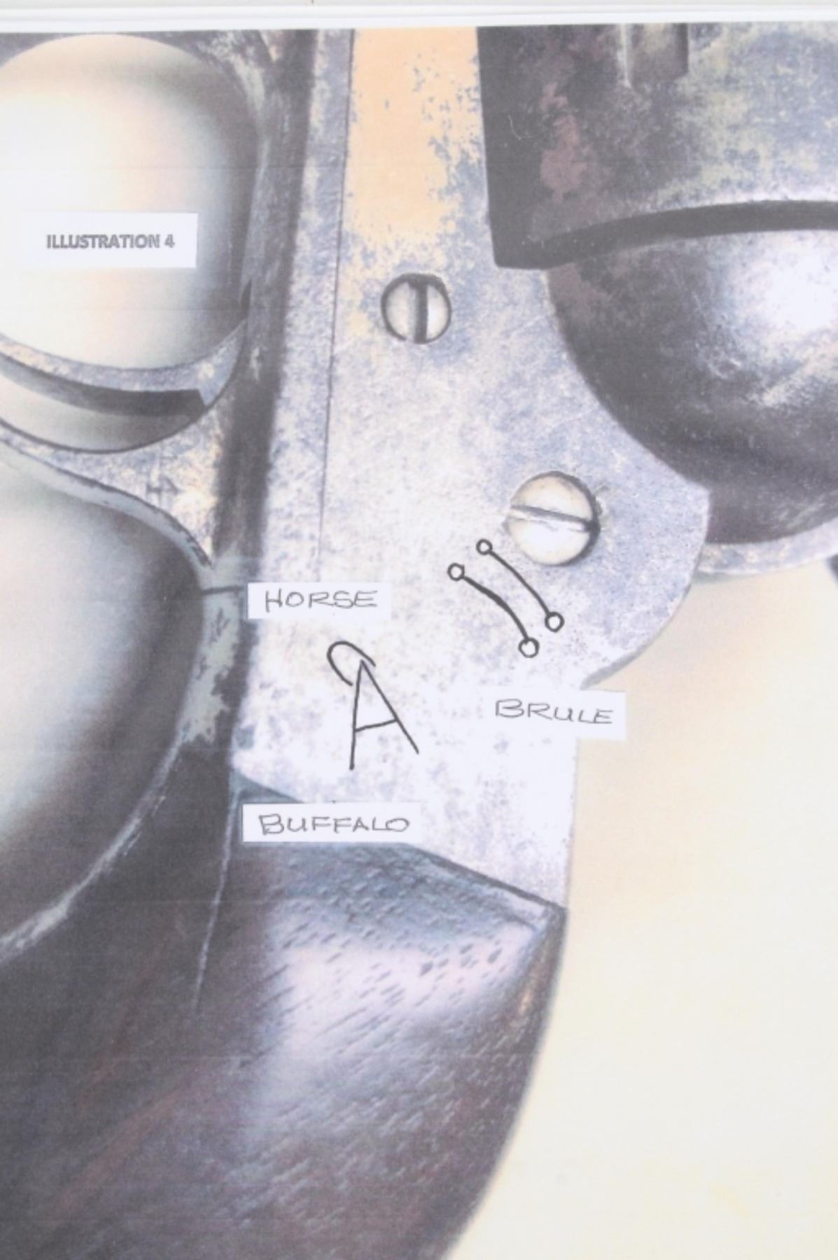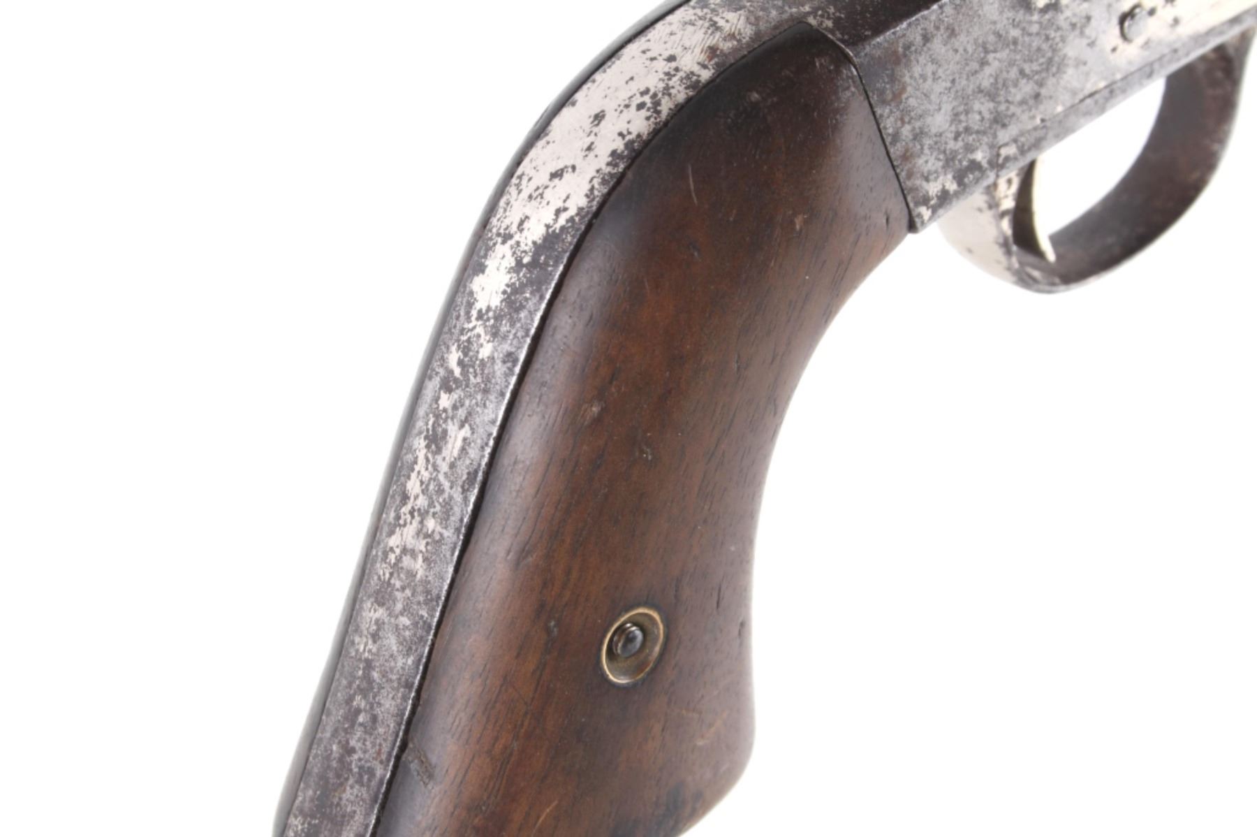 This is an original Remington Model 1875 Single Action Army revolver, serial number 33 which was attributed to being in the U.S. Interior Department Order #5777 shipment in 1883 to the Rosebud Indian Agency and issued to Rosebud Agency Police member Buffalo Horse, a Brule Lakota Sioux. This example has been reviewed and comes with paperwork from The Guns of History with the Rosebud Agency Police information and illustrations of the Buffalo Horse markings on the gun. The revolver exhibits a factory nickel finish with two-piece factory walnut grips and 7 ½ inch round barrel marked in a single line, “E. REMINGTON & SONS ILION N.Y. U.S.A.”, with a six-shot fluted cylinder and is chambered in .44 Remington cartridge. It is well documented that in 1883 Remington accepted a contract and delivered approximately 639 nickel plated guns to the United States Interior Department for issue to Indian Police and other Western reservations, such as the Rosebud Agency and Pine Ridge Agency. There are two other examples of nickel plated Remington 1875 revolvers that have sold over the years that were also attributed as being in this shipment, the Remington 1875 serial number 718 shipped to the Indian Police on the Pine Ridge Reservation in South Dakota Territory by the U.S.I.D. in 1883 which sold at auction by Heritage in June 2022 for $15,000 (w/ bp) and the U.S.I.D. marked Remington 1875 in nickel serial number 412 which was mentioned as being part of the shipment and sold at Morphy in their April 2019 sale for $5,760 (w/ bp). It is noted that once the Remington 1875’s reached serial number 12,000 they reverted back to serial number 1. This revolver was examined by The Guns of History, Wendell Grangaard and found to have Togia Lakota language marks across the gun including Buffalo Horse, Rosebud, Buffalo Horse Brule as shown on illustrations 1 through 4. Buffalo Horse was a Brule Lakota Sioux, born in 1827. He grew up with Hollow Horn Bear and was a member of Hollow Horn Bear’s Band of Sicangu Orphan Band of the Brule Lakota. The two fought during the Indian Wars at Little Bighorn and followed Sitting Bull into the Big Horn Mountains, later turning to the Spotted Tail Agency where they surrendered in the early summer of 1876 (Buffalo Horse and Hollow Horn Bear). Later Spotted Tail Agency was established as Rosebud Agency and Hollow Horn Bear was appointed the head of the Indian Police force with Buffalo Horse becoming one of the officers under his command. In June 1883, under the authority of Order Number 5777, thirty Remington 1875 Revolvers were issued to the Rosebud Agency Police Force in Dakota Territory from the U.S. Interior Department shipment, with this serial number 33 believed to be issued to Buffalo Horse and carried during his service. Marked under the grips with serial number 33 and on the trigger guard 44, for .44 caliber. Comes with the Guns of History paperwork and illustrations. Antique firearm NO FFL.