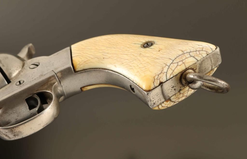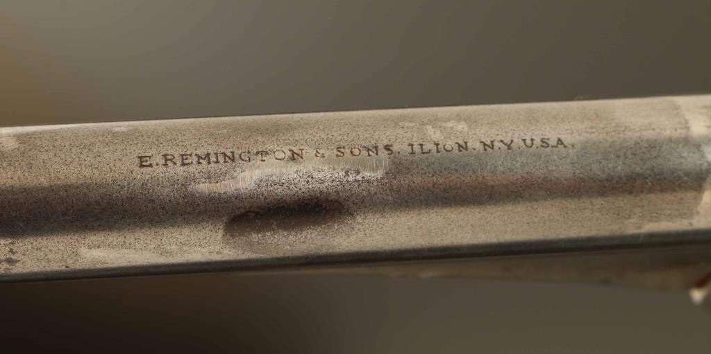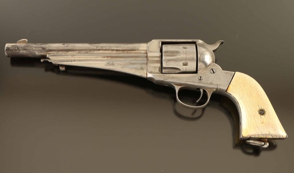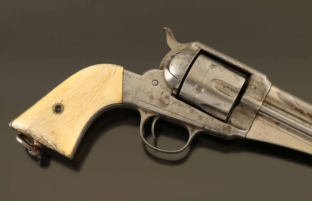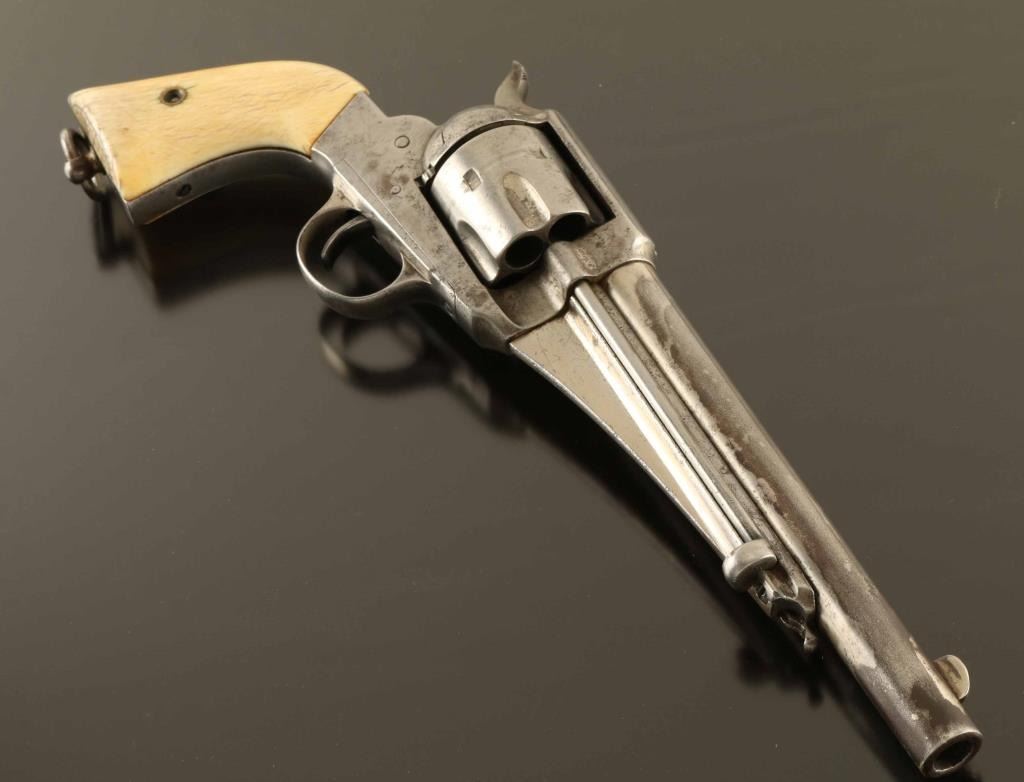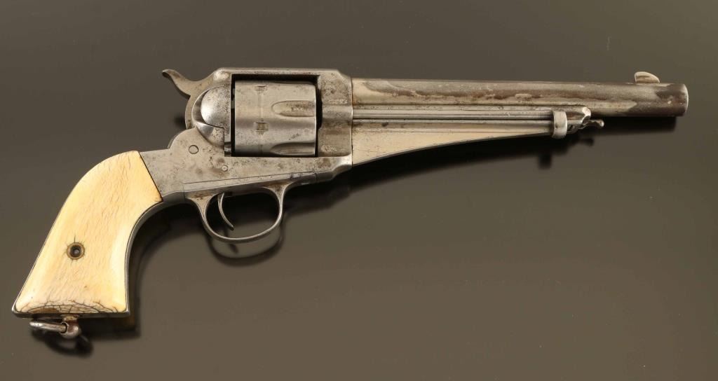 .44 Cal SN: 285 Antique single action revolver formerly gifted from Michael Wayne to Tom Kane, a Bat Jac employee and script writer for the Wayne Production Company. Prior to his death, John Wayne and his son Michael would taunt Tom Kane with this revolver alleging history of it belonging to Poncho & Trinidad Villa and that it had been gifted to John Wayne by a relative of Villa in the early days. Sold previously at our May 2007 auction for $8,000.00 hammer price. Features a nickel plated finish, 7 1/2" barrel, ejector rod with large webbed housing, blade front sight, 'u' notched rear sight, fluted six-shot cylinder, smooth wide trigger, knurled hammer spur with cone shaped firing pin, no observed caliber designation, monolithic frame/grip frame with lanyard ring on the butt and two-piece smooth ivory grips. Revolver retains nearly 30% of it's original nickel plated finish with the balance of the metal surfaces displaying a smooth aged grey patina. Action is sound , the bore good with some scattered pitting, markings are very good and the period ivory grips are very good with age. Condition is NRA Very Good. ***Antique Firearm***