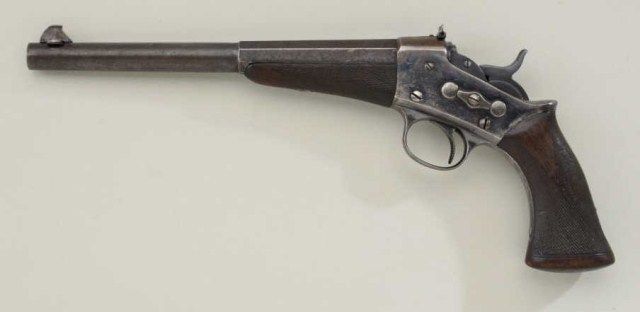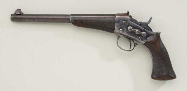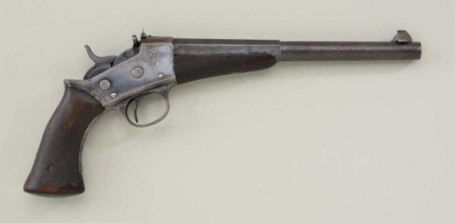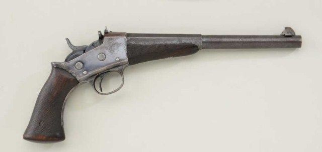 Remington 1901 Target Rolling Block pistol, .22LR cal., 10” half round/half octagon barrel, blue finish, checkered wood grips, #2994. This gun is in overall very good condition showing approx. 30% original blueconfined primarily to the frame with balance of gun gone to a grey patina with scattered spots of erosion and pin prick pitting; crisp action, thumb lever on breech block is offset horizontally in order to be clear from the line of sight, adjustable rear sight, good bore, overall good wood grips and fore end that show even wear and scattered old mars from storage; only 735 made between 1901 and 1909 per factory records and the last of the rolling block handguns produced after a run of 44 years. Est.: $1,250-$2,500.