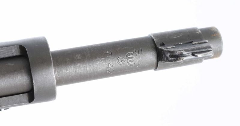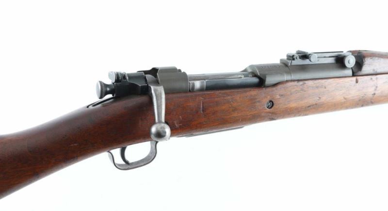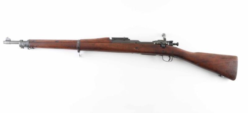 US WWII era military bolt action rifle manufactured circa 1942. Features parkerized finish, walnut shoulder stock with straight wrist, walnut handguard, 24" barrel, blade front sight, ladder type rear sight mounted at rear of barrel, bent bolt handle, manual safety, magazine cut-off switch, sling swivels, stacking swivel, butt trap with hinged cover, checkered flat steel buttplate. Rear barrel band (and forward sling swivel) are stamped. Bore is fair to good condition, fairly bright towards breech with darker appearance and pitting towards muzzle. Retains 75% finish, turning thin & brown on bottom metal, with bare metal visible where moving parts rub, on edges and corners. Small flat spots appear filed or ground on bolt knob. Stock is good serviceable condition, some oil staining, dents & dings throughout. Barrel marked "RA / (flaming bomb) / 7-42". Stock markings include "P" in circle. Condition is NRA Very Good *** C&R Firearm ***