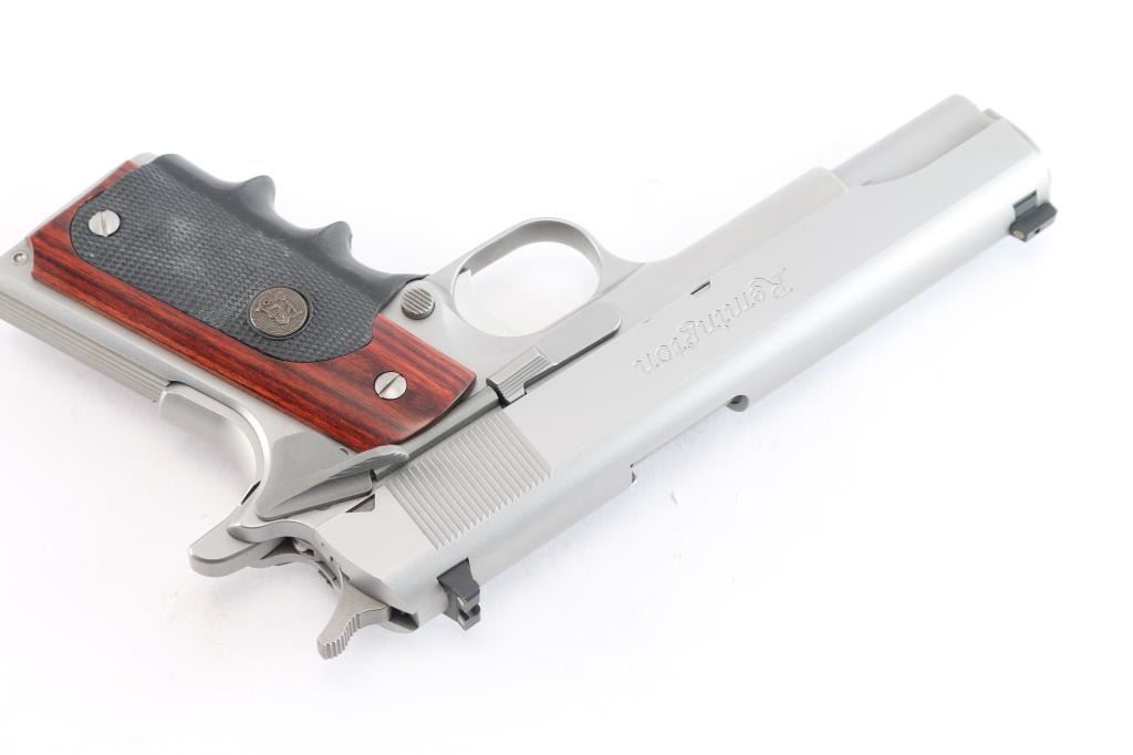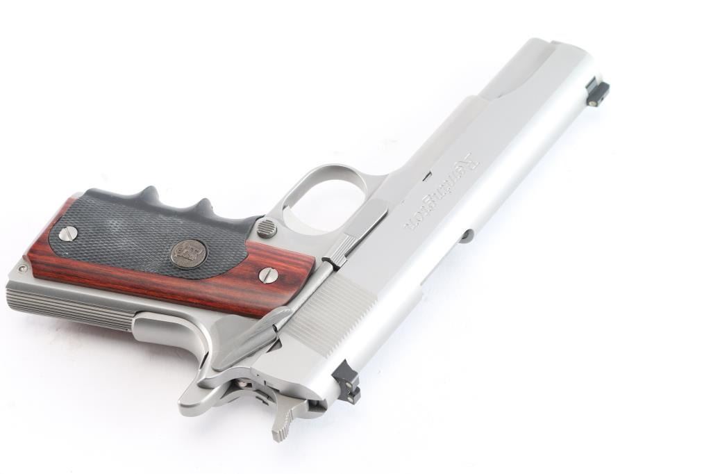 All stainless steel 1911 style single action semi-automatic pistol. Features a satin finish, 5" barrel, dovetailed three-dot sights with drift adjustable rear sight, serrated trigger, serrated hammer spur, thumb safety, grip safety, push button magazine release, serrated flat mainspring housing and Pachmayr rubber and rosewood grips. Pistol exhibits minor handling marks. Action is strong, bore is excellent and grips are fine. Includes the original factory hard case with lock, take-down tool and (11) magazines.