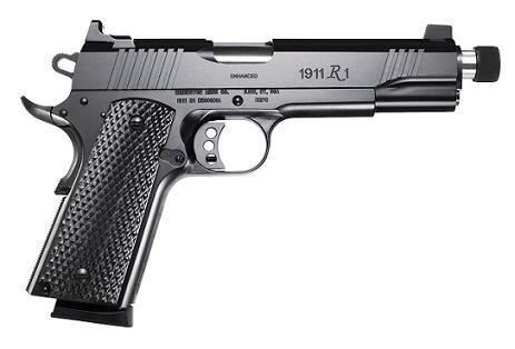 FAMILY:1911 Style Pistol Series MODEL:1911 R1 Enhanced Threaded TYPE:Semi-Auto Pistol ACTION:Single Action FINISH:Satin Black Oxide STOCK/FRAME:Steel Frame STOCK/GRIPS:Enhanced Black/Pewter Laminate CALIBER/GAUGE:45 ACP CAPACITY:8+1 # OF MAGS:2 MAGAZINE DESC:8 rd. BARREL:5" OVERALL LENGTH:9" SIGHTS:Tall Two-Dot Sight System ADDL INFO:Threaded Muzzle ADDL INFO:Blackened Trigger ADDL INFO:Stainless, Match Grade Barrel