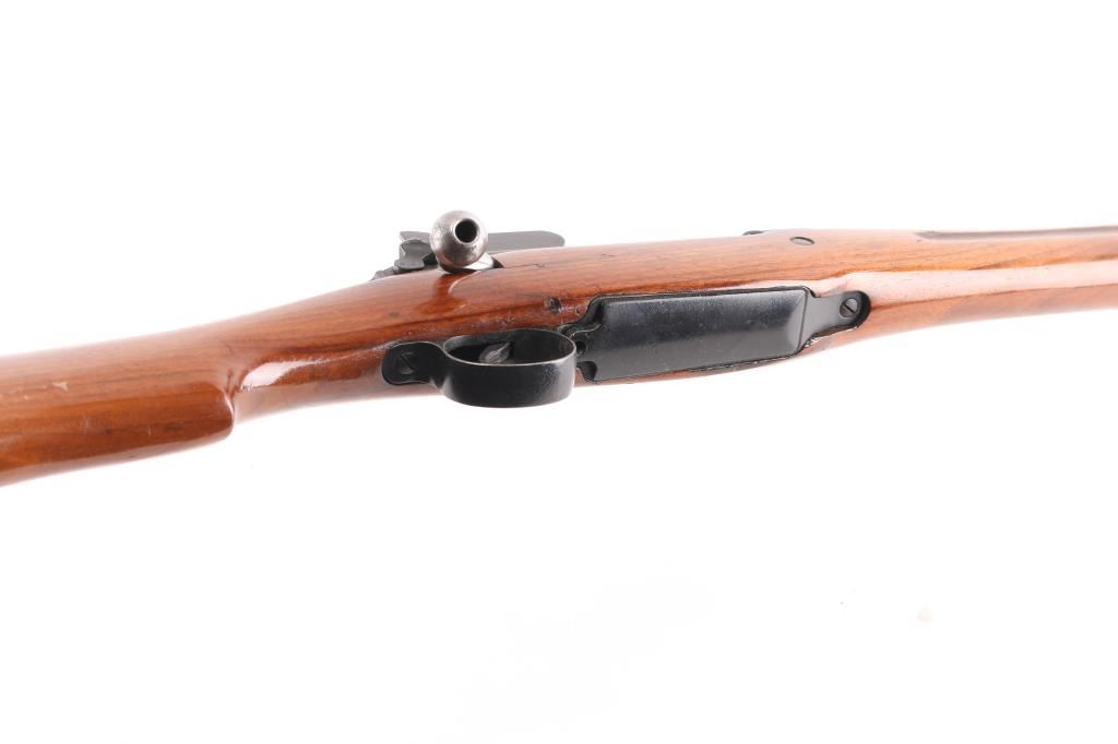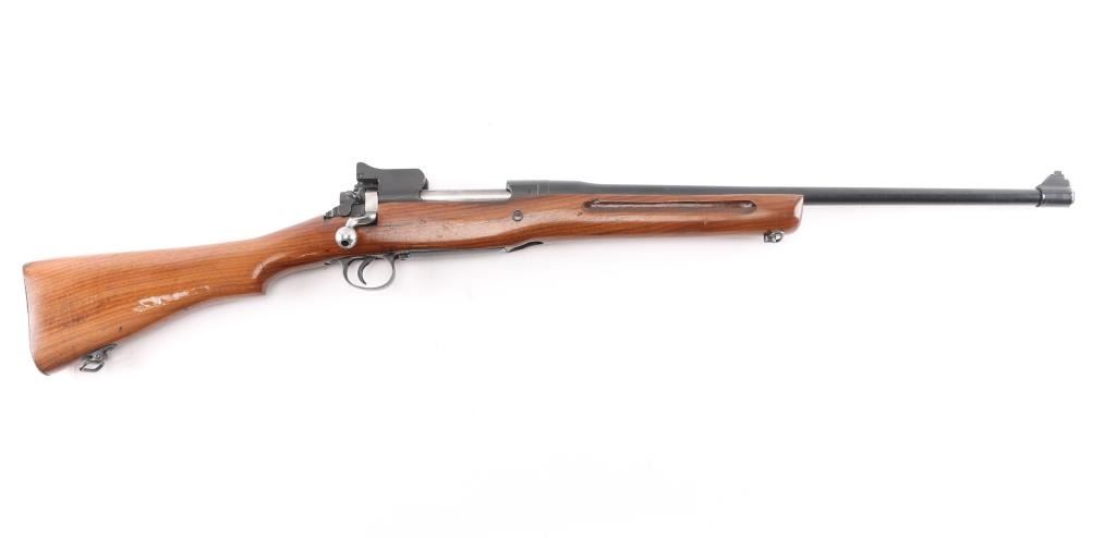 Sporterized US military bolt action rifle. Features blued finish, original wood military stock reworked to sporter configuration, 24.5" barrel, raised blade front sight, original rear sight, manual safety, polished bolt, & dog-leg bolt handle, hollow bolt knob. Stock retains finger grooves on forend, original steel buttplate. Bore is good overall, bright with some light frosting. Retains 97% dark re-blue, some plum color on harder parts, rubbing wear on bolt, handling marks. Wood is very good as modified, refinished, with scratches & scrapes.