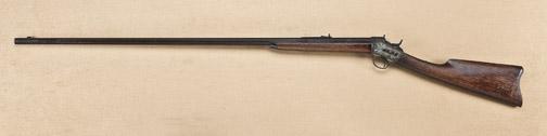 Remington #2 Rolling Block sporting rifle, .32 rimfire caliber, factory extra-long 36” medium weight octagon barrel, brown patina finish, serial #16468. The rifle shows strong traces of original blue and case hardening mixed in with a browning grey patina, some scattered light to moderate erosion and pitting, nothing severe. The barrel address is good, the patent markings on the frame are visible. The stocks are good with some wear at the comb, some minor losses, normal use and handling, original buttplate is retained. The action is good, the bore is dark. The only 36” barrel known to this cataloger. Est: $2,000 - $3,000