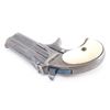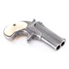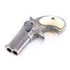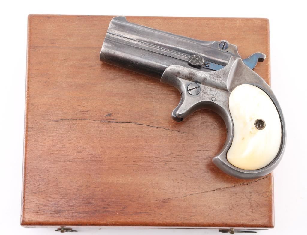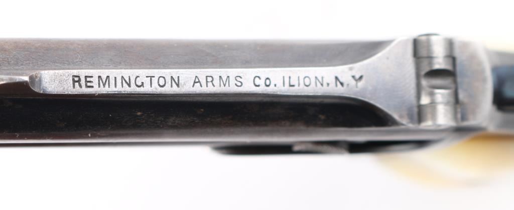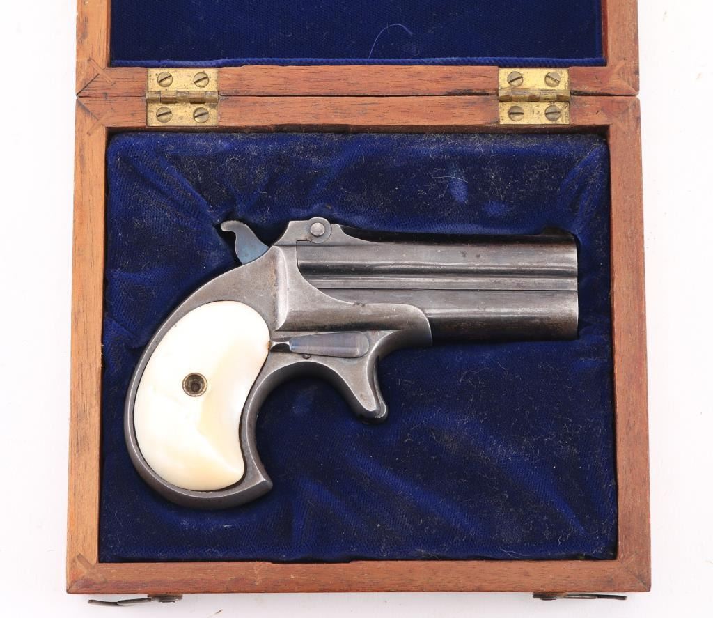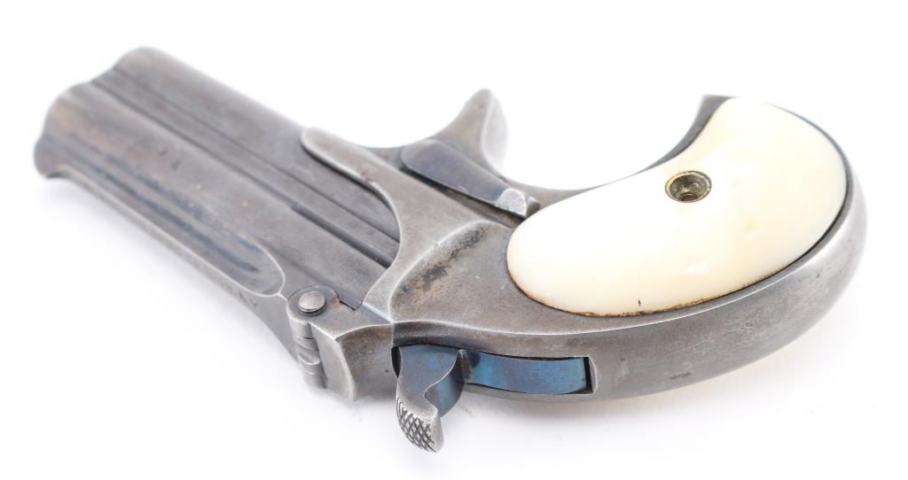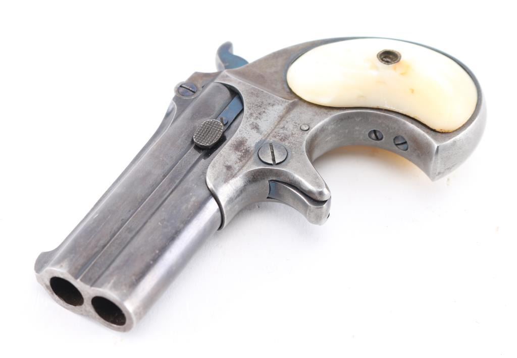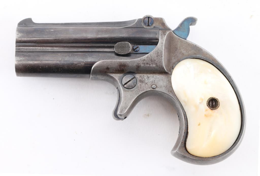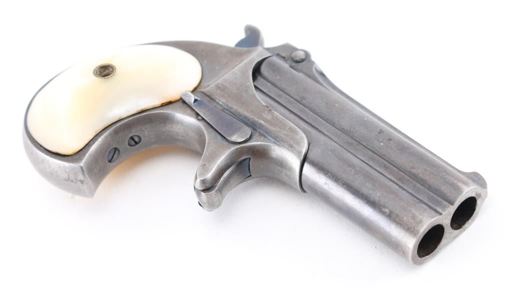 Vintage over/under double barrel derringer chambered in .41 Rimfire Short, manufactured circa 1888-1911. Features a nickel blue finish, 3" barrels with solid sighting rib marked "REMINGTON ARMS CO. ILION, N.Y", fixed blade front sight, 'u' notched rear sight, smooth spur trigger, knurled hammer spur, manual extractor, auto-rotating barrel selector, steel frame and two-piece Mother of pearl grips. The derringer displays about 50% blue finish, mostly on the barrels, frame is mostly in the white from handling, traced in protected areas. Action is sound, the bores very good/bright, the markings are good and the grips are very good. Comes in a form fitted. blue felt lined wood case. Condition is NRA Fine Antique Firearm.