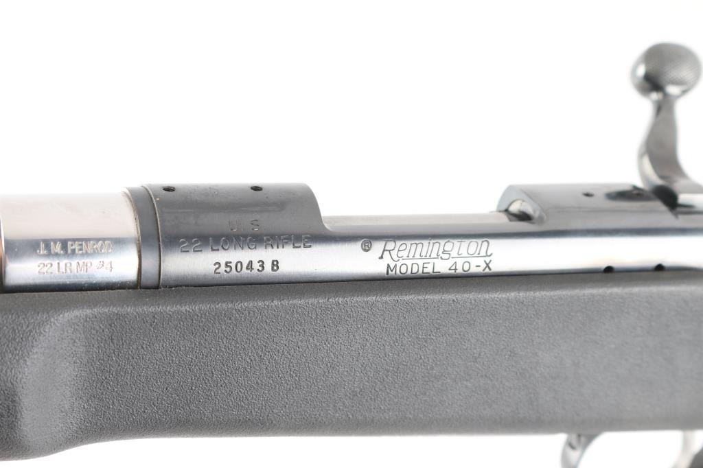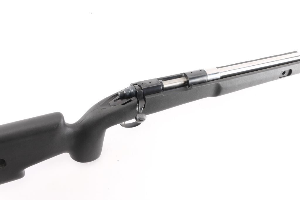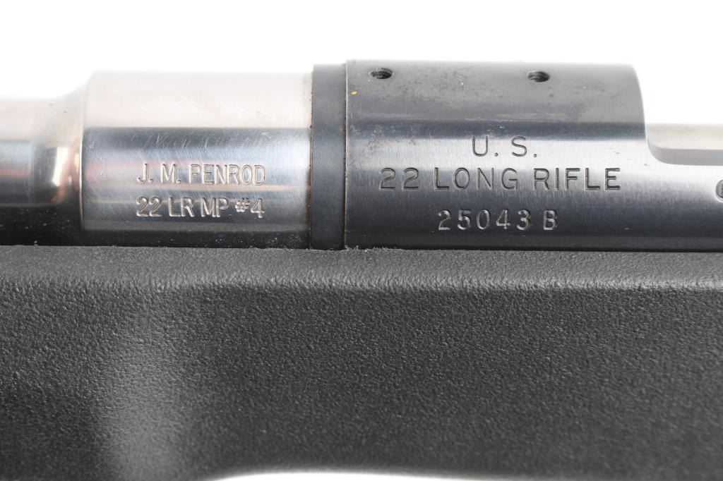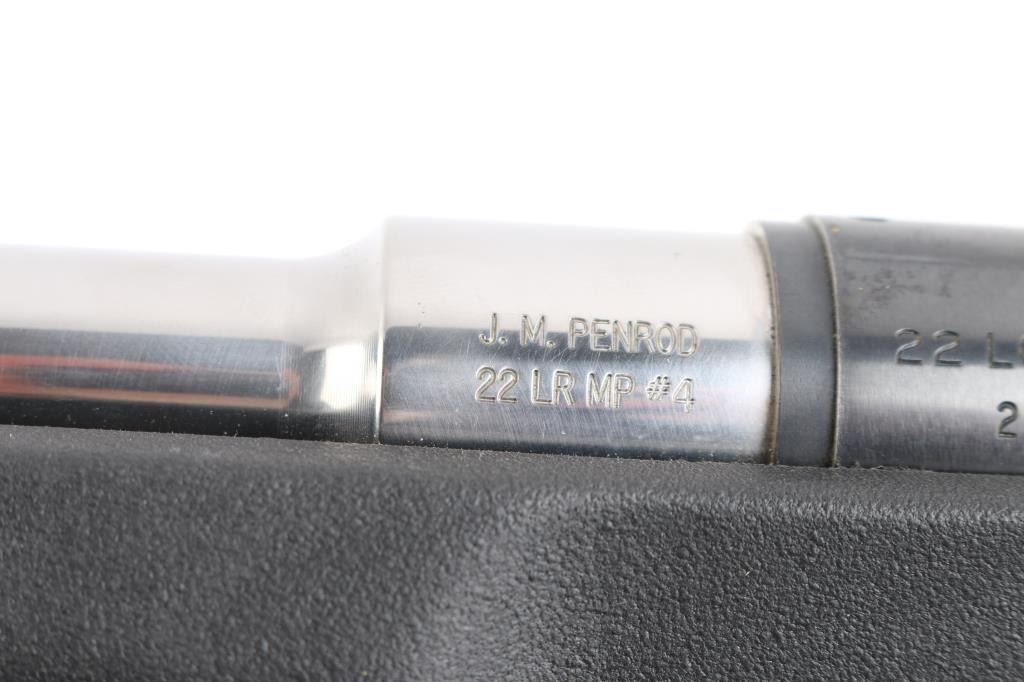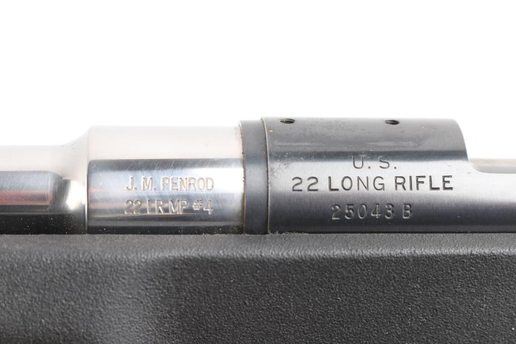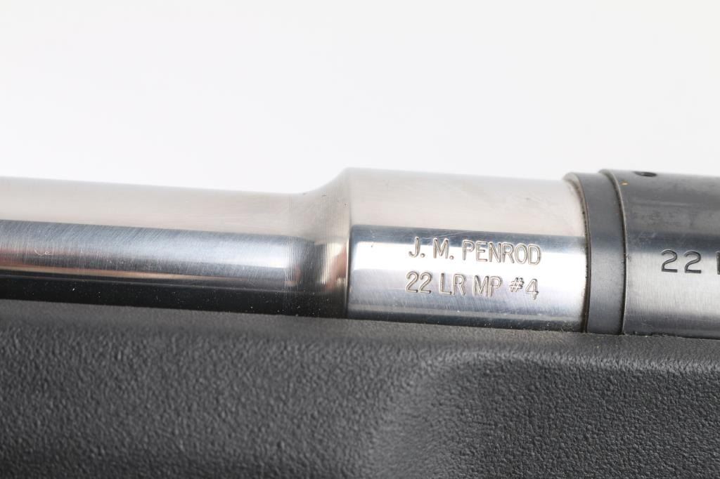 Single shot bolt action rimfire target rifle features blued finish receiver, tapped and drilled for optics, 26" Stainless "J.M. Penrod 22 LR MP #4" free floating heavy bull barrel, smooth curved trigger with a featherweight pull, black synthetic Choate Tool semi-pistol grip stock with a vented rubber buttpad and a swivel rail under the forearm, no safety. Bolt release forward of trigger, knurled bolt knob. Comb slotted for bolt. Bore is in very good condition, slightly dirty. Retains 90% finish with handling marks and edge wear mostly on the trigger guard. Stock has little to no marks, scrapes and or scratches.Condition is NRA Very Good+*** Modern Firearm ***