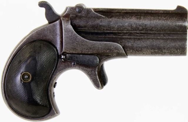 Remington .41 cal. SN1XXover under dennger with 3" barrels, blued finish and hard rubber checkered grips, condition is fair to good, retaining 5-10% blue, the remainder silver gray, hinges are unbroken, action and bore good. Est. 300-500