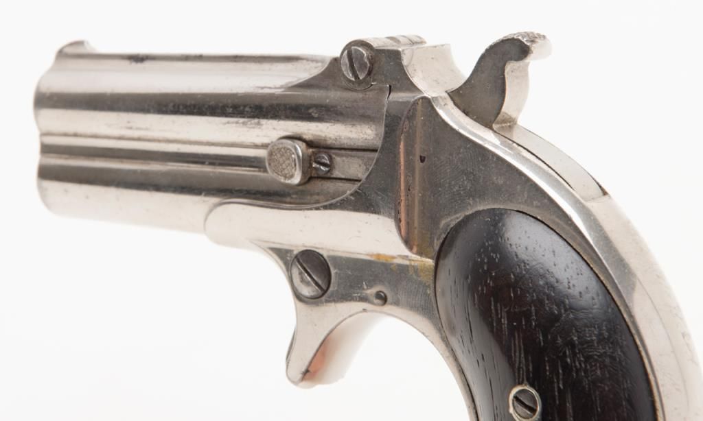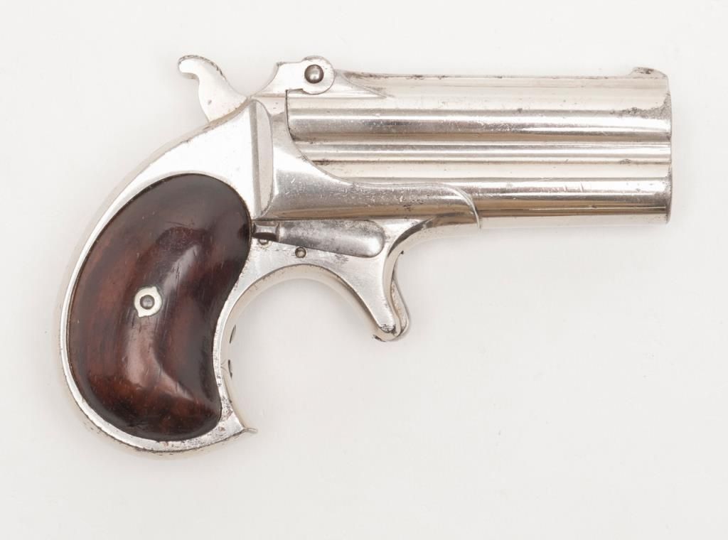 Remington 41 cal over and under derringer with 2 line “E. Remington” address, rose wood grips, serial #4971. The derringer remains in very good plus original condition showing 85-95% original nickel drifting at the high points and edges withsome minor aging just starting. The nickel is unpolished and a nice satin color. The markings are sharp, there are a few areas of minute pinprick pitting. The grips are very good with slight edge wear. The hinge is unbroken andgenerally very good overall. A better than average early frontier era Remington O & U that we would rate as an 8 plus on 1-10 scale. Est.; $1,400-$2,800.