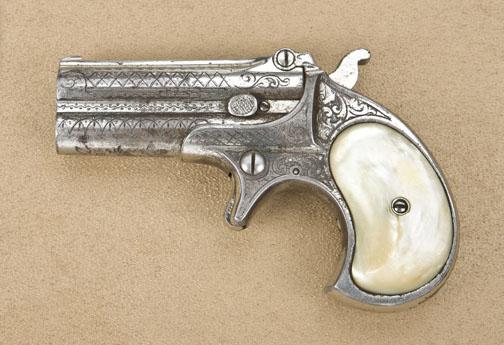 Remington .41 caliber over/under derringer, type-2, two line “E. Remington & Sons” address, reversed to read from breech to muzzle, or left-handed, with ejector, serial #2527. The pistol shows period New York style engraving with scrolls, geometrics and florals on bottom of barrel which are absolutely genuine to the 19th century. The derringer shows approx. 60-70% nickel plated finish with good thick pearl original grips.The areas where the nickel have lifted have gone to a patina with just slight erosion and beginning age. The hinge shows a slight crack on the left side which is hairline. The metal surfaces are completely uncleaned, the markings are sharp, the bores are slightly rough. The engraving is more deluxe and profuse than normally found, and the backwards address is intriguing. Similar to example pictured in Remington DoubleDerringer by Drummond, Johnson, & Etc. Page 89. Est: $2,500 - $5,000