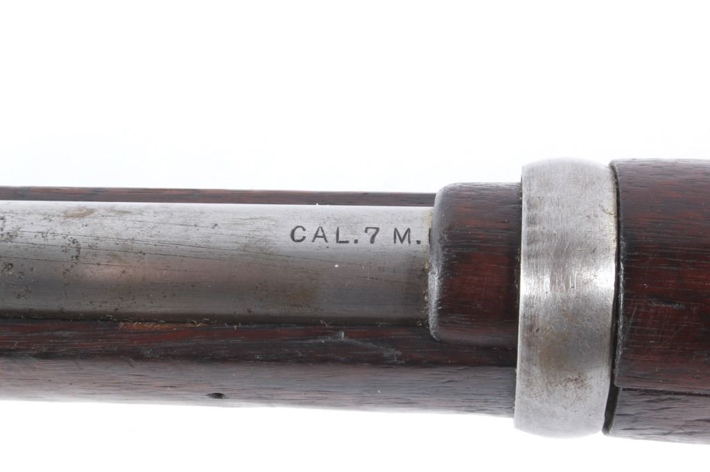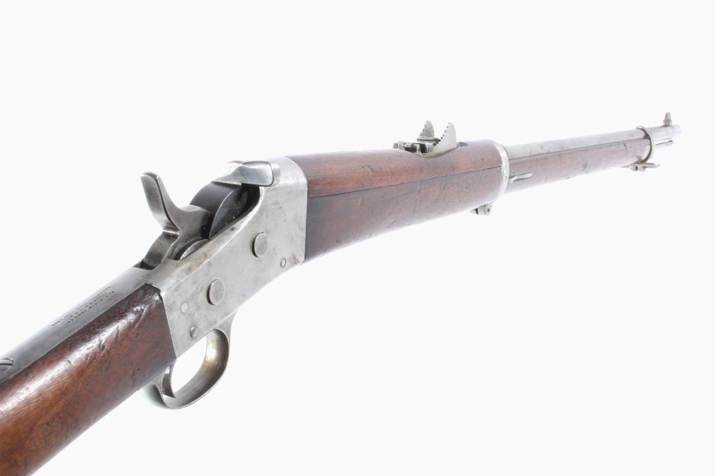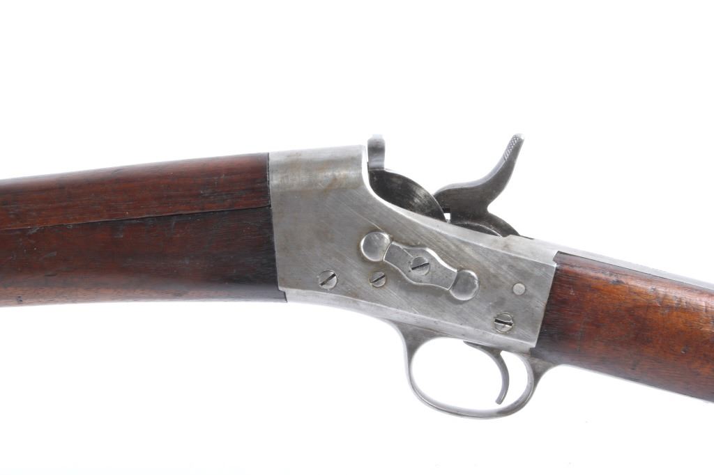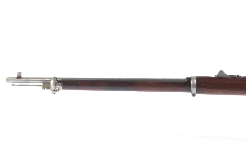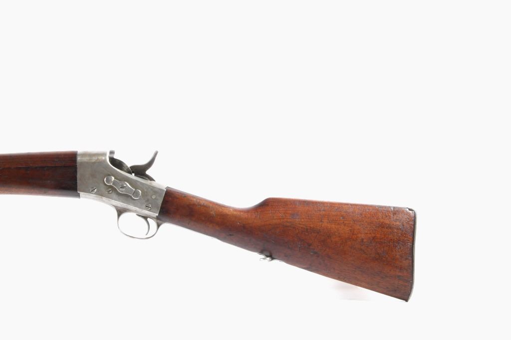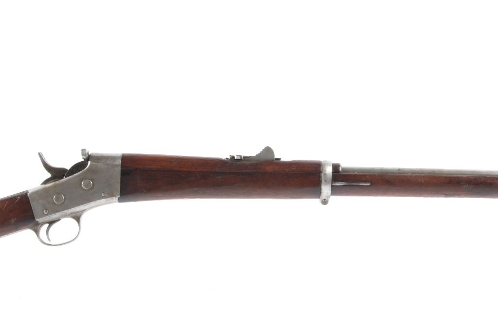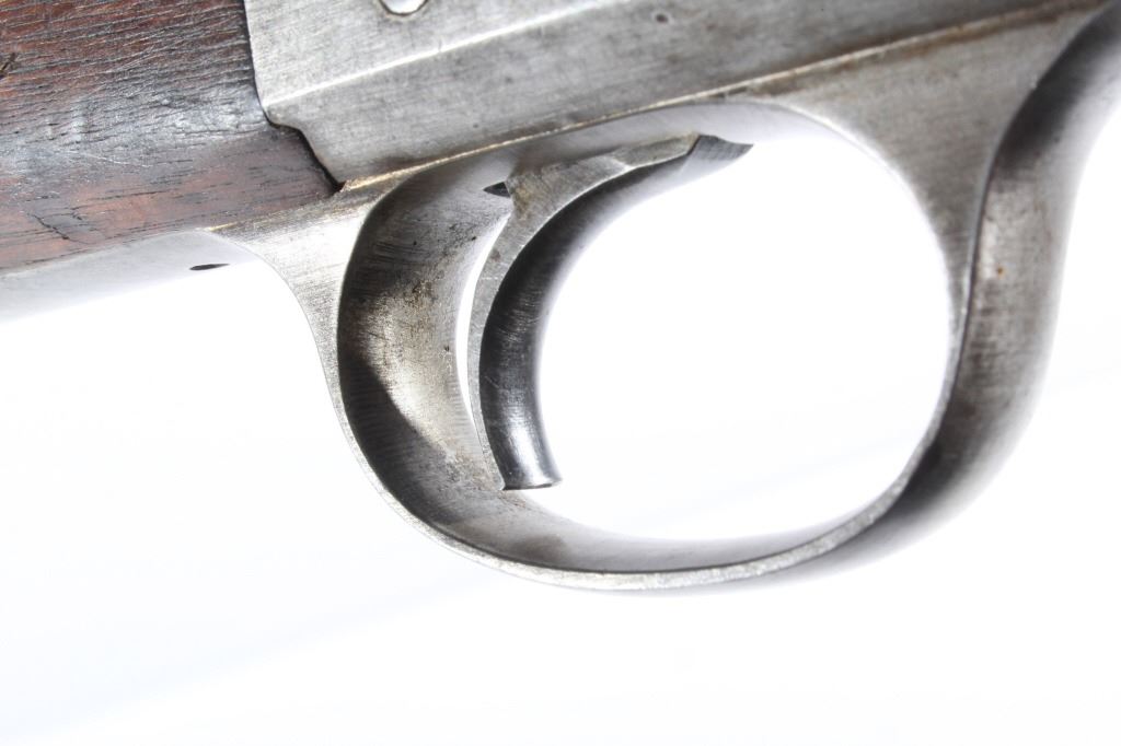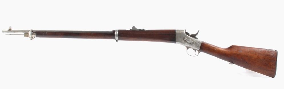 Offered for sale is a Remington #5 Model 1901 7x57 Rolling Block Rifle. The rifle features a 30" barrel, walnut stocks, adjustable rear sights, cleaning rod, and blue'd finish. These fine single shot rifles were the last of the famed Rolling Block action arms made by Remington. They were made on the large frame smokeless powder No.5 action. Considered the best and strongest of the type, these muskets were especially popular in all Spanish speaking countries from Mexico down through South America where the 1895 Mauser was the standard rifle in 7mm chambering. This model weapon was also very popular during the Mexican Revolution on both sides of the border. The 7 MM Mauser was the caliber that the Spanish used so successfully in Cuba during the Spanish-American War that led to the U.S. developing the famed .30-06 Springfield rifle. The rifle shows good condition with handling marks and much of the finish worn off. The mechanics are tight and smooth, with a bright bore with strong rifling. This is a Curio & Relic firearm. FFL transfer or NICS background check required. The serial number is 618904.