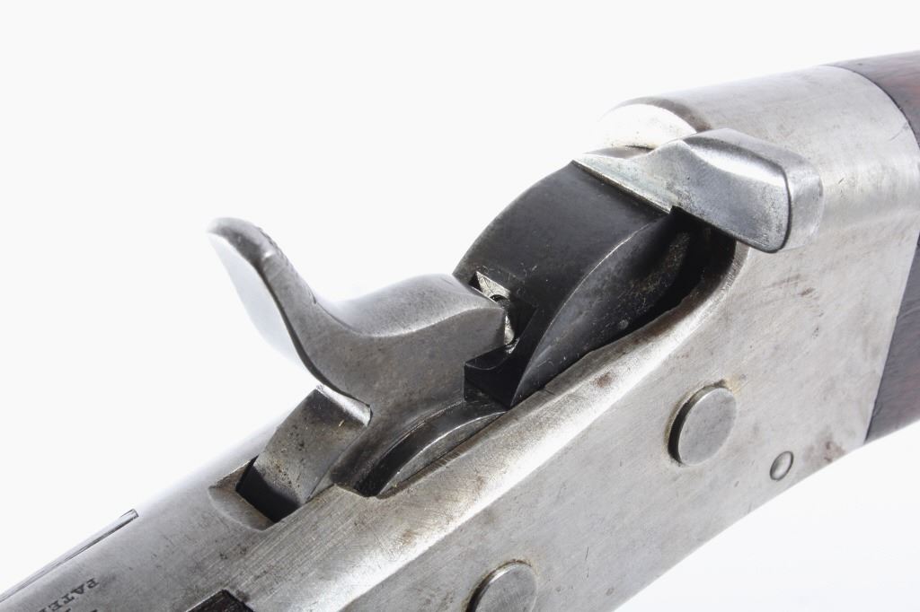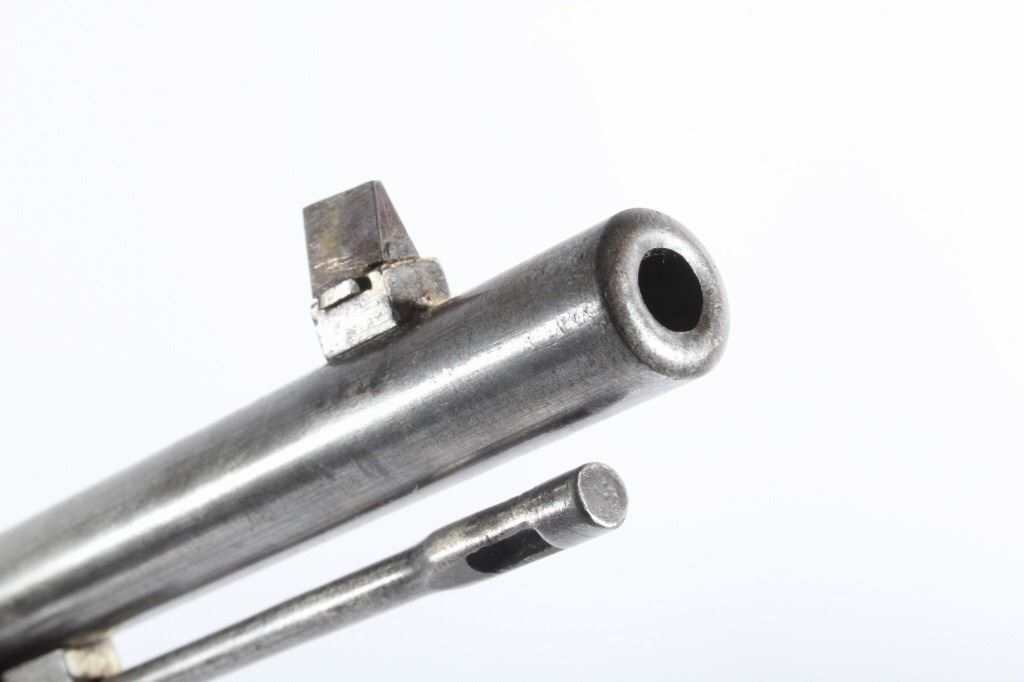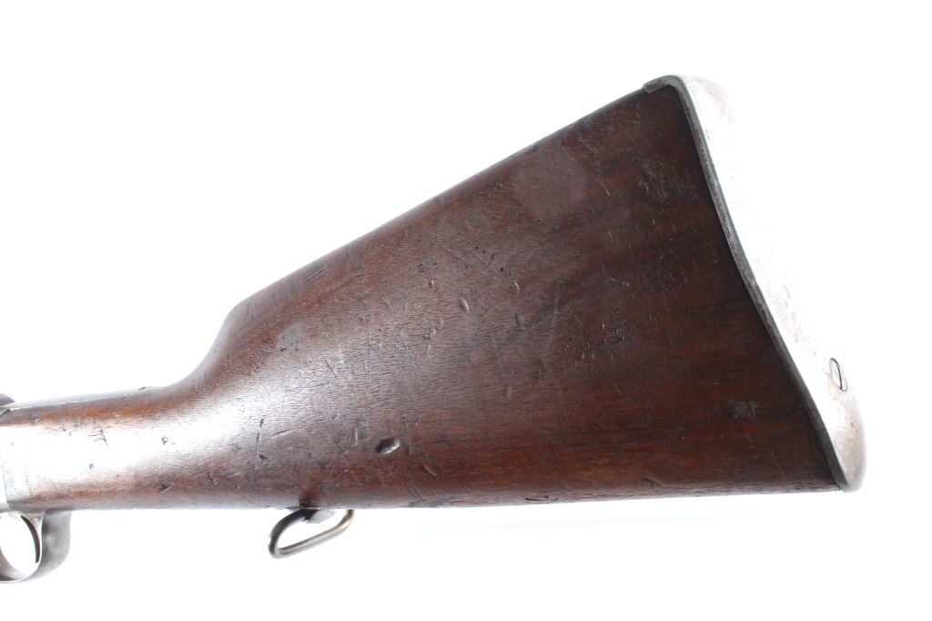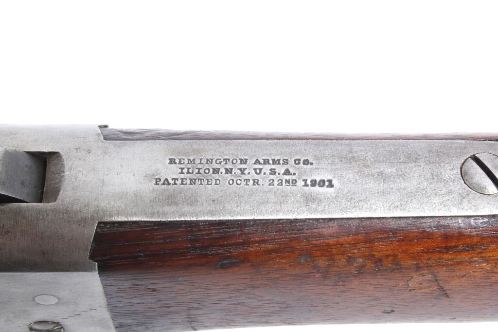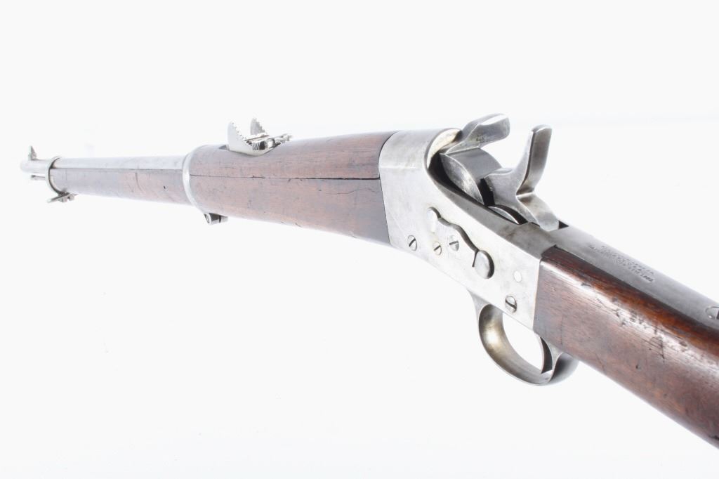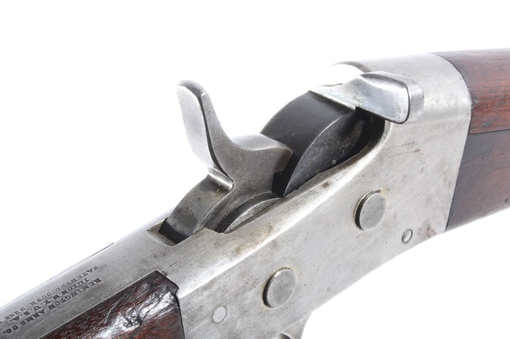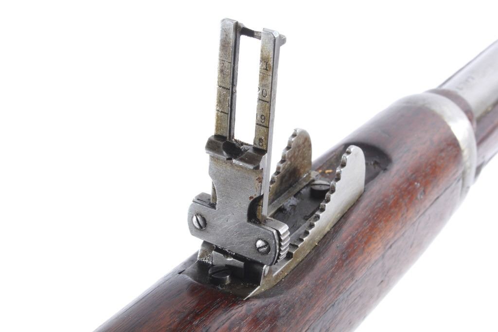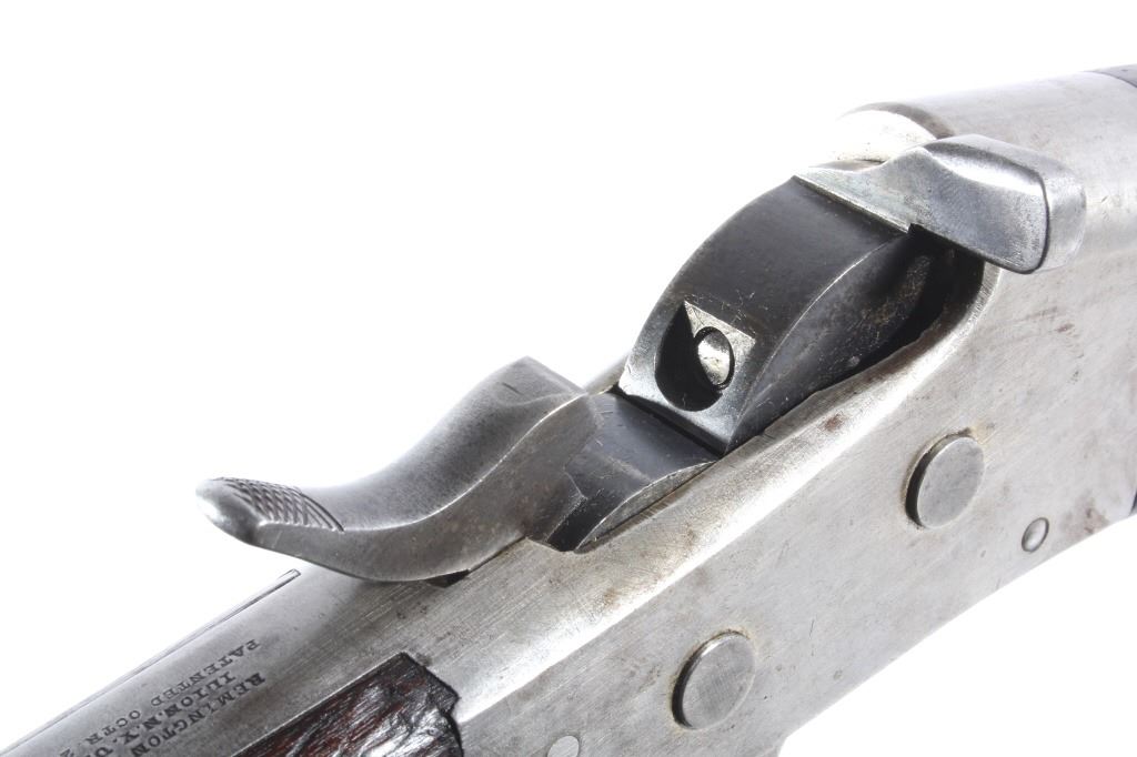 Offered for sale is a Remington #5 Model 1901 7x57 Rolling Block Rifle. The rifle features a 30" barrel, walnut stocks, adjustable rear sights, cleaning rod, and blue'd finish. These fine single shot rifles were the last of the famed Rolling Block action arms made by Remington. They were made on the large frame smokeless powder No.5 action. Considered the best and strongest of the type, these muskets were especially popular in all Spanish speaking countries from Mexico down through South America where the 1895 Mauser was the standard rifle in 7mm chambering. This model weapon was also very popular during the Mexican Revolution on both sides of the border. The 7 MM Mauser was the caliber that the Spanish used so successfully in Cuba during the Spanish-American War that led to the U.S. developing the famed .30-06 Springfield rifle. The rifle shows good condition with handling marks and much of the finish worn off. The mechanics are tight and smooth, with a bright bore with strong rifling. This is a Curio & Relic firearm. FFL transfer or NICS background check required. The serial number is 618904.
