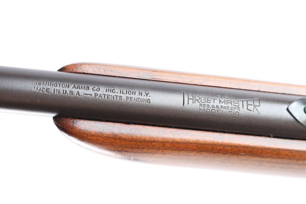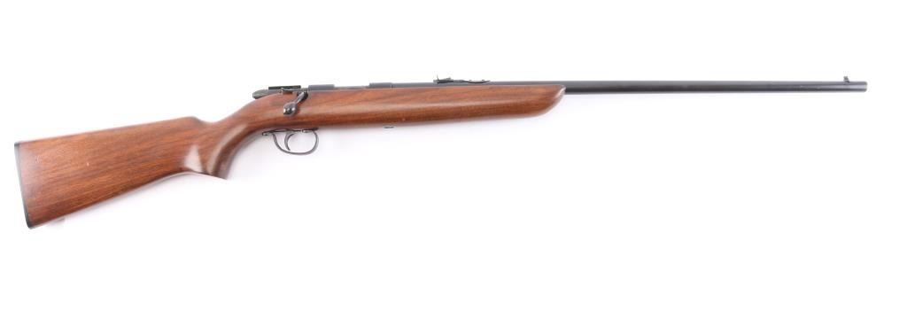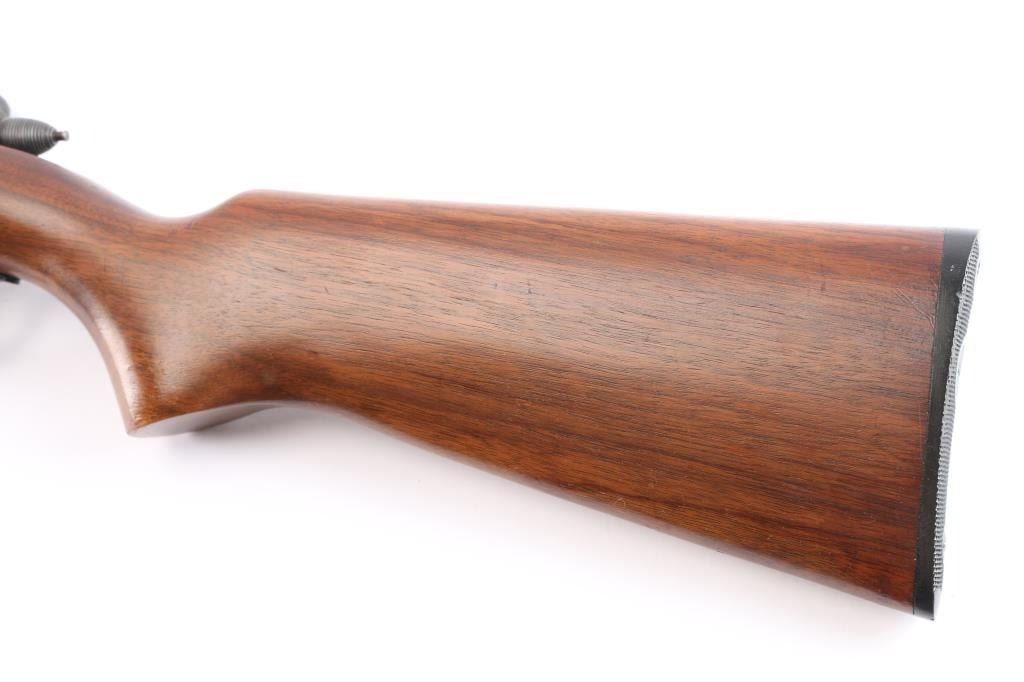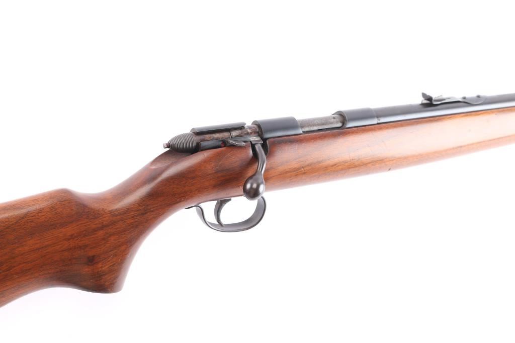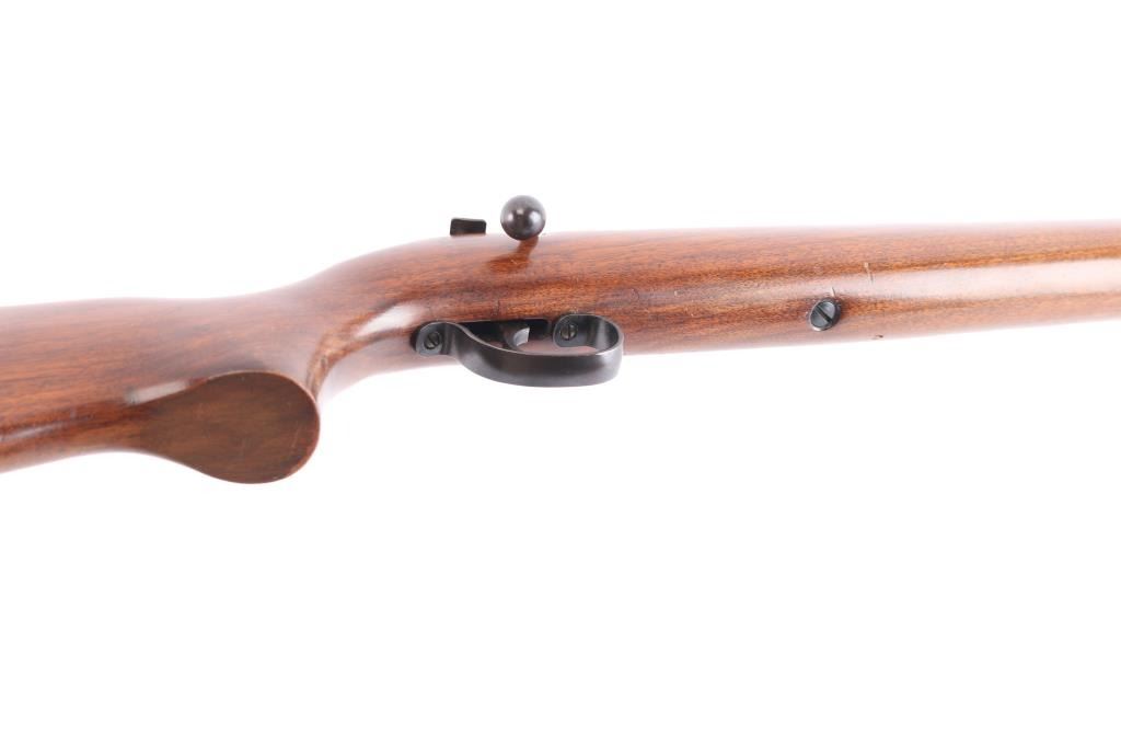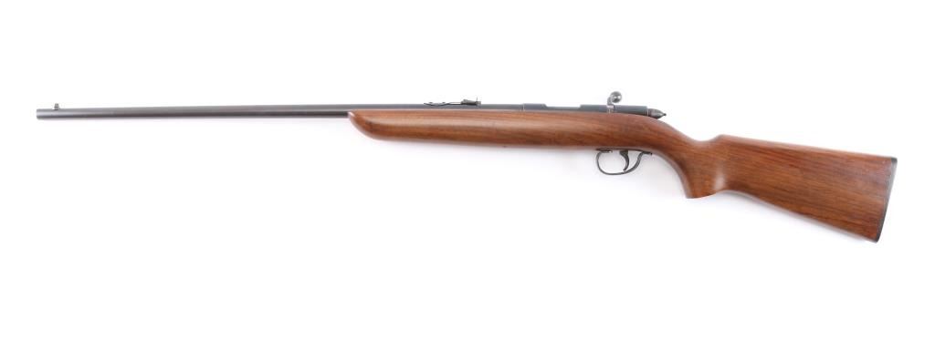 NVSN. Vintage 'Target Master' Bolt action single shot rimfire rifle features blued finish, wood semi-pistol grip stock, 25" barrel, blade/bead front sight, elevation adjustable rear sight. cocking indicator, manual safety. Manufactured 1941. Bore is excellent/bright. Blued surfaces are very good, have dulled over time. Wood is very good with minor scratches.