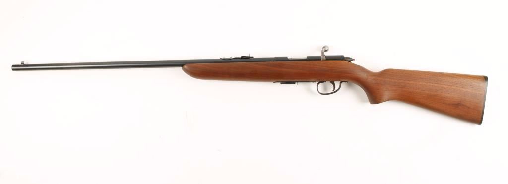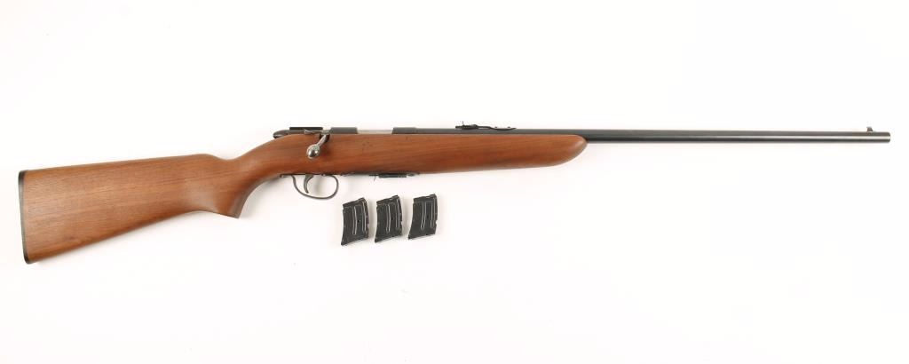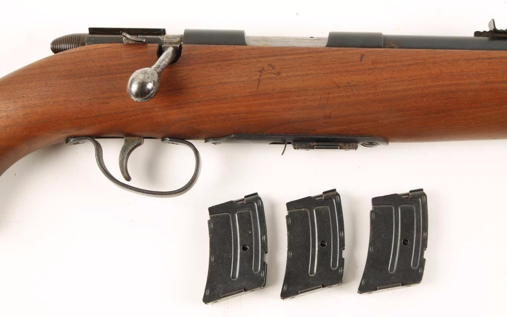 NVSN Bolt action magazine fed sporting rifle chambered in .22 caliber, circa 1949. Features a 25" blued barrel, front blade sight, rear adjustable sight, blued receiver, polished steel bolt, safety switch, cocked indicator, serrated trigger, detachable 6 round magazine and one piece oil finished walnut stock with serrated plastic buttplate. Includes three extra 6 round magazines. Finish show only minor handling wear with a few freckles of surface rust under barrel. Bore is excellent and action performs well. Stock shows a few light mars to right side near bolt handle. Condition is near excellent. ***C&R Firearm*** ***Modern Firearm***