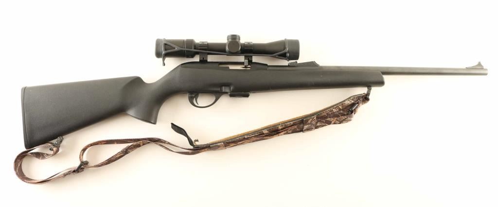 American made magazine fed semi-automatic sporting rifle chambered in .22 Magnum. Features a matte black finish, 20" barrel, ramped blade front sight with bead top, adjustable sidling rear sight(missing leaf), drilled & taped receiver with integral scope rail cuts, installed Weaver 2-7x 32mm scope, 8 round magazine, push button safety, smooth trigger, The Outdoor Connection padded camo Super Sling, and black synthetic pistol grip shoulder stock. Includes a Cabela's green canvas rifle soft case, two spare magazine and approximately 200 rounds of loose ammunition. Rifle exhibits approximately 95% of it's original finish showing light muzzle wear and scattered small losses on the receiver. Action is smooth, the bore is excellent and the synthetic stock is fine. Condition is NRA Very Good++. ***Modern Firearm***