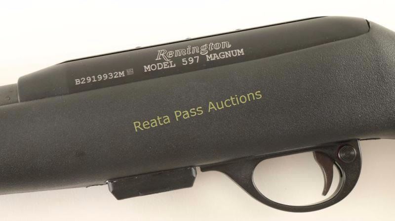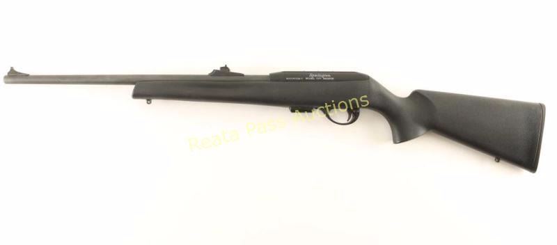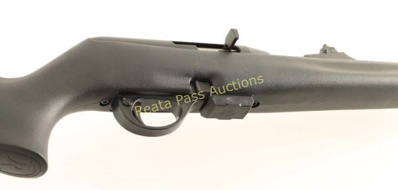 Magazine fed semi-automatic rifle chambered in .22 Winchester Magnum. Features a matte black finish, 20" barrel(missing barrel band), ramped blade front sight, adjustable sidling rear window sight, drilled & taped receiver with integral scope rail cuts, 10 round magazine, push button safety, smooth trigger, swivel studs and black synthetic pistol grip shoulder stock. Includes the original factory cardboard box with manual, lock and four spare magazines. Rifle exhibits little to no visible wear. Action is smooth, bore is excellent and stock is fine.