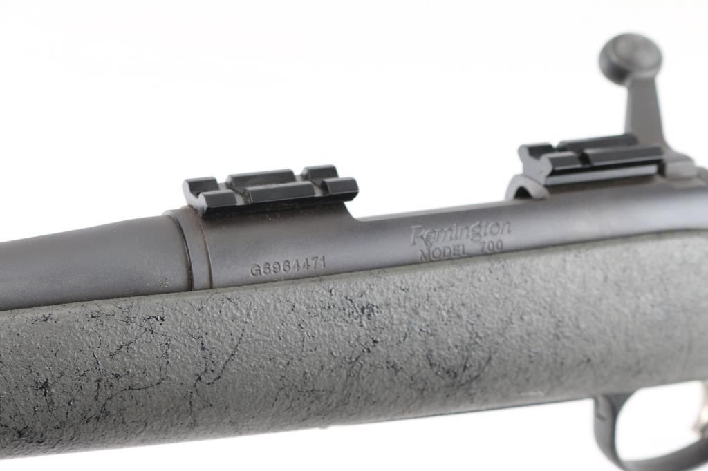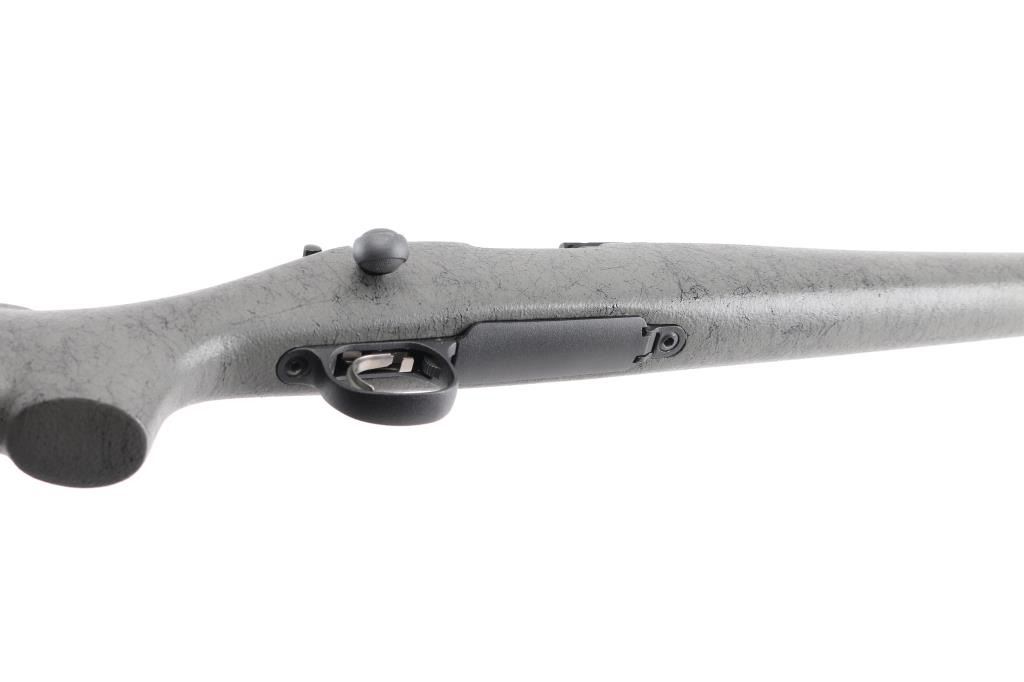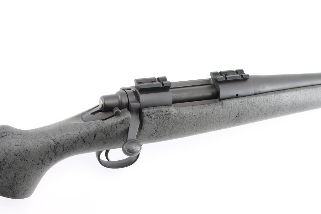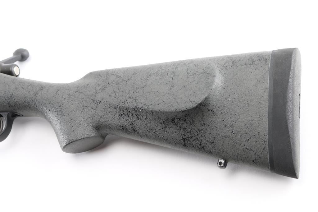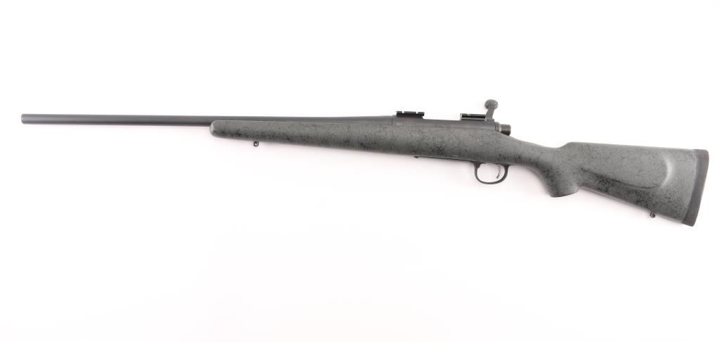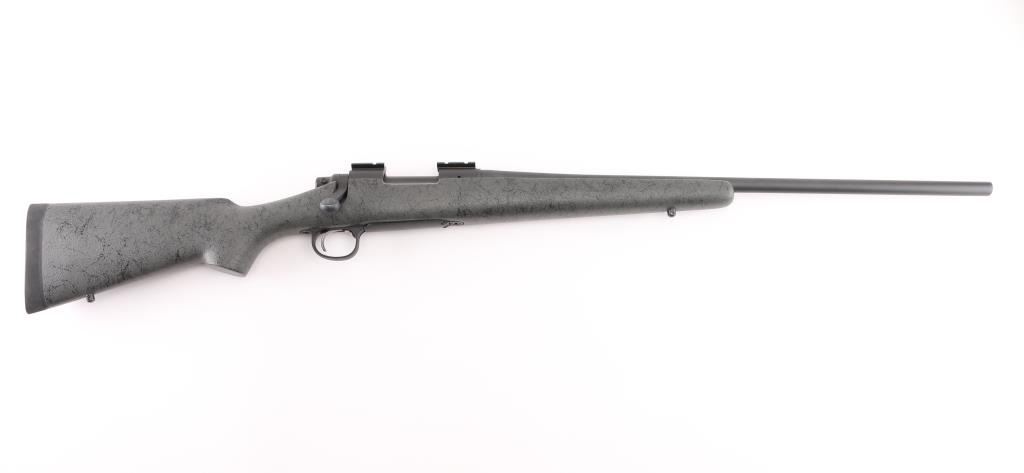 Optics ready. Scope rails installed on the receiver. Bolt action sporting rifle features parkerized steel construction, Bell & Carlson grey fiberglass stock with black spiderweb texture, 24" tapered barrel, hinged floorplate, manual safety, adjustable smooth Timney trigger, sling studs, solid rubber butt pad, bolt release forward of the trigger. Bore appears very good. needs cleaning. Metal finish is very good with few small blemishes. Stock is near perfect. NRA Condition-Very Good. Modern Firearm.