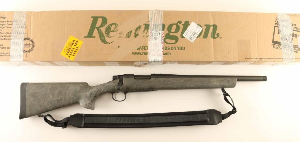 Rifle, bolt-action. Scout-style rifle. 16.5 " Threaded barrel. Matte-black finish. Green synthetic overmolded stock. Magazine fed. Receiver drilled/tapped for scope mount. Rubber recoil pad, and black nylon sling attached. Bore is excellent/bright. Action is smooth/tight. rifle is in like new condition. Comes in original Remington box. NRA Condition-Excellent. Modern Firearm.
