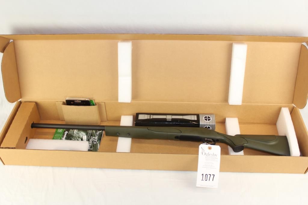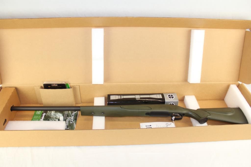 26" Barrel, Green Vented Beavertail Stock, Remington branded 4-12x40mm Scope included with Rings & Bases. NEW IN BOX!!!