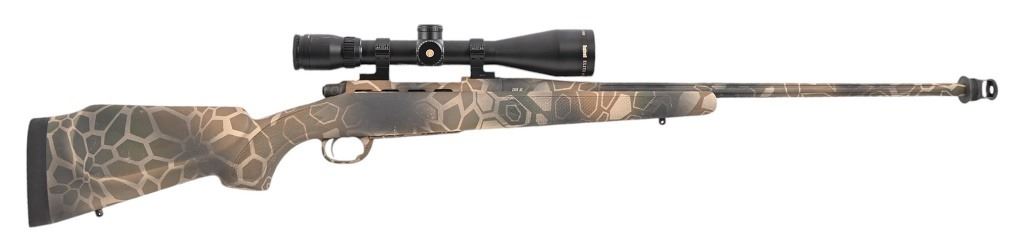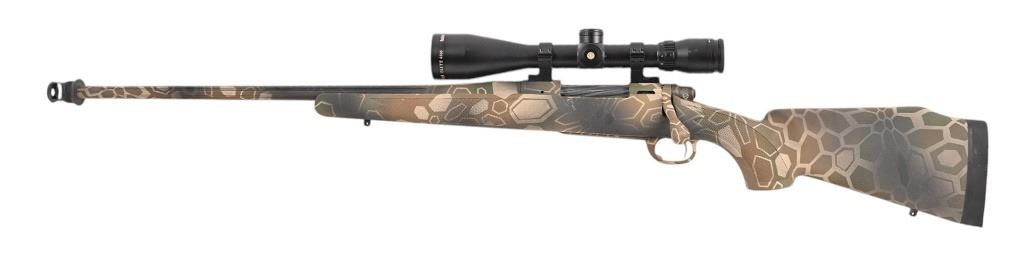 S/N E6310107. Left-handed rifle. Bushnell Elite 6500 scope, custom 24" threaded barrel with compensator, geometric camo composite stock. Very good condition rifle. Modern