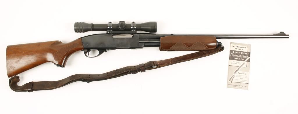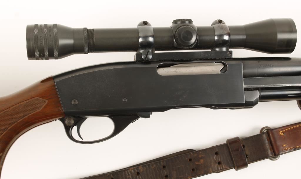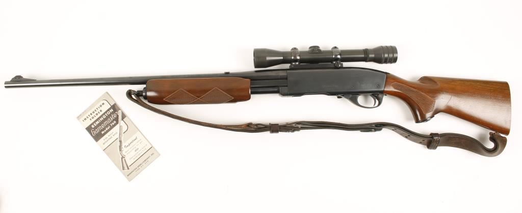 Slide-action high-caliber rifle with a blued 21-3/4" barrel. Bore is cloudy with good rifling. No rear sight. Bluing is at 90-95%. Checkered walnut stock and slide have several dings and scratches, as well as missing its butt plate. Action is in Very good working order. No magazine, but comes with Kollmorgen Optics 4x scope, original Instructions folder, and leather sling. Overall, is in Good condition. Modern FIrearm