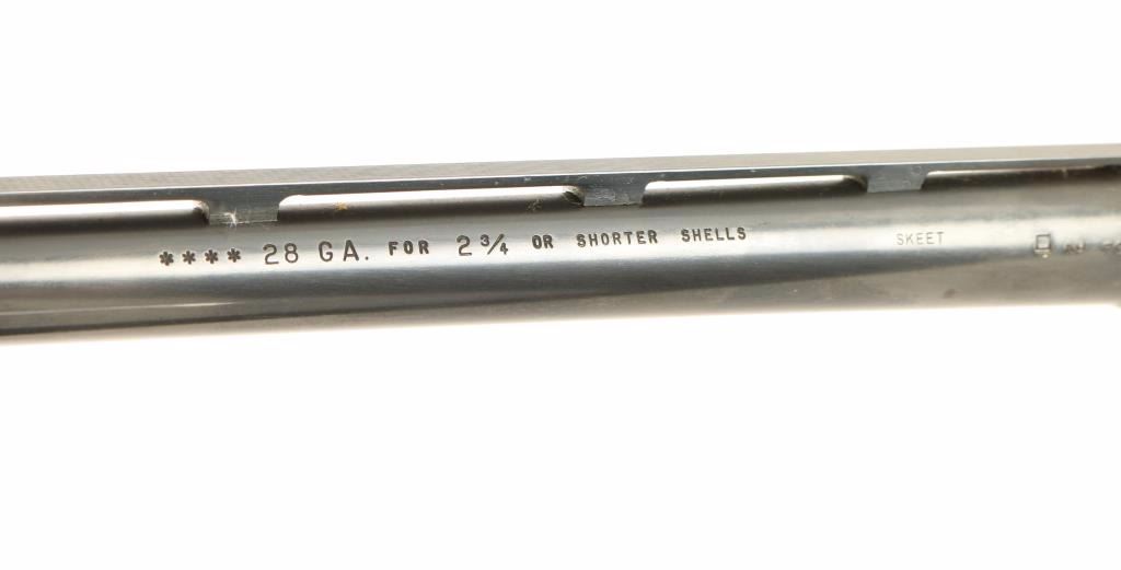 Blued 25 1/8" vent rib skeet choked barrel chambered for 2 3/4" 28 gauge shells, with a white bead front sight, and silver rear bead. KU or KO production code. Condition is very good.