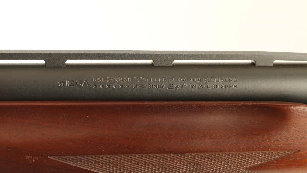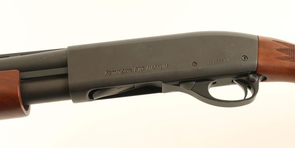 pump action shotgun takes 2-3/4 and 3" shells. Features 26" ventilated rib barrel, pewter color front bead, accepts interchangeable choke tubes, manual safety, sling swivel studs, checkering are wrist and pump handle, ventilated recoil pad. Bore is excellent. Metal retains over 95% satin grayish blue. Wood is excellent condition, with a low luster finish. Receiver marked "SPECIAL PURPOSE" on right side. Provided Remington choke tubes: Skeet (installed), MOD, FULL, IMP CYL. Additional 22" vent rib barrel is included (excellent bore) with front and mid beads, Lyman Cutts Compensator external choke installed, and the following chokes: SPR, 2 LR, FC, and an adjustable screw choke (open - full). Additional barrel in very good condition. Also includes green plastic Remington case, choke wrench for internal chokes, camo padded sling with detachable swivels. Condition is NRA Excellent *** Modern Firearm ***
